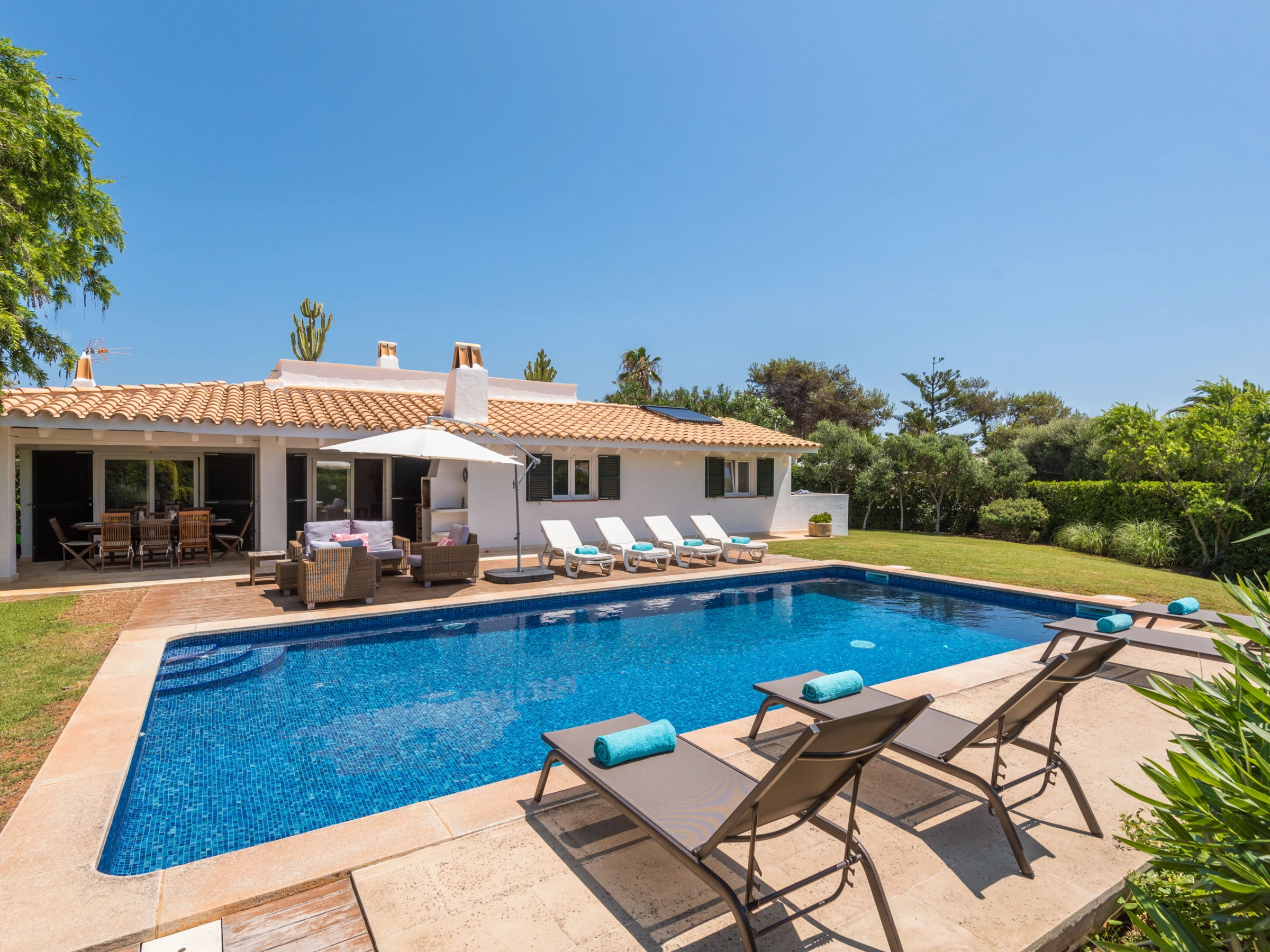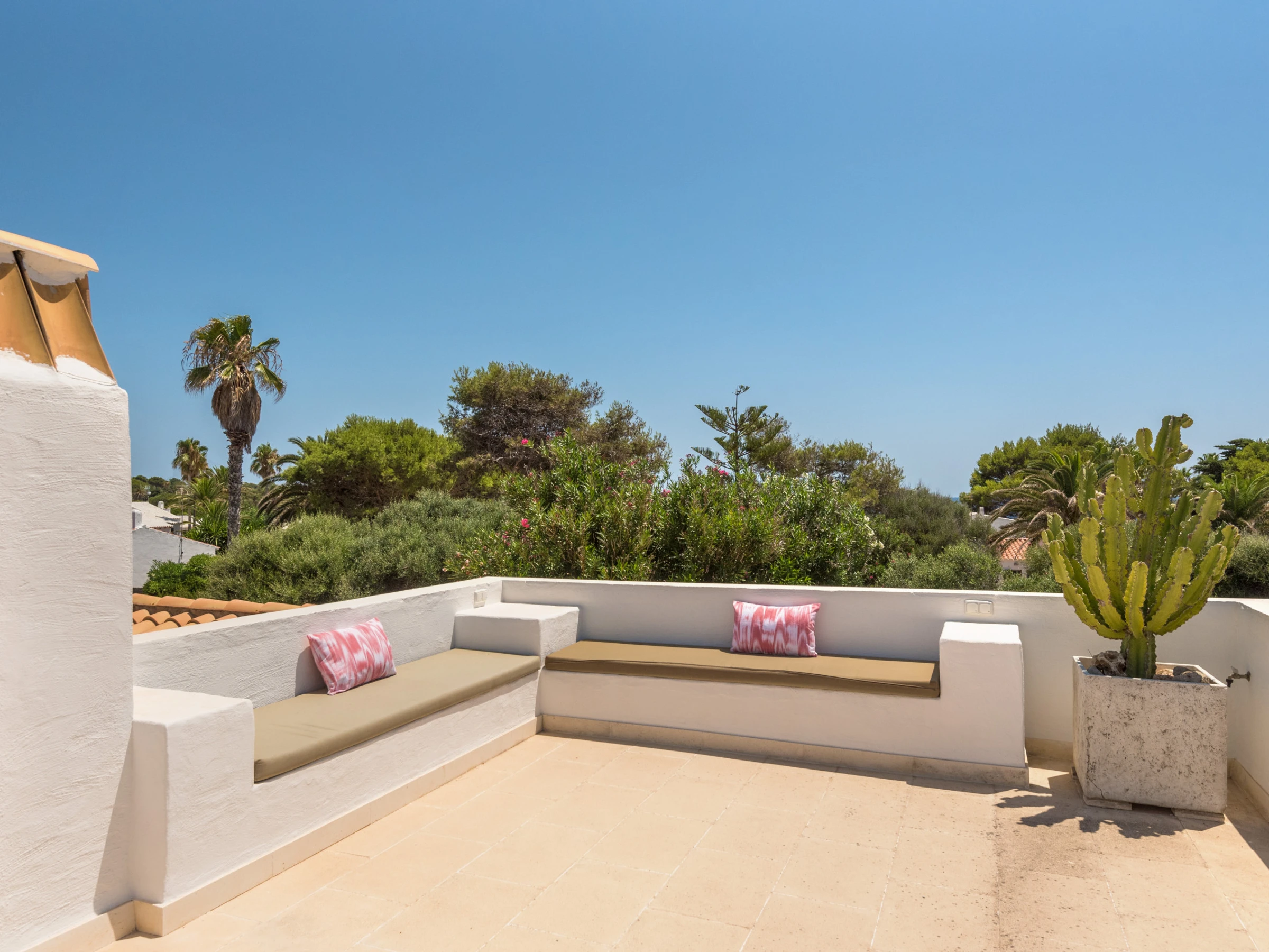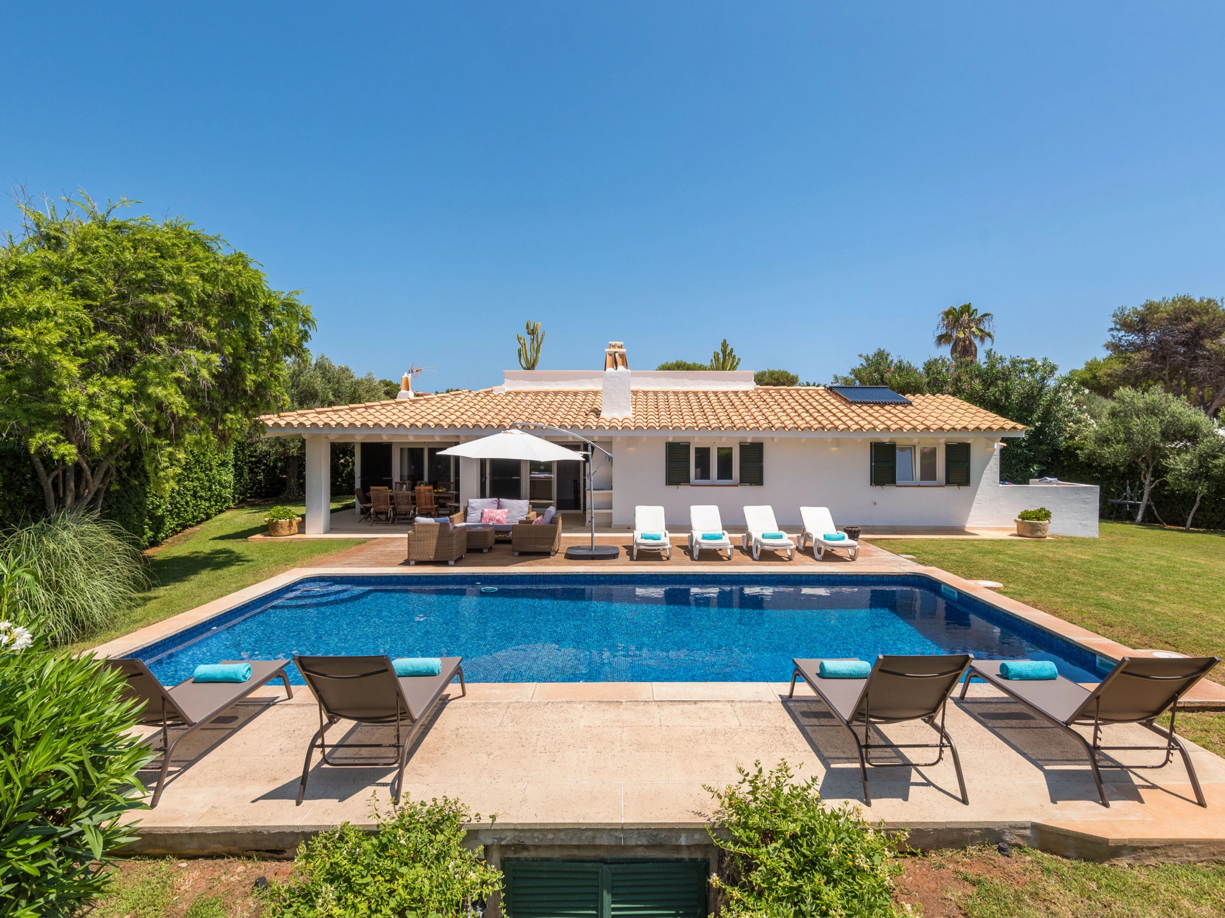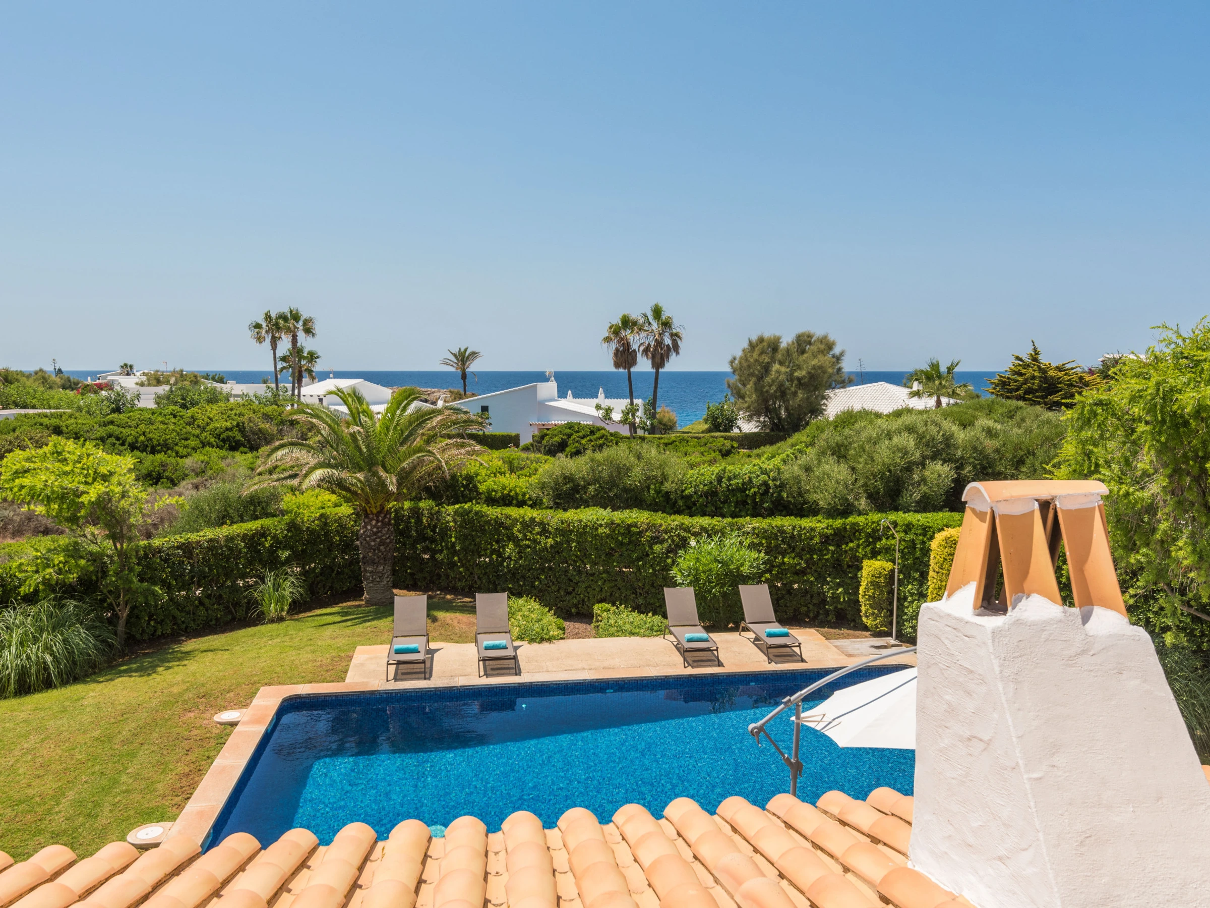 ¡La alegría de vivir! Villa Sirena te da muchas posibilidades y múltiples espacios para vivir tu estancia en Menorca al máximo, habrá varias opciones para cada miembro de la familia, cada uno del grupo podrá encontrar su sitio favorito: el fantástico jardín de más de 1000 metros cuadrados, como ya quedan pocos, con su verde césped, sus setos, flores y árboles, para los adultos un símbolo del descanso en intimidad, para los pequeños de la familia mucho espacio para corretear a gusto y con total seguridad; la terraza solárium, una parte en elegante madera, la otra embaldosada, con sus tumbonas e incluso con sofá y mesa para tomar un aperitivo; la generosa piscina, no sólo para el chapuzón que te refresca después de tomar el sol o al regresar de un día entero en la playa, sino suficientemente grande para nadar y jugar toda la familia; muy extraordinaria la fantástica terraza en la azotea, con ambiente chill-out, cama balinesa y vista mar, para que respires este aire especial, sientas el lujo de la libertad, sea de noche o de día; la espaciosa terraza cubierta, con una mesa para hasta 10 ó 12 comensales para desayunar, almorzar y cenar allí, y que cobija una barbacoa de obra con chimenea, para los verdaderos amantes de la barbacoa, apta para usarla con cualquier tiempo, haga un sol de justicia o llueva.