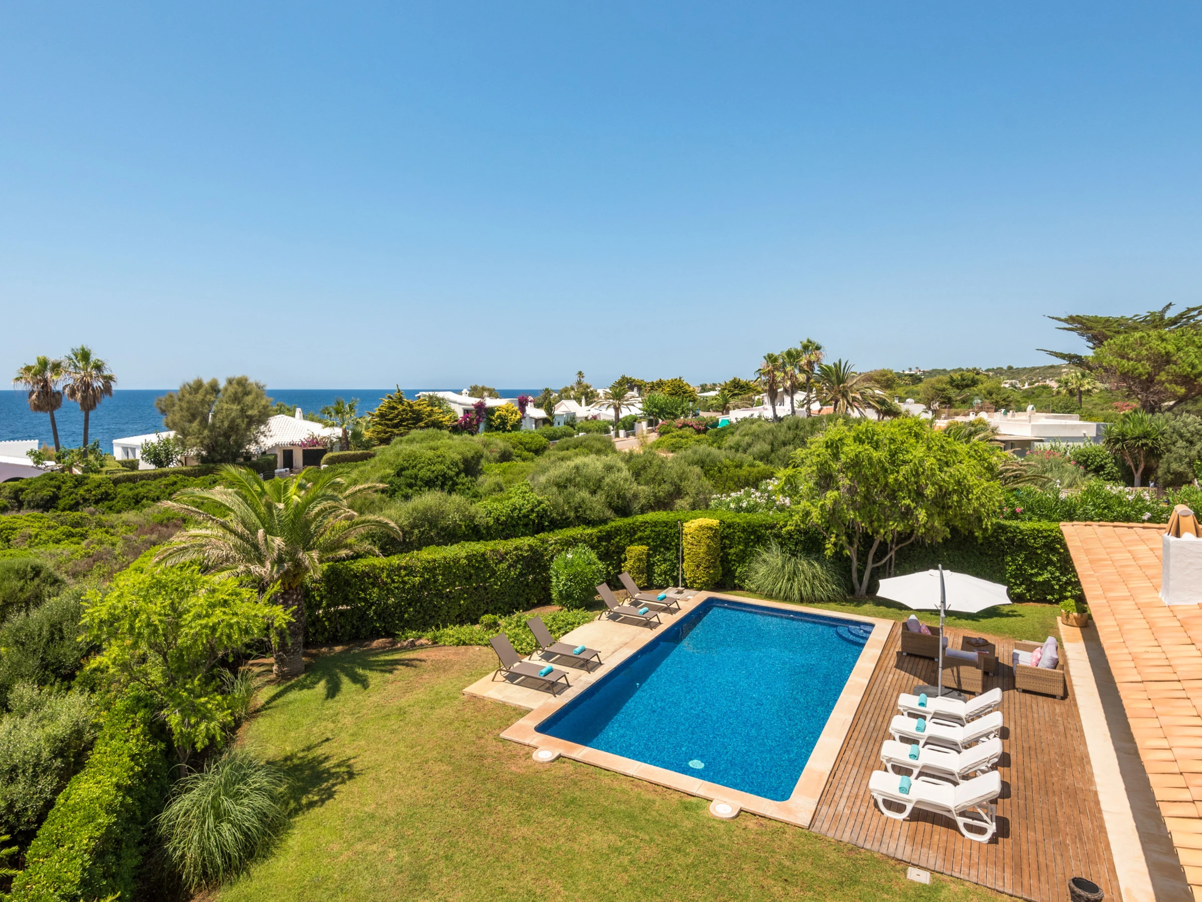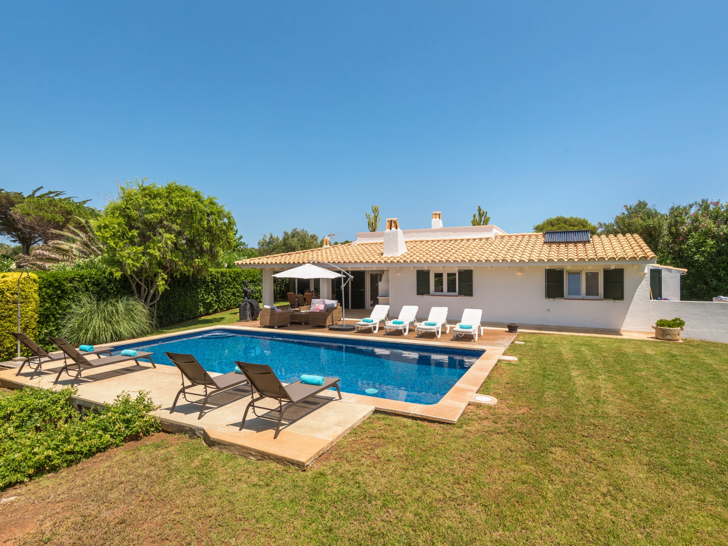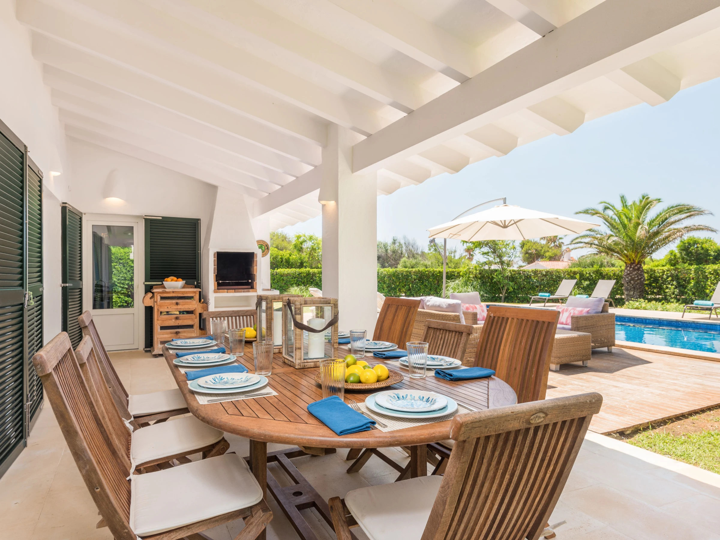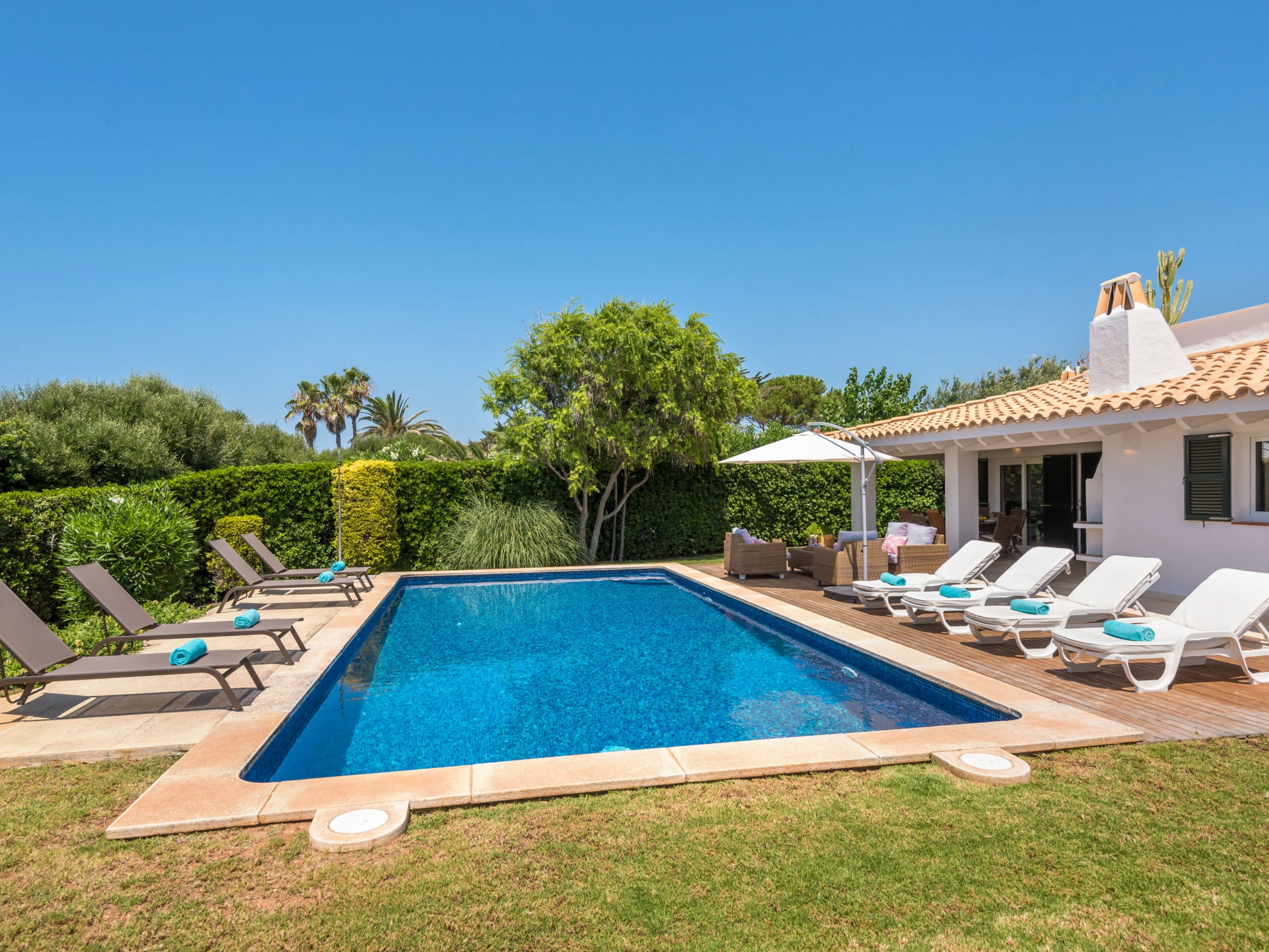 ¡La alegría de vivir! Villa Sirena te da muchas posibilidades y múltiples espacios para vivir tu estancia en Menorca al máximo, habrá varias opciones para cada miembro de la familia, cada uno del grupo podrá encontrar su sitio favorito: el fantástico jardín de más de 1000 metros cuadrados, como ya quedan pocos, con su verde césped, sus setos, flores y árboles, para los adultos un símbolo del descanso en intimidad, para los pequeños de la familia mucho espacio para corretear a gusto y con total seguridad; la terraza solárium, una parte en elegante madera, la otra embaldosada, con sus tumbonas e incluso con sofá y mesa para tomar un aperitivo; la generosa piscina, no sólo para el chapuzón que te refresca después de tomar el sol o al regresar de un día entero en la playa, sino suficientemente grande para nadar y jugar toda la familia; muy extraordinaria la fantástica terraza en la azotea, con ambiente chill-out, cama balinesa y vista mar, para que respires este aire especial, sientas el lujo de la libertad, sea de noche o de día; la espaciosa terraza cubierta, con una mesa para hasta 10 ó 12 comensales para desayunar, almorzar y cenar allí, y que cobija una barbacoa de obra con chimenea, para los verdaderos amantes de la barbacoa, apta para usarla con cualquier tiempo, haga un sol de justicia o llueva.