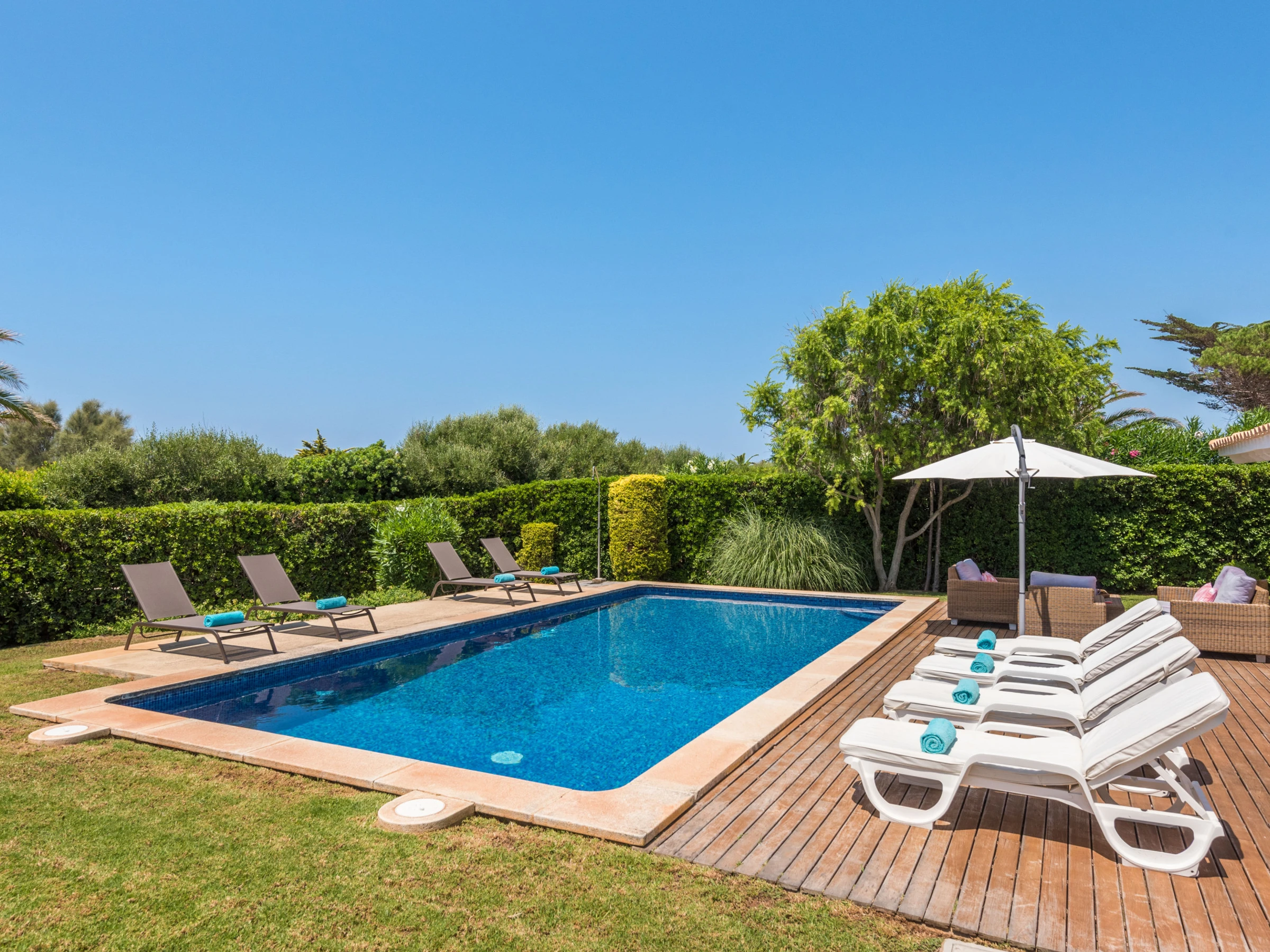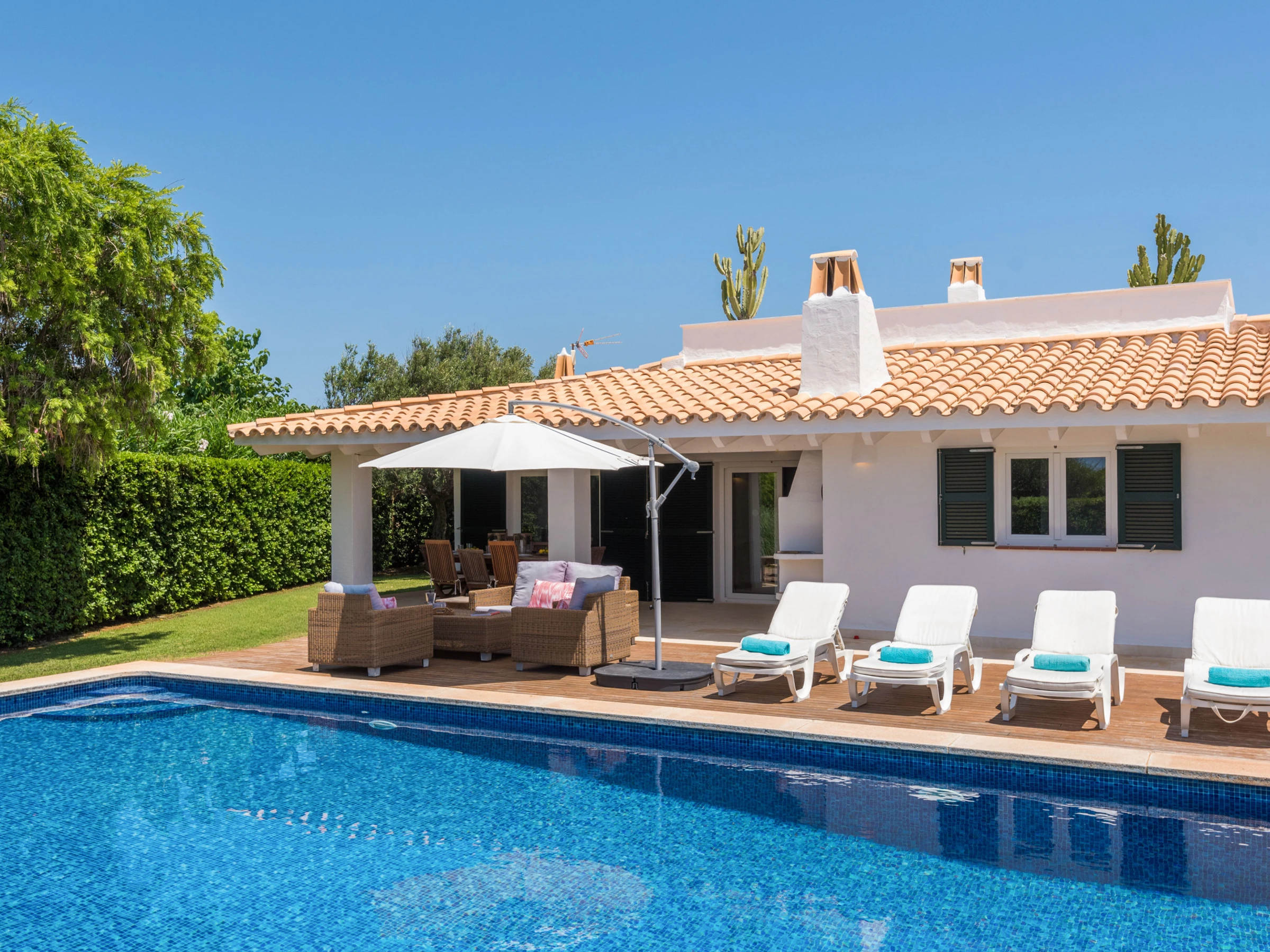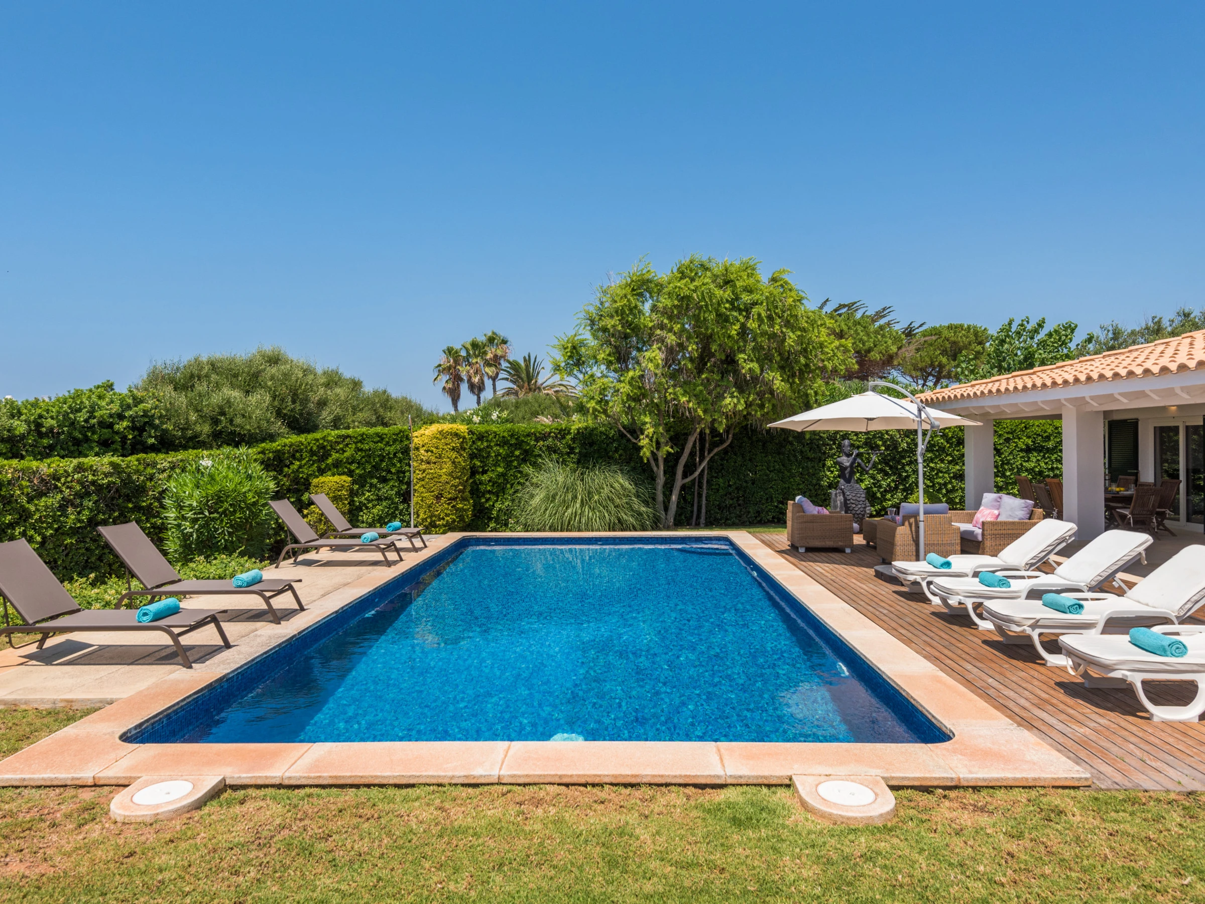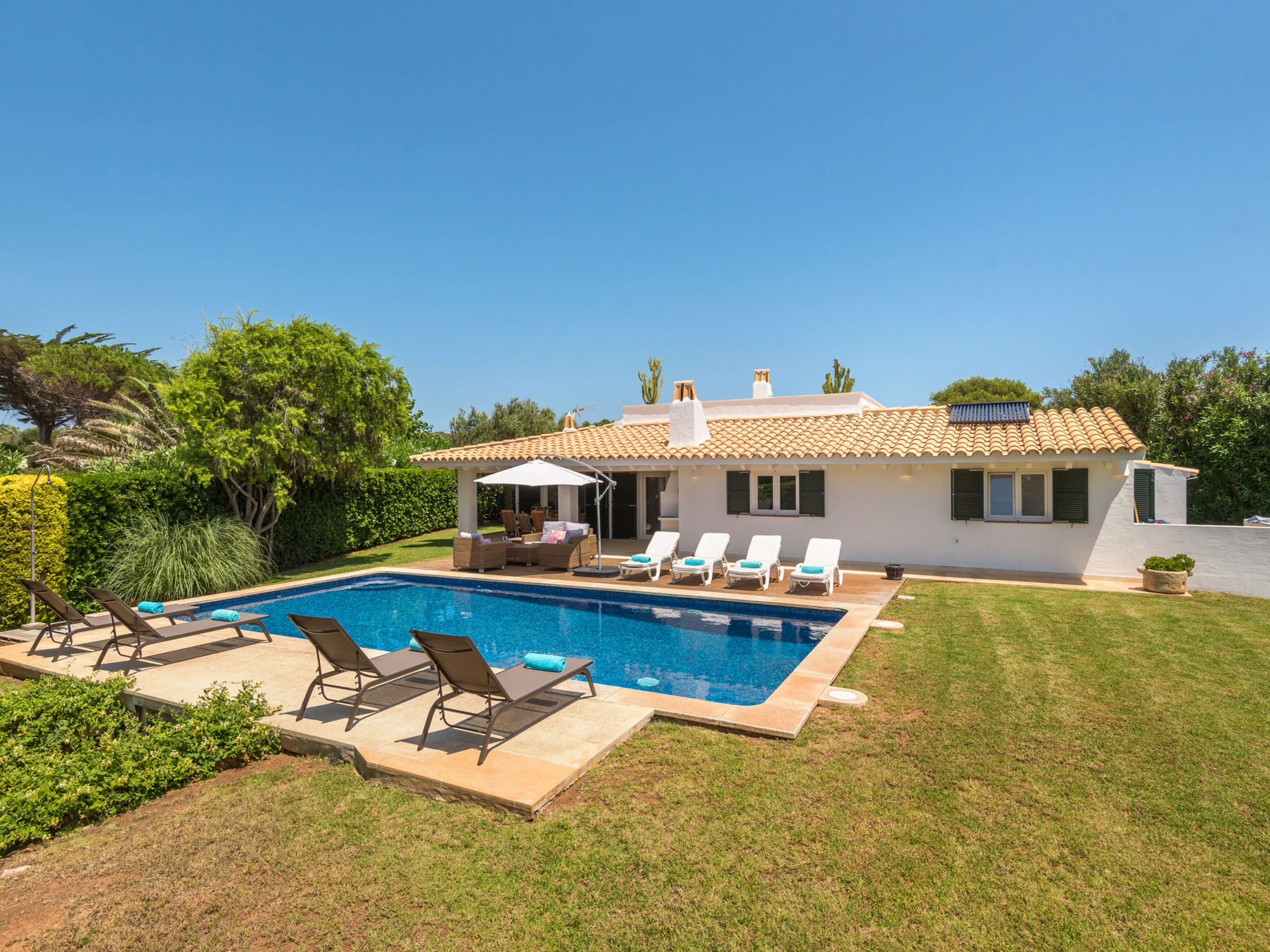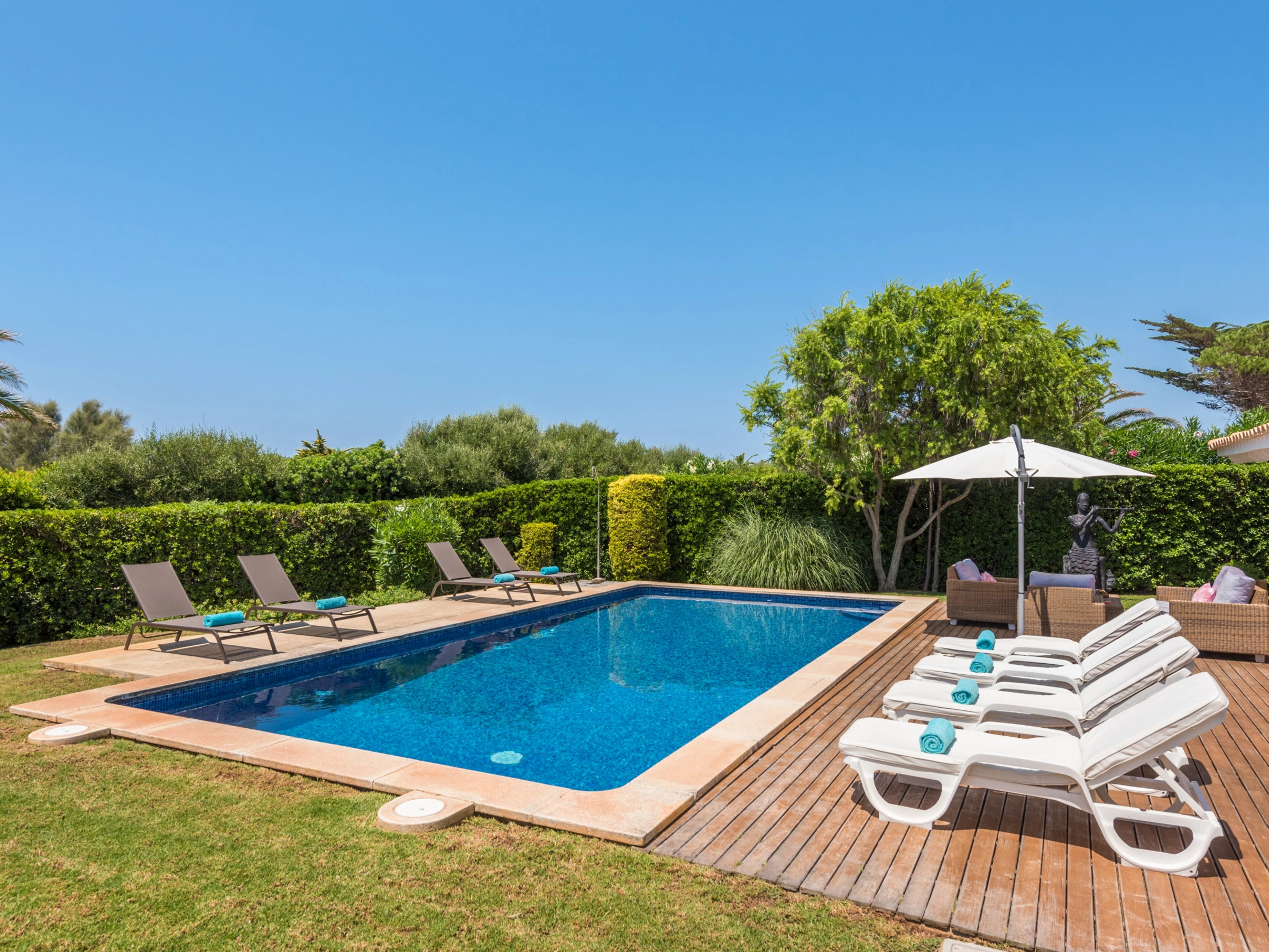 ¡La alegría de vivir! Villa Sirena te da muchas posibilidades y múltiples espacios para vivir tu estancia en Menorca al máximo, habrá varias opciones para cada miembro de la familia, cada uno del grupo podrá encontrar su sitio favorito: el fantástico jardín de más de 1000 metros cuadrados, como ya quedan pocos, con su verde césped, sus setos, flores y árboles, para los adultos un símbolo del descanso en intimidad, para los pequeños de la familia mucho espacio para corretear a gusto y con total seguridad; la terraza solárium, una parte en elegante madera, la otra embaldosada, con sus tumbonas e incluso con sofá y mesa para tomar un aperitivo; la generosa piscina, no sólo para el chapuzón que te refresca después de tomar el sol o al regresar de un día entero en la playa, sino suficientemente grande para nadar y jugar toda la familia; muy extraordinaria la fantástica terraza en la azotea, con ambiente chill-out, cama balinesa y vista mar, para que respires este aire especial, sientas el lujo de la libertad, sea de noche o de día; la espaciosa terraza cubierta, con una mesa para hasta 10 ó 12 comensales para desayunar, almorzar y cenar allí, y que cobija una barbacoa de obra con chimenea, para los verdaderos amantes de la barbacoa, apta para usarla con cualquier tiempo, haga un sol de justicia o llueva.