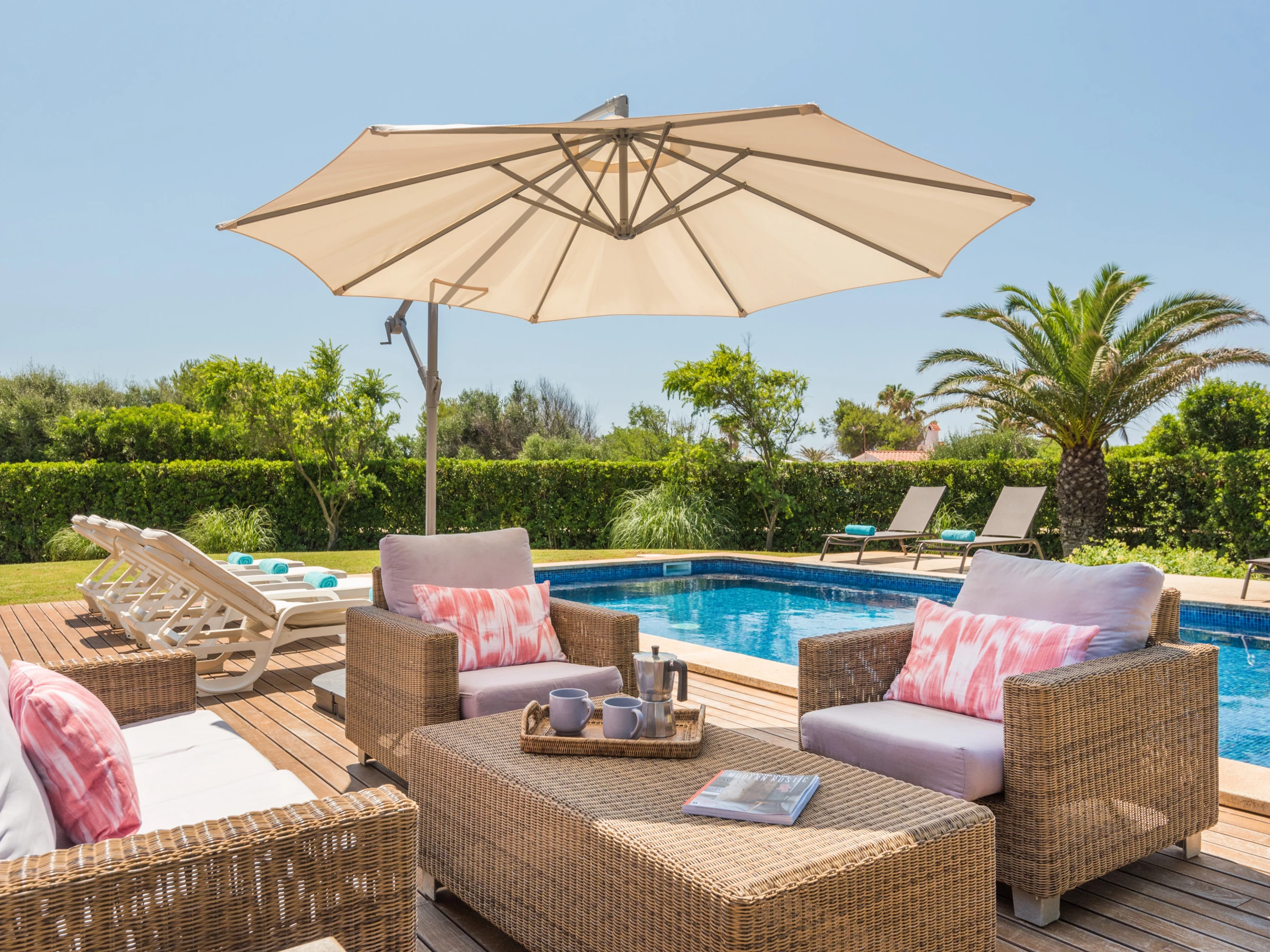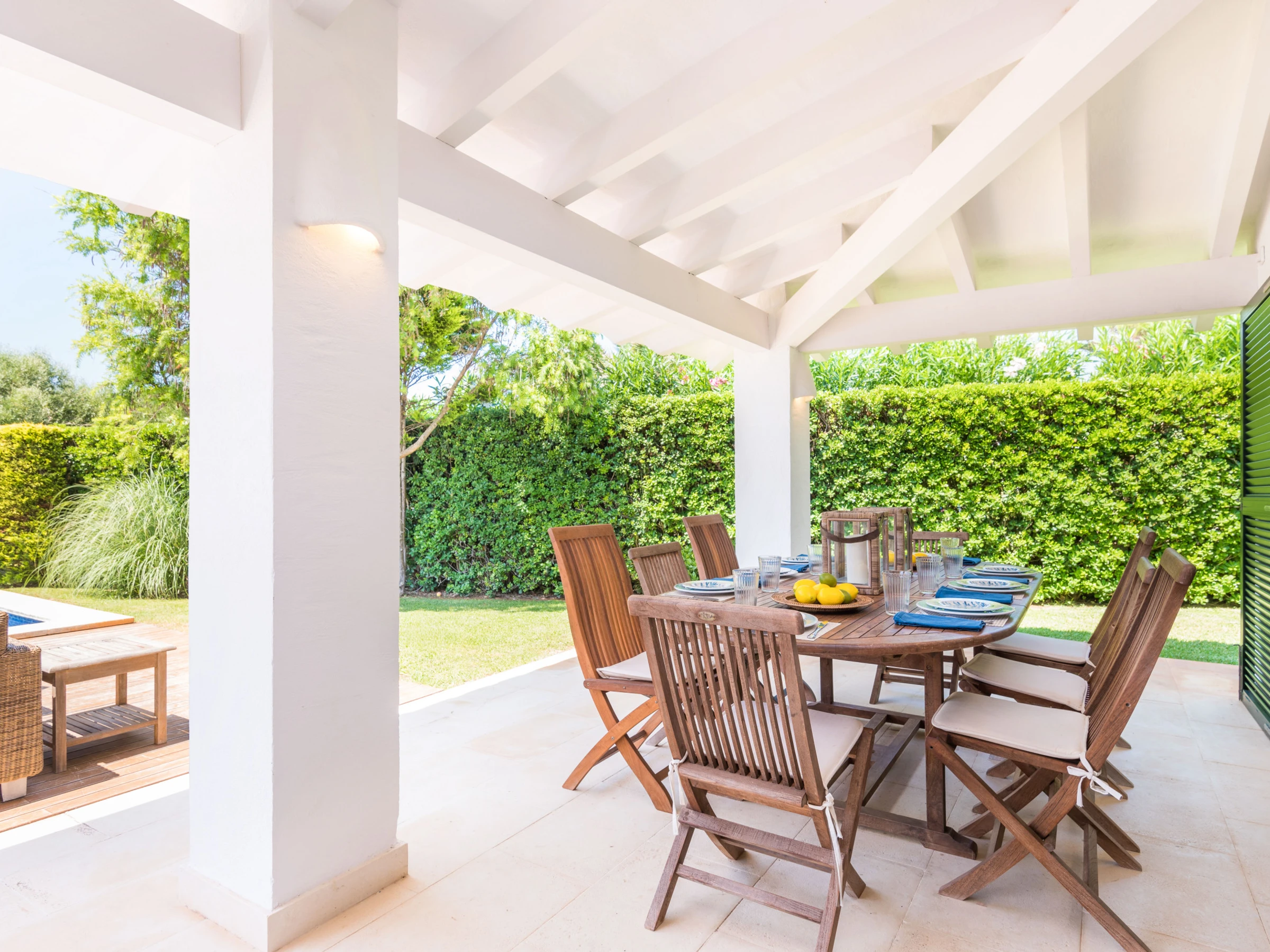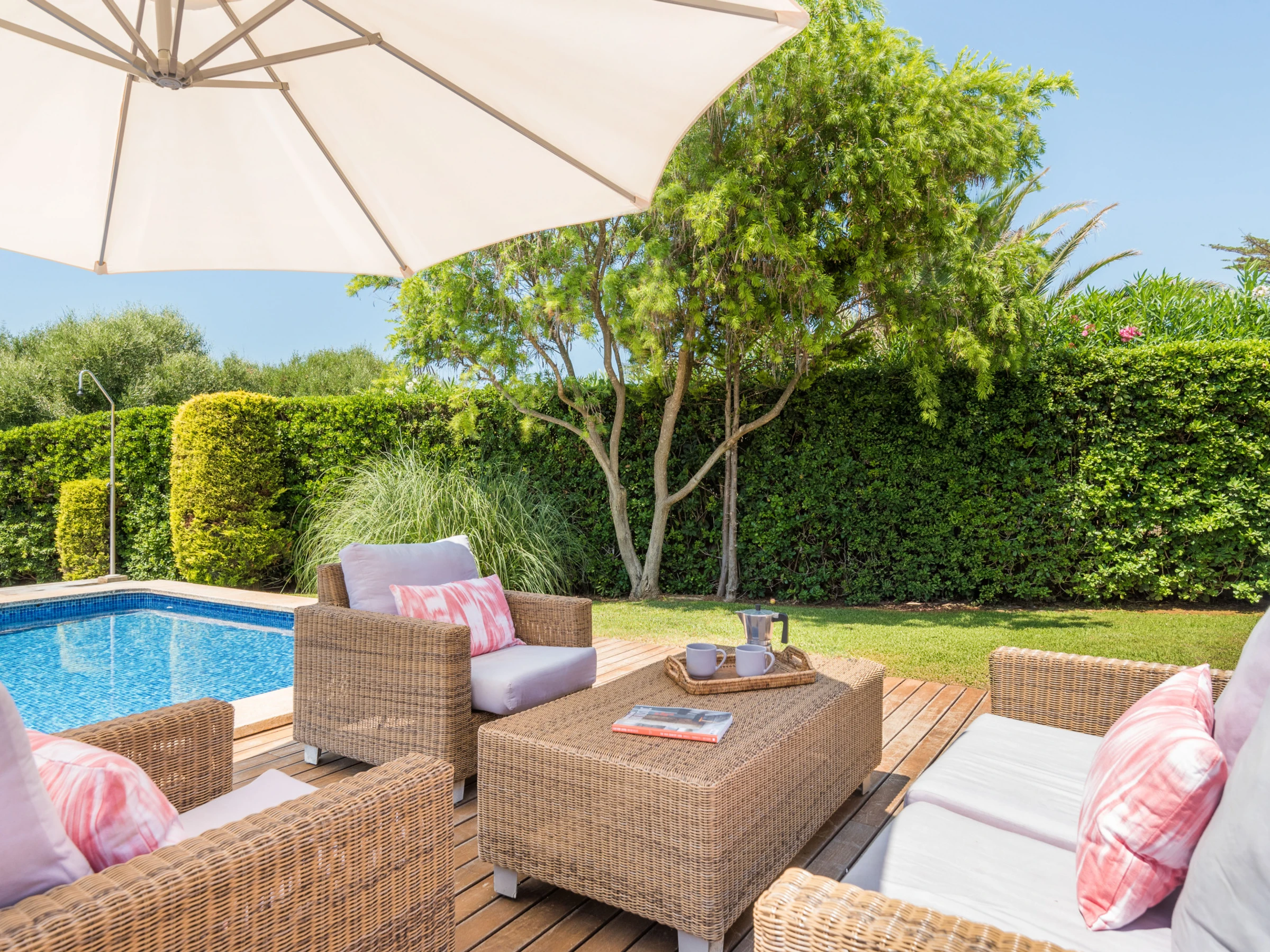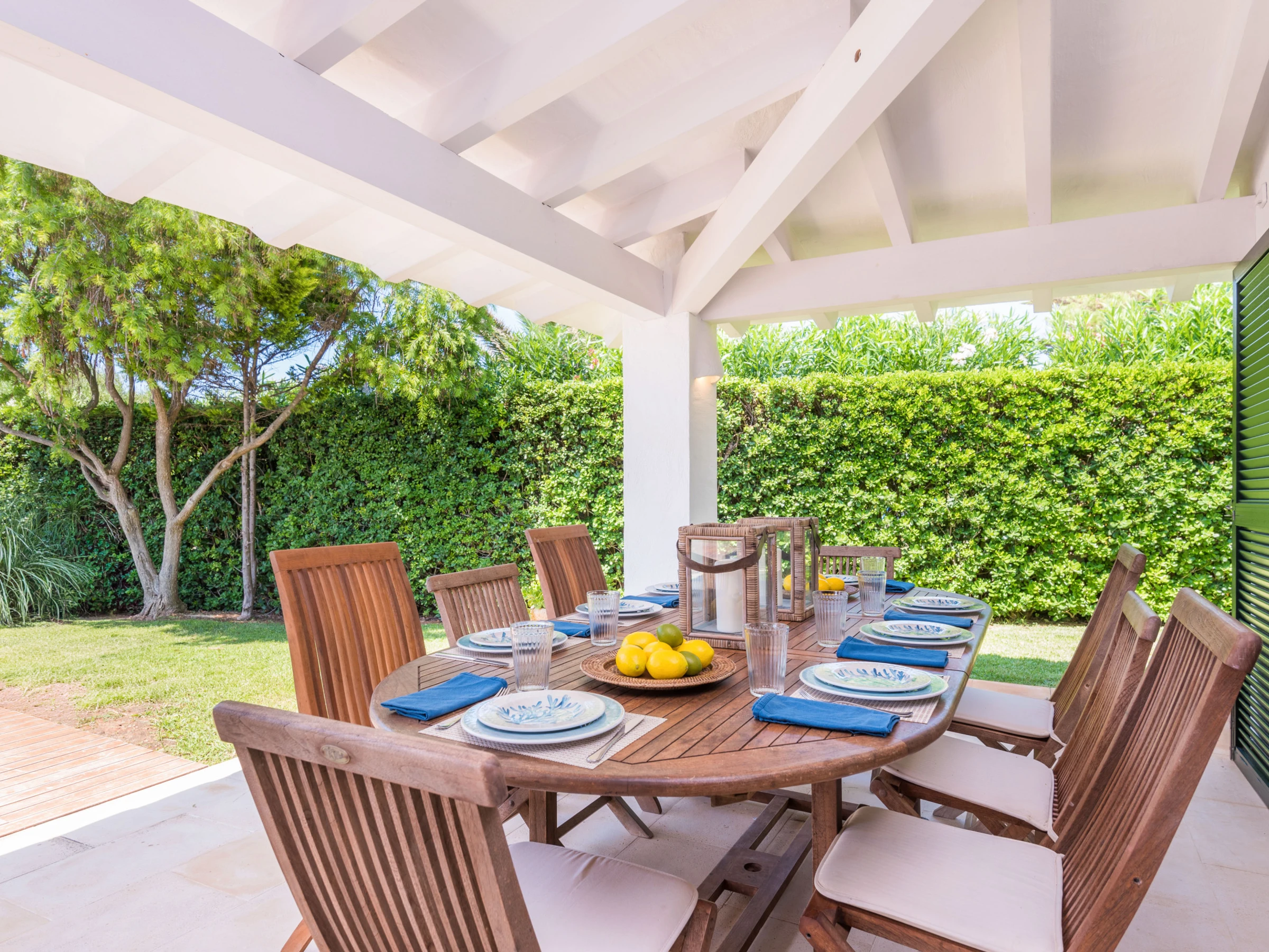 ¡La alegría de vivir! Villa Sirena te da muchas posibilidades y múltiples espacios para vivir tu estancia en Menorca al máximo, habrá varias opciones para cada miembro de la familia, cada uno del grupo podrá encontrar su sitio favorito: el fantástico jardín de más de 1000 metros cuadrados, como ya quedan pocos, con su verde césped, sus setos, flores y árboles, para los adultos un símbolo del descanso en intimidad, para los pequeños de la familia mucho espacio para corretear a gusto y con total seguridad; la terraza solárium, una parte en elegante madera, la otra embaldosada, con sus tumbonas e incluso con sofá y mesa para tomar un aperitivo; la generosa piscina, no sólo para el chapuzón que te refresca después de tomar el sol o al regresar de un día entero en la playa, sino suficientemente grande para nadar y jugar toda la familia; muy extraordinaria la fantástica terraza en la azotea, con ambiente chill-out, cama balinesa y vista mar, para que respires este aire especial, sientas el lujo de la libertad, sea de noche o de día; la espaciosa terraza cubierta, con una mesa para hasta 10 ó 12 comensales para desayunar, almorzar y cenar allí, y que cobija una barbacoa de obra con chimenea, para los verdaderos amantes de la barbacoa, apta para usarla con cualquier tiempo, haga un sol de justicia o llueva.