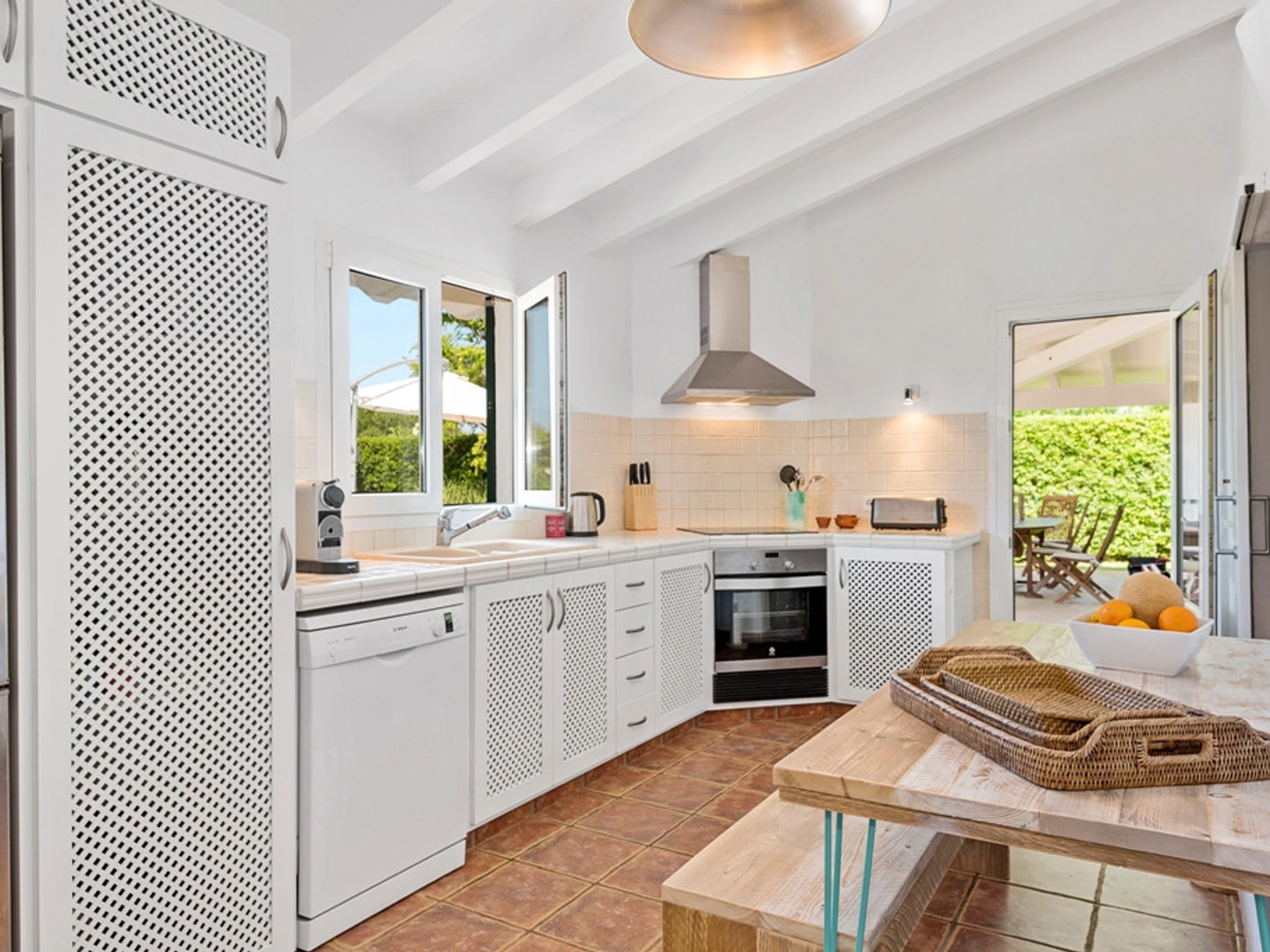 Y hasta aquí sólo hemos hablado de la parte exterior. El elemento de conexión entre exterior e interior es la cocina, con mucho sentido práctico forma un acceso directo entre ambas áreas, en un acabado fantástico, totalmente equipada. Así es fácil servir cualquier comida o bebida en el jardín.