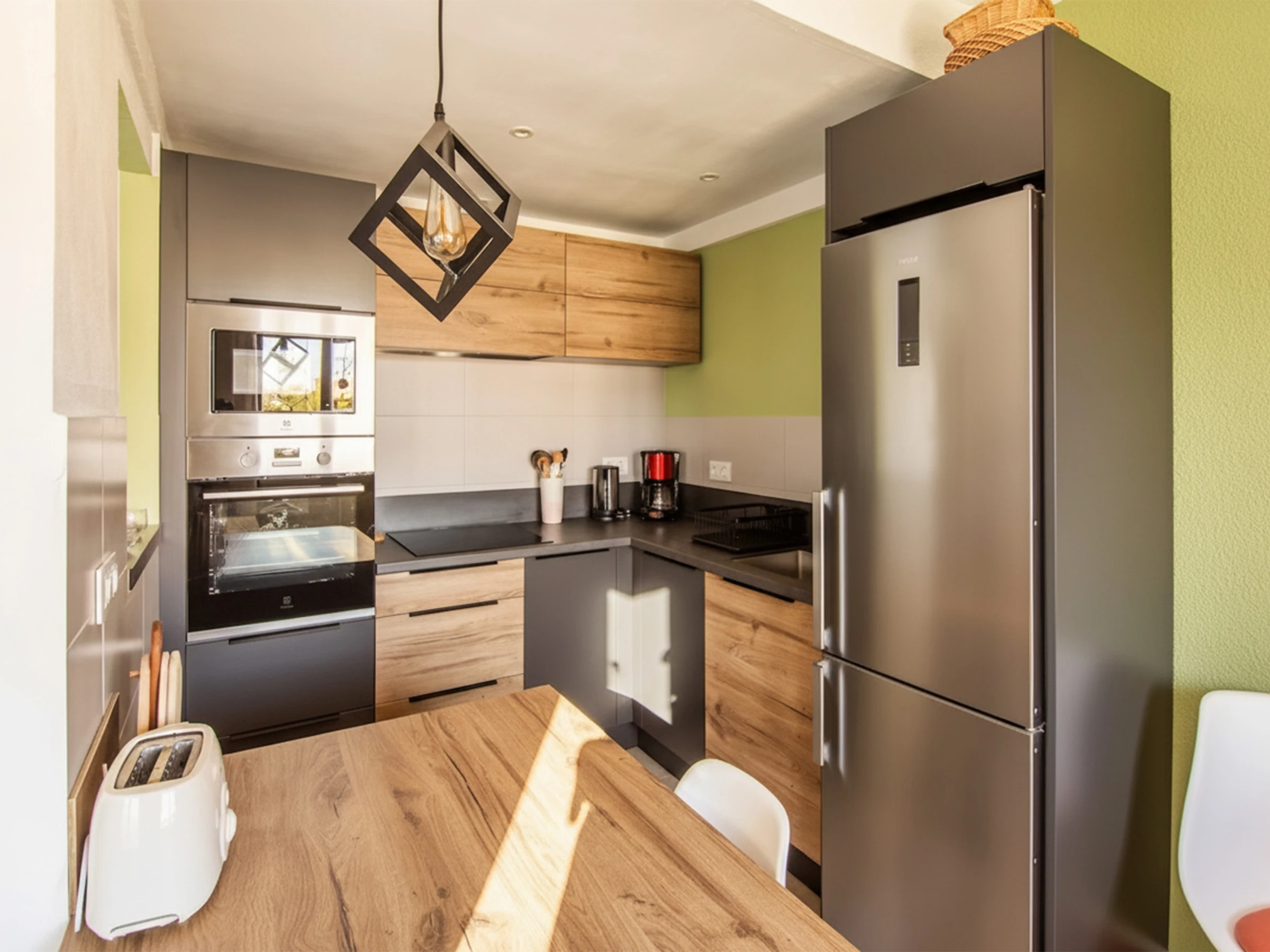 La casa está situada en una zona residencial cercana a la naturaleza y ofrece un lugar relajante donde descansar tras un día de aventuras. La vivienda, de 62 m², cuenta con un luminoso salón, una cómoda zona de estar, un comedor y una moderna cocina abierta equipada con frigorífico, lavavajillas, microondas, horno y todos los utensilios esenciales. Los dos dormitorios la hacen perfecta para una familia pequeña.