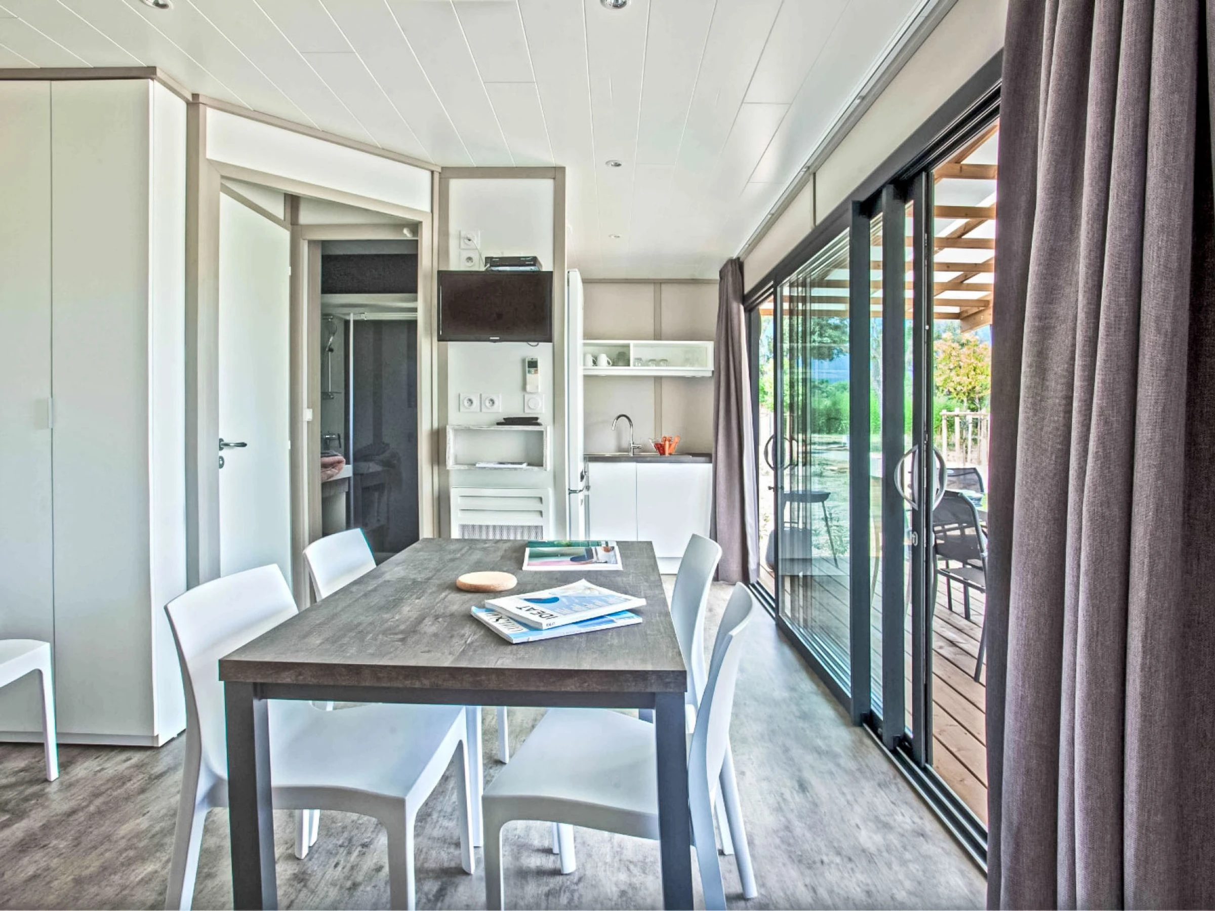 "Lodge Natura 4p", chalet de madera 3 estancias 37 m2. Con mobiliario confortable: salón-comedor con mesa de comedor y TV (pantalla plana), aire acondicionado. Salida a la terraza. 1 dorm. con 1 cama de matrimonio (160 cm, 200 cm de longitud). 1 dorm. con 2 camas (90 cm, 190 cm de longitud). Rincón-cocina (horno, lavavajillas, 3 Placas de inducción, tostadora, hervidor de agua eléctrico, microondas, cafetera eléctrica). Ducha, WC separado. Calefacción eléctrica. Terraza parcialmente cubierta, jardín pequeño. Muebles de terraza, barbacoa (portátil). El alojamiento dispone de: trona, cuna (extra), secador de pelo. Internet (Wifi, gratis). Plaza de aparcamiento (vallada). A tener en cuenta: apartamento para no fumadores. Detector de humo. Oferta de un propietario comercial según el art. 155, IV, CGI