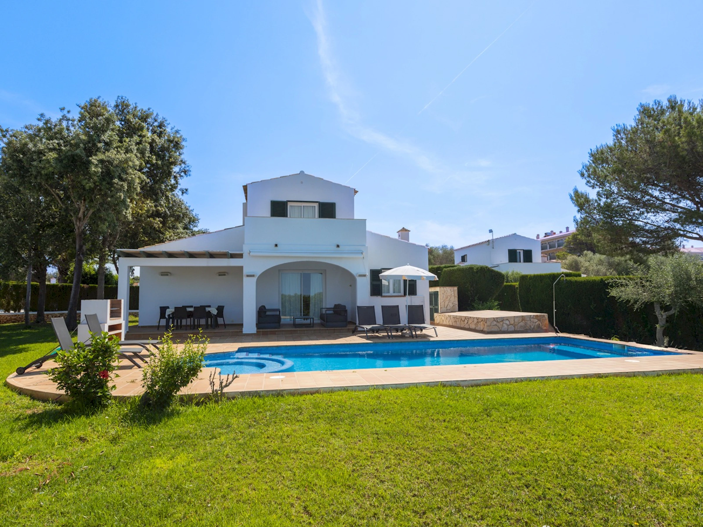 Descubra nuestro exclusivo resort con 7 amplias villas privadas en Menorca. Cada villa tiene 3 dormitorios, 3 baños y una refrescante piscina privada, todo en un entorno tranquilo y relajante, con un elegante estilo minoritario y una arquitectura moderna. Pase unas vacaciones inolvidables en un ambiente totalmente equipado con muebles refinados y de diseño. Nuestras villas Finesse están ubicadas en la cima de la colina de Torre Soli y ofrecen impresionantes vistas del pintoresco campo de Menorca y del mar Mediterráneo. Estas espaciosas villas de dos pisos pueden alojar hasta 6 personas y ofrecen comodidad y privacidad. En el interior, cada villa dispone de un amplio salón decorado con muebles rústicos de madera de cerezo, equipado con SMART TV y conexión WiFi. Una cocina totalmente equipada y un acogedor comedor con una sencilla mesa de cristal y sillas modernas harán que cada velada sea especial. Relájese en la suite principal de arriba con terraza privada, decorada en colores mediterráneos con toques modernos. Disfruta de la comodidad de una cama XXL, un armario y un baño totalmente equipado con bañera. En la planta baja se encuentra el segundo dormitorio, decorado en tonos blancos que desprenden energía y personalidad. Dispone de baño privado totalmente equipado con ducha de hidromasaje. El tercer dormitorio está decorado en blanco con detalles en naranja y verde y es una opción ideal para los niños más pequeños. Además, la villa dispone de un segundo baño totalmente equipado con ducha de hidromasaje. El exterior es simplemente espectacular. La amplia terraza cubierta con una gran mesa y cómodos sillones es el lugar ideal para comidas y atardeceres inolvidables. La piscina privada de 40 metros cuadrados con jacuzzi se convierte en un lugar de encuentro para la diversión familiar. Relájese en las tumbonas o siéntese bajo una sombrilla y disfrute del sol del Mediterráneo. Además de la piscina y la terraza cubierta, tiene acceso a una bonita barbacoa de obra. El extenso jardín que rodea la casa con césped, flores, arbustos autóctonos y cipreses crea una atmósfera íntima y tranquila. ¡No esperes más y vive esta aventura única en Menorca! Si te alojas en nuestro resort privado Villas Finesse, te recomendamos alquilar un coche para aprovechar al máximo las ofertas adicionales de la zona de Son Bou.