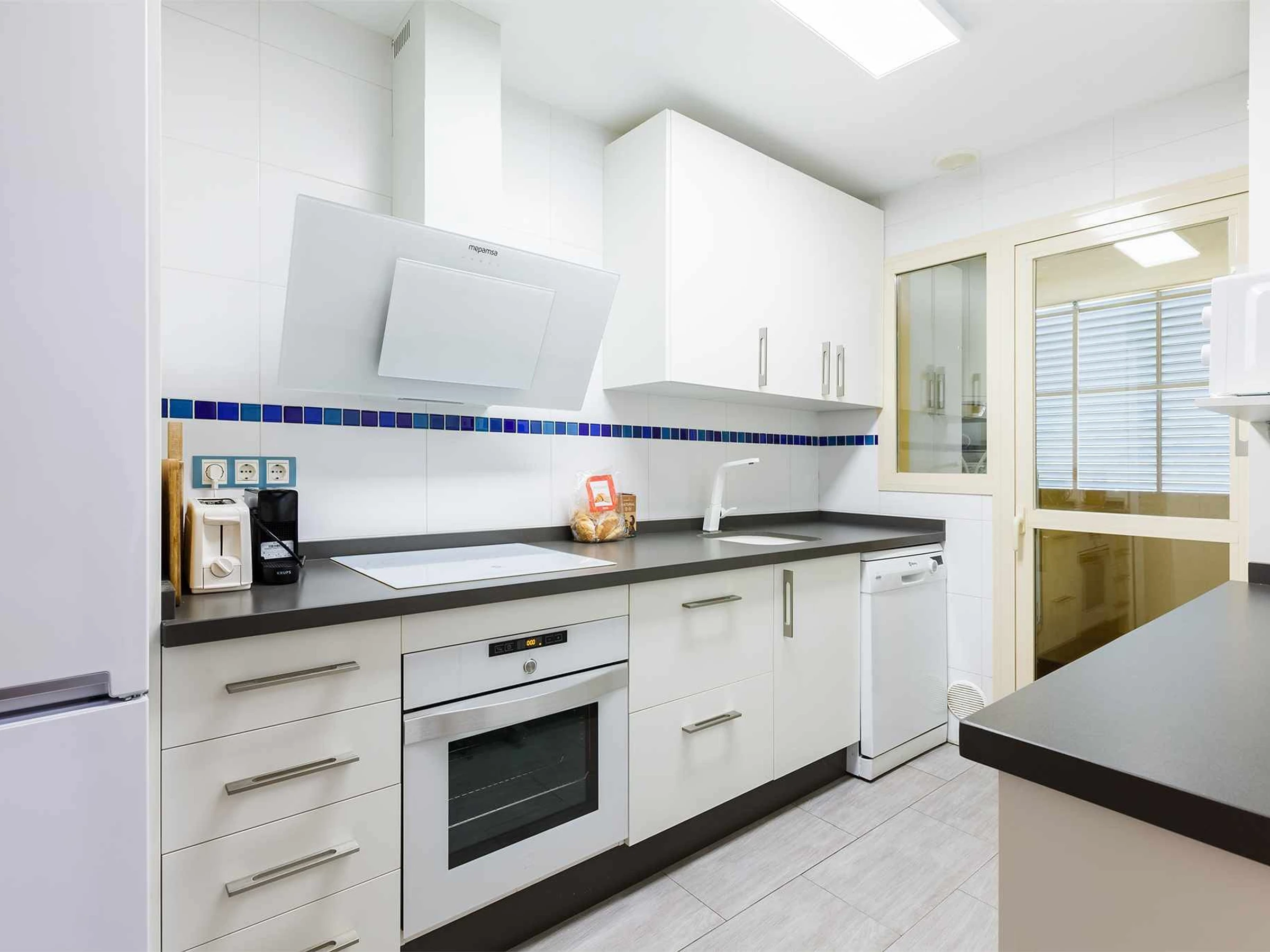La cocina independiente está completamente equipada, con electrodomésticos y utensilios necesarios para preparar comidas durante tu estancia.
