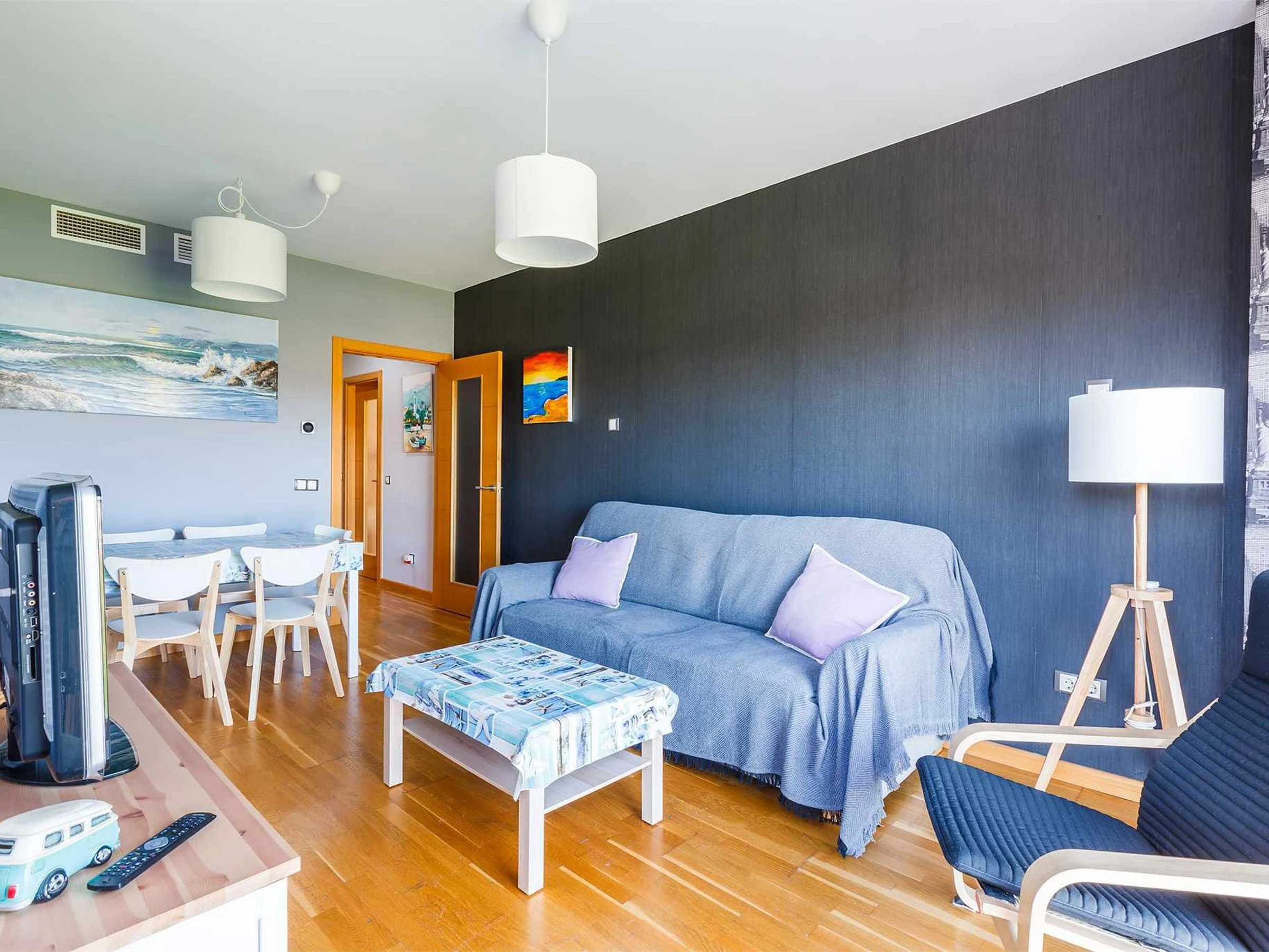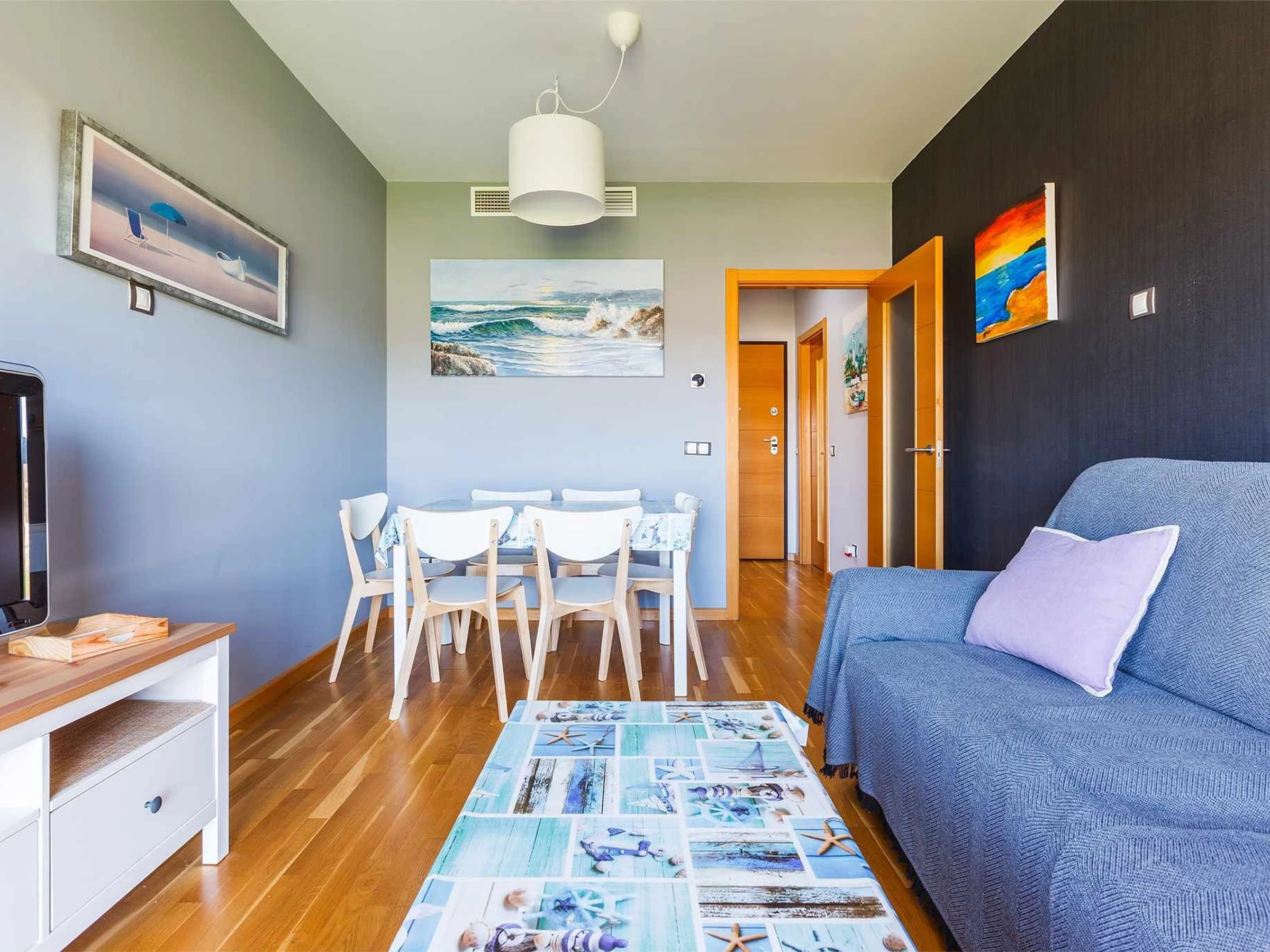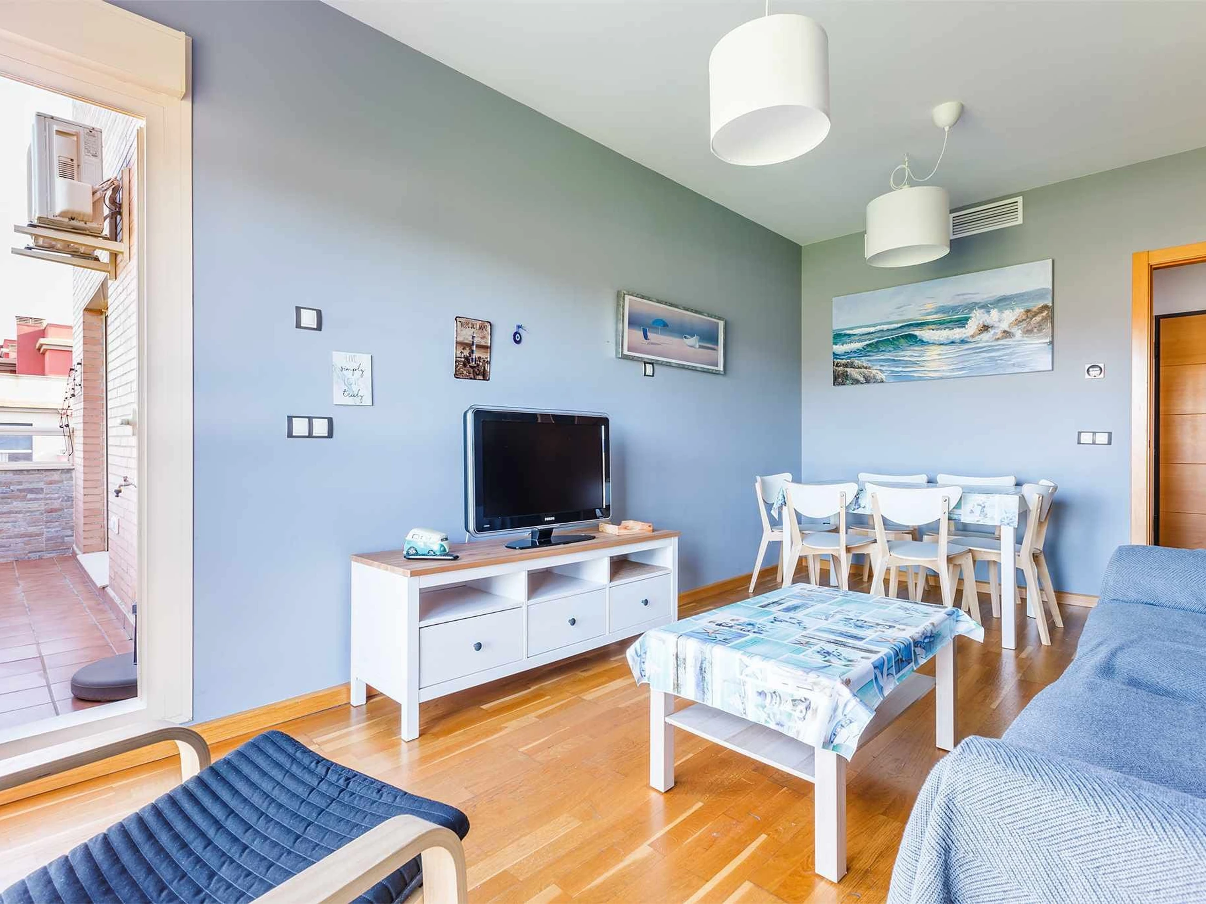 El apartamento dispone de un salón-comedor luminoso, con sofá cama doble, televisión y mesa de comedor, perfecto para descansar después de un día de playa o disfrutar de momentos en familia.