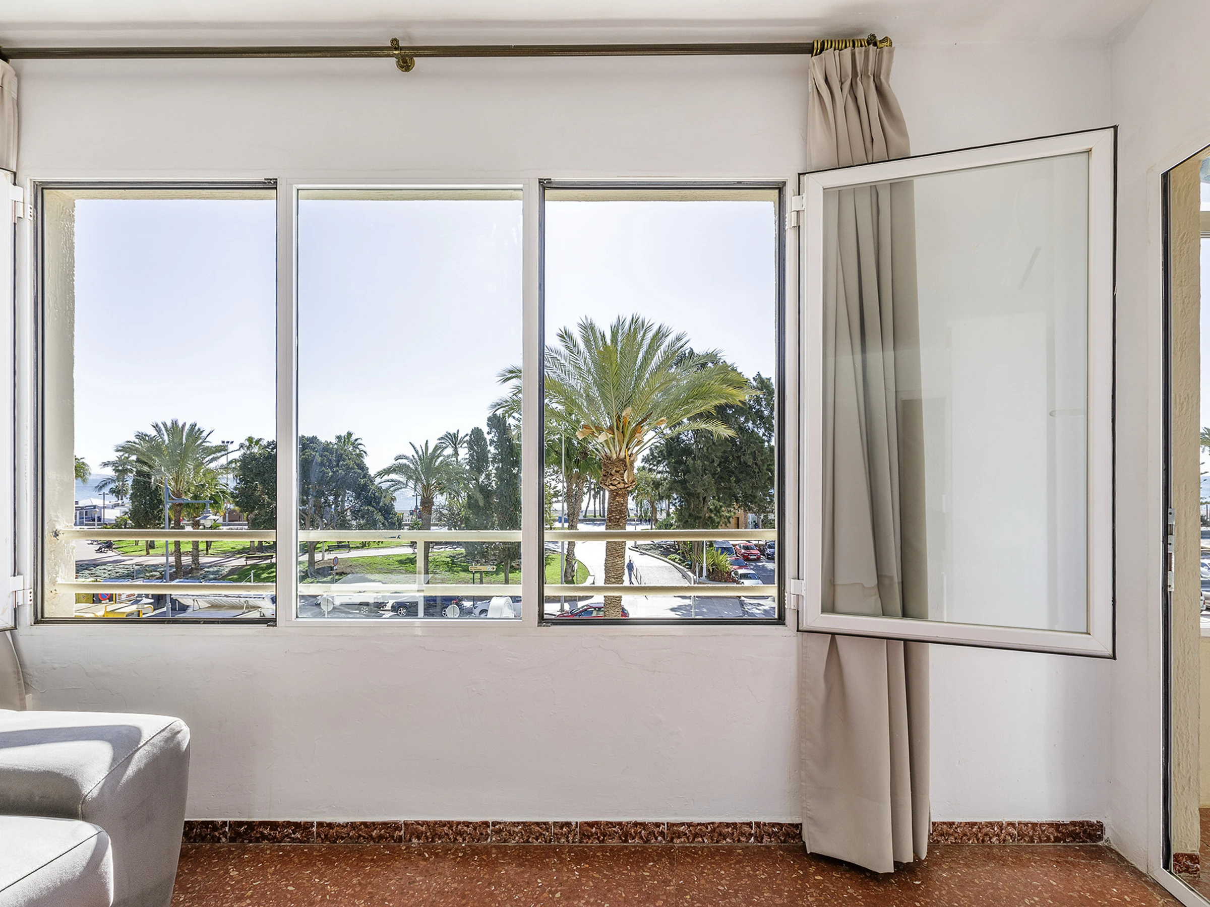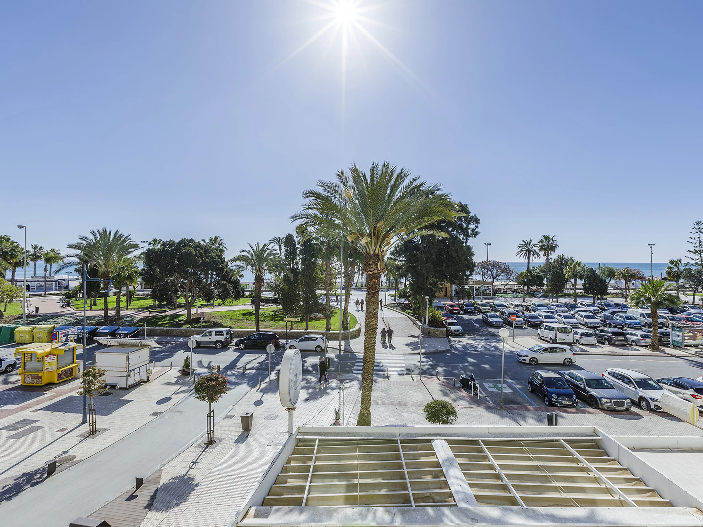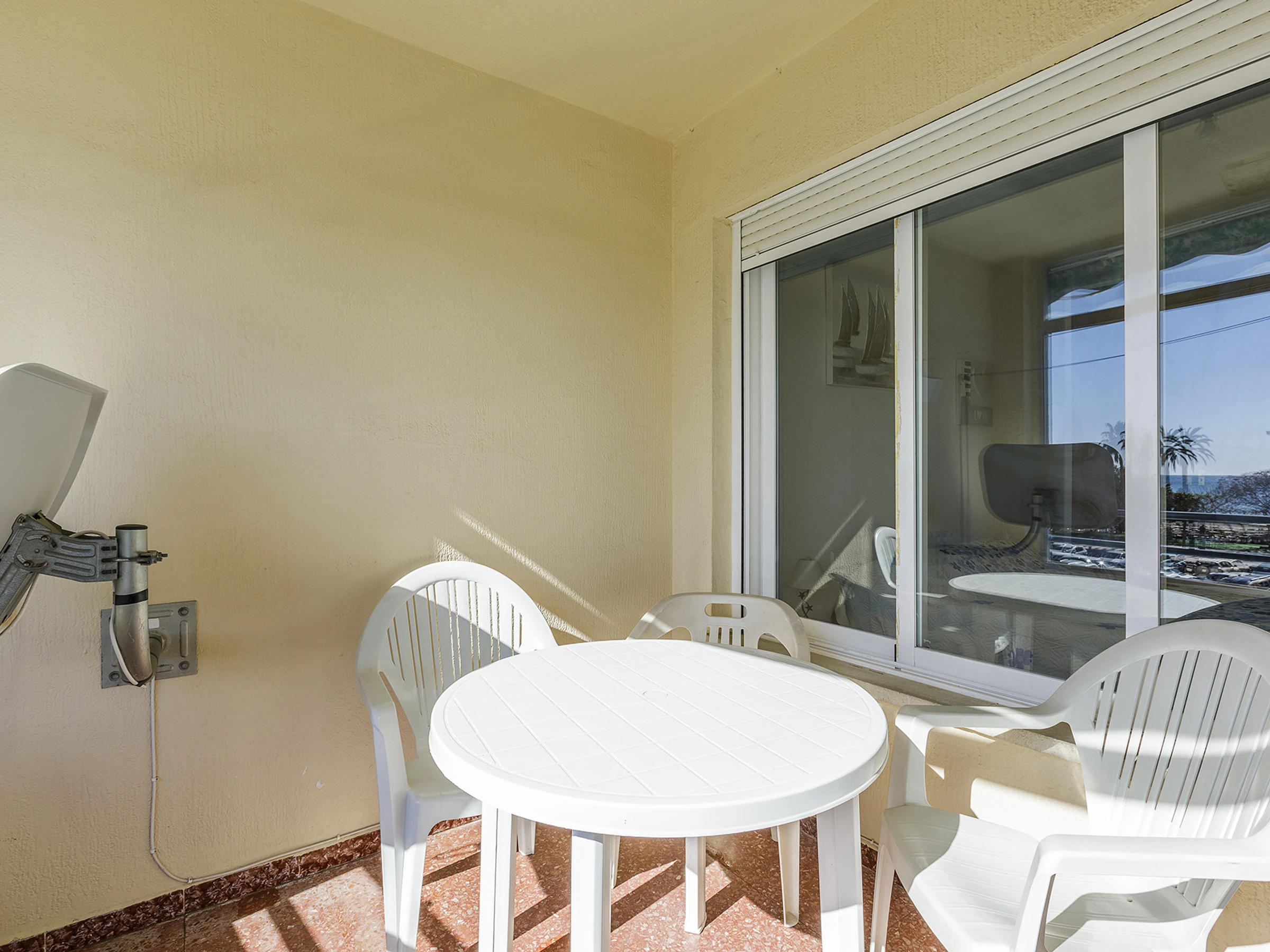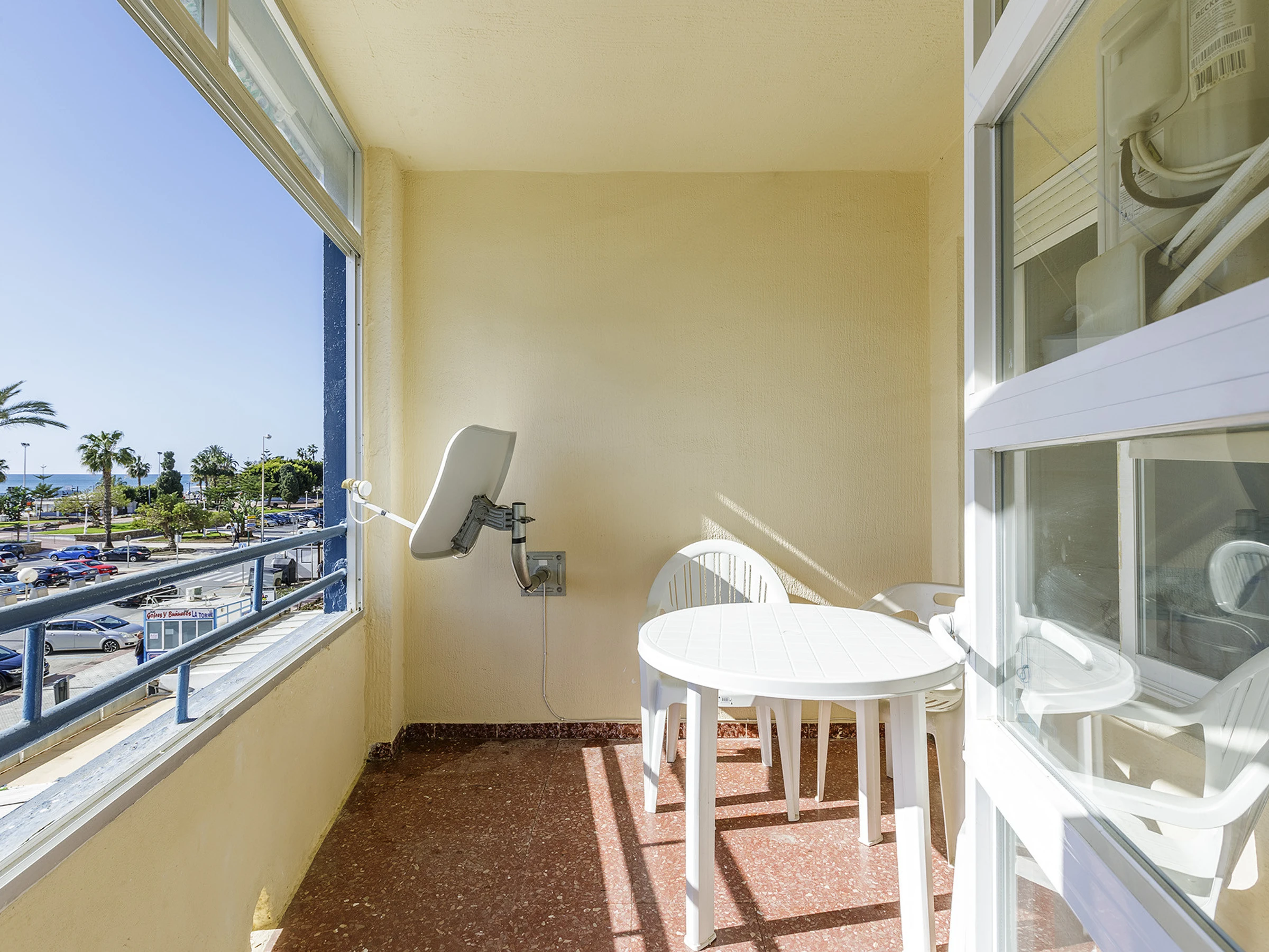 Terraza privada con vistas al paseo marítimo y a la playa, ideal para desayunar al aire libre o disfrutar de la brisa marina.