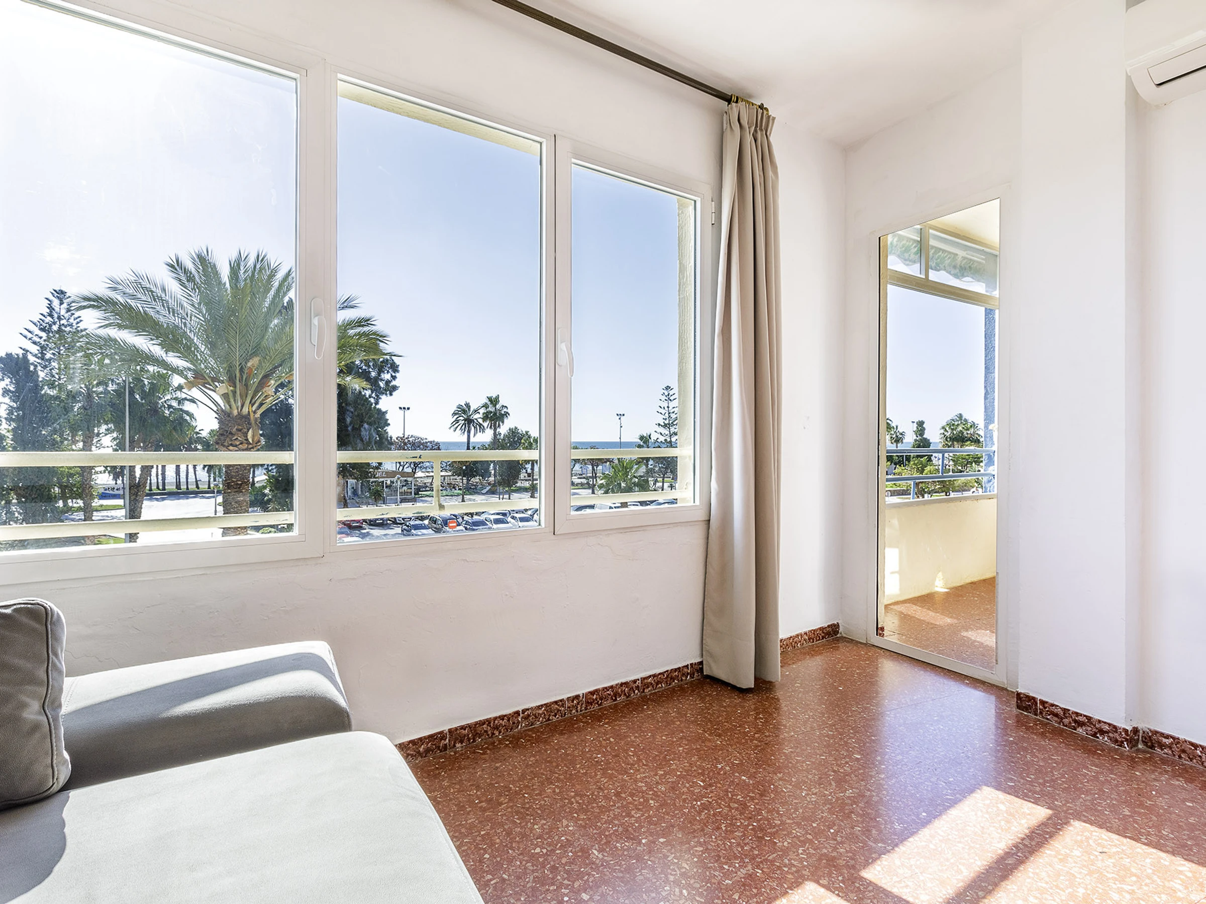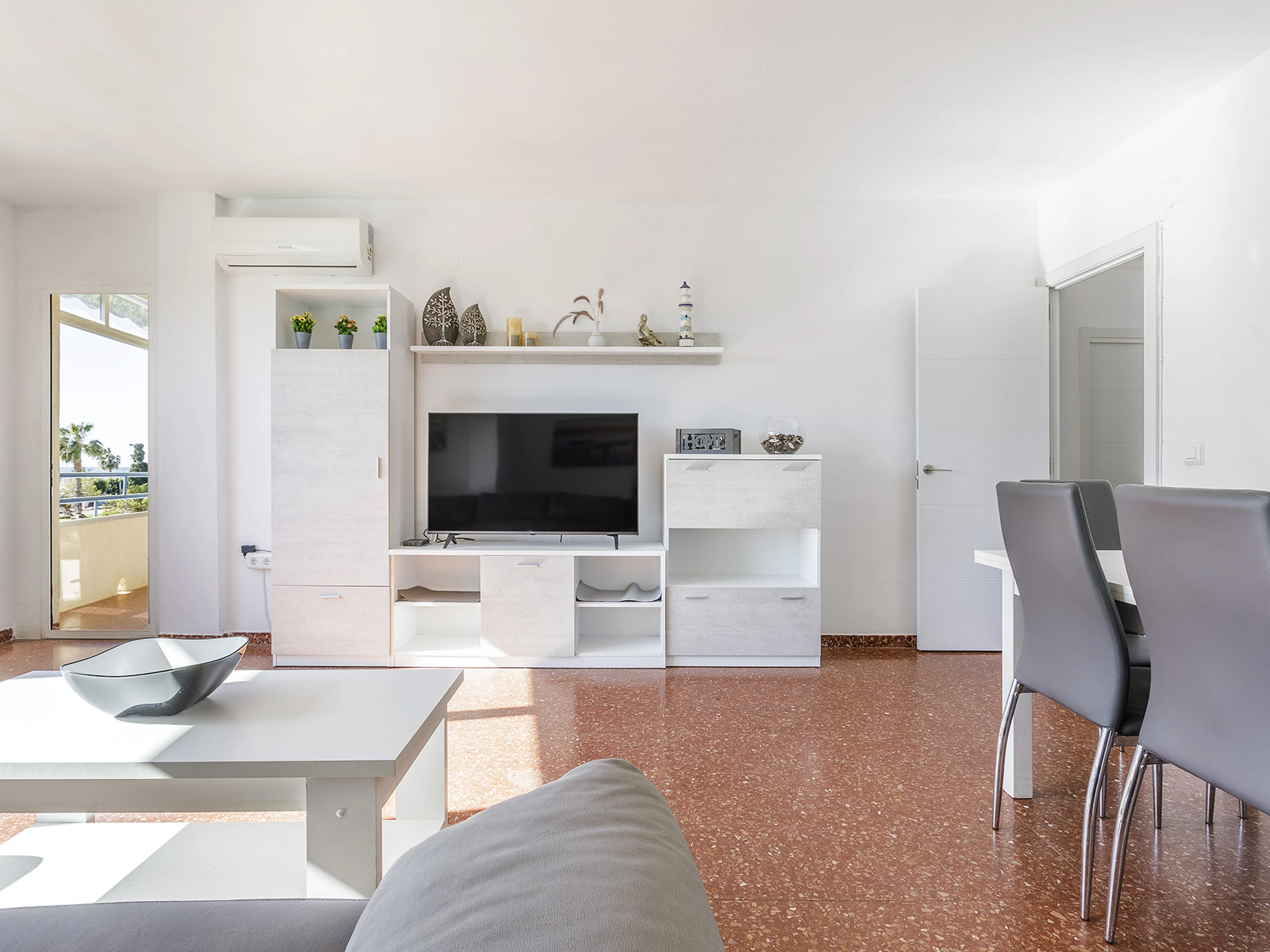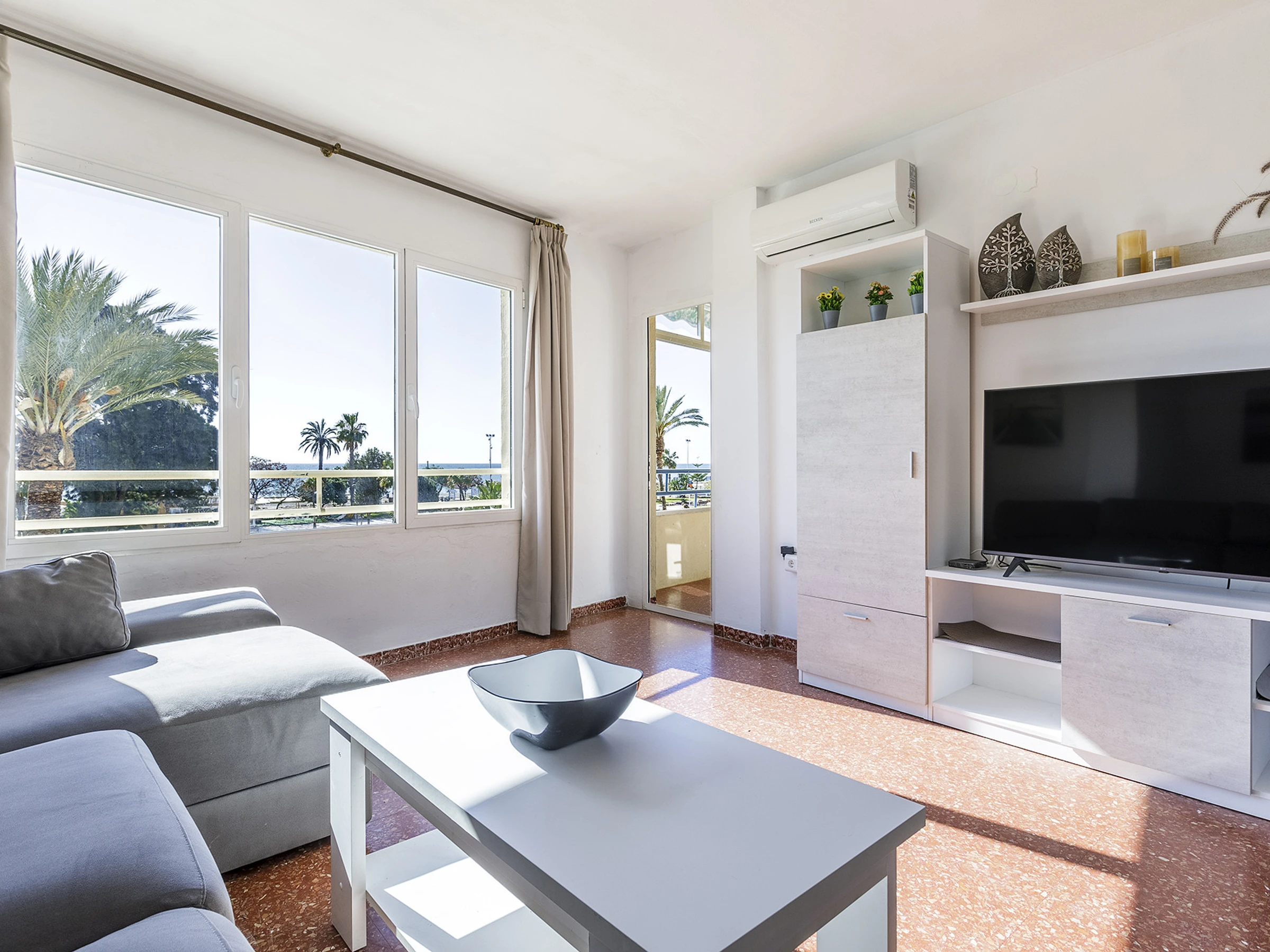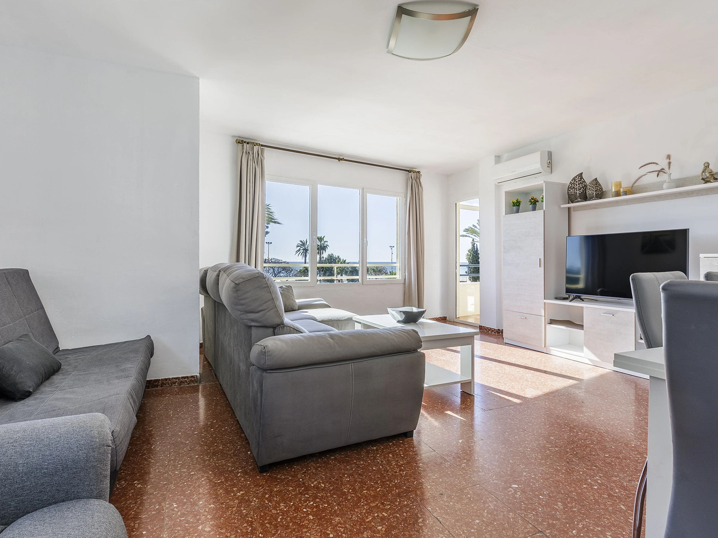 Salón luminoso con aire acondicionado, perfecto para relajarse tras un día junto al mar.