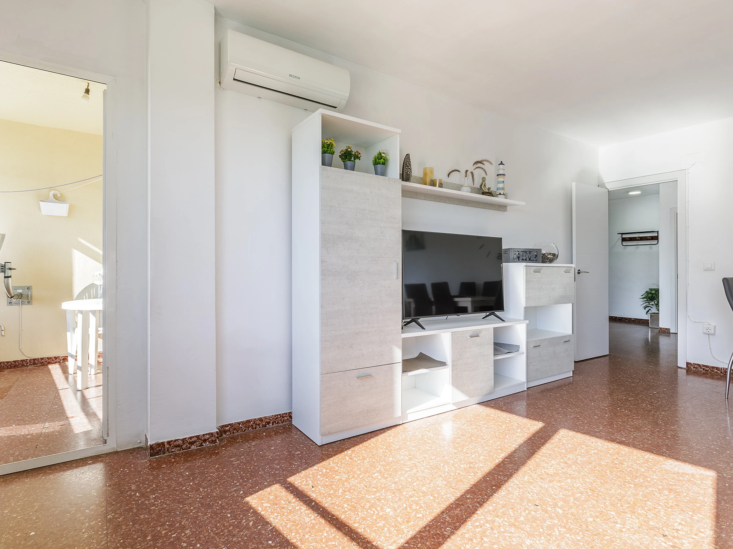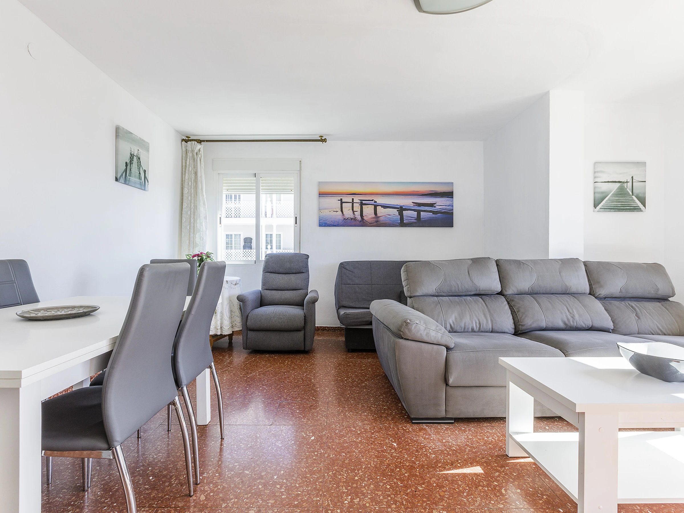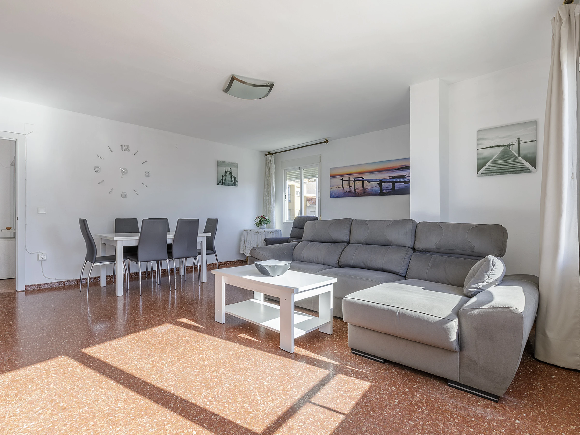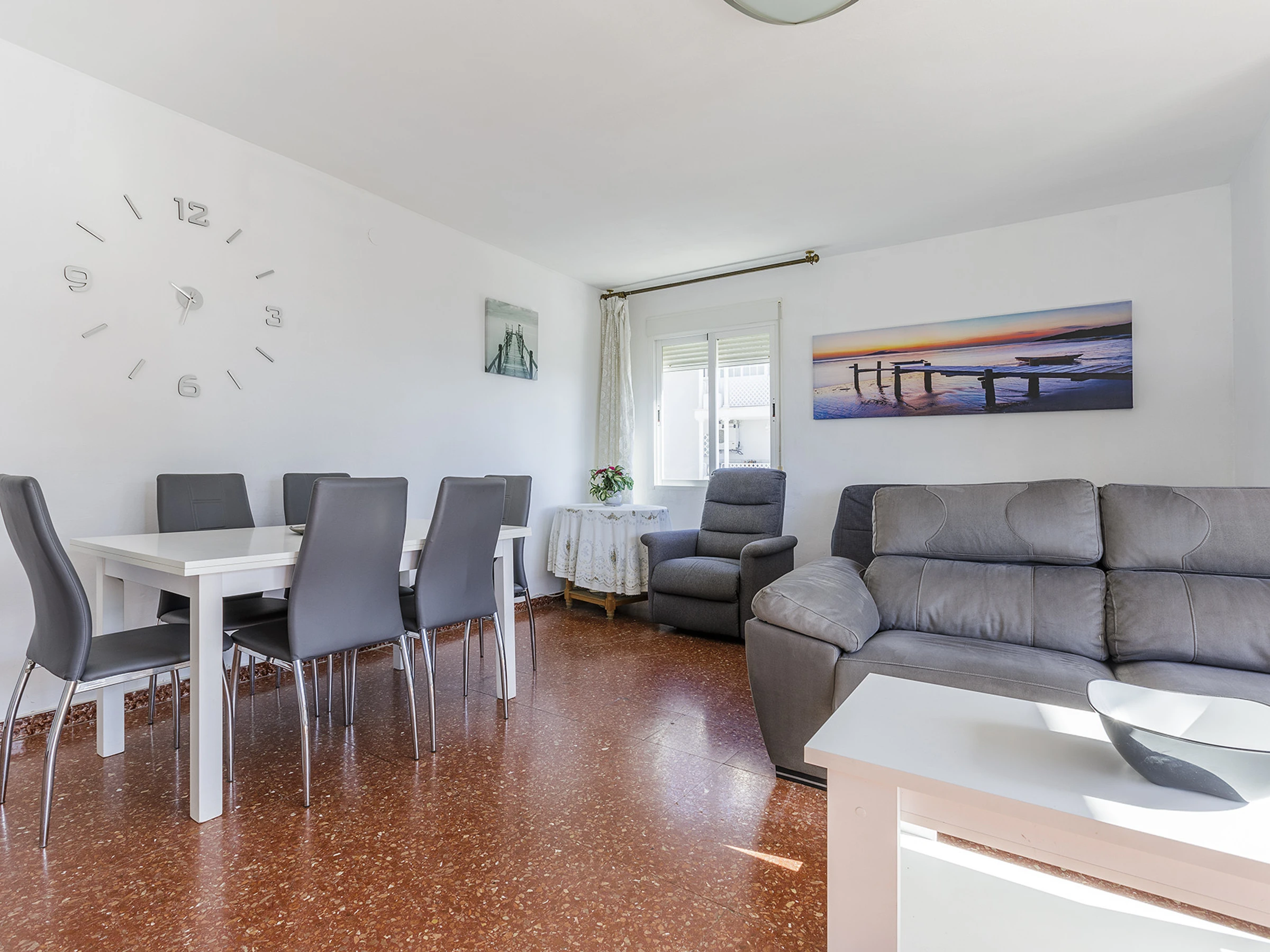 Salón luminoso con aire acondicionado, perfecto para relajarse tras un día junto al mar.