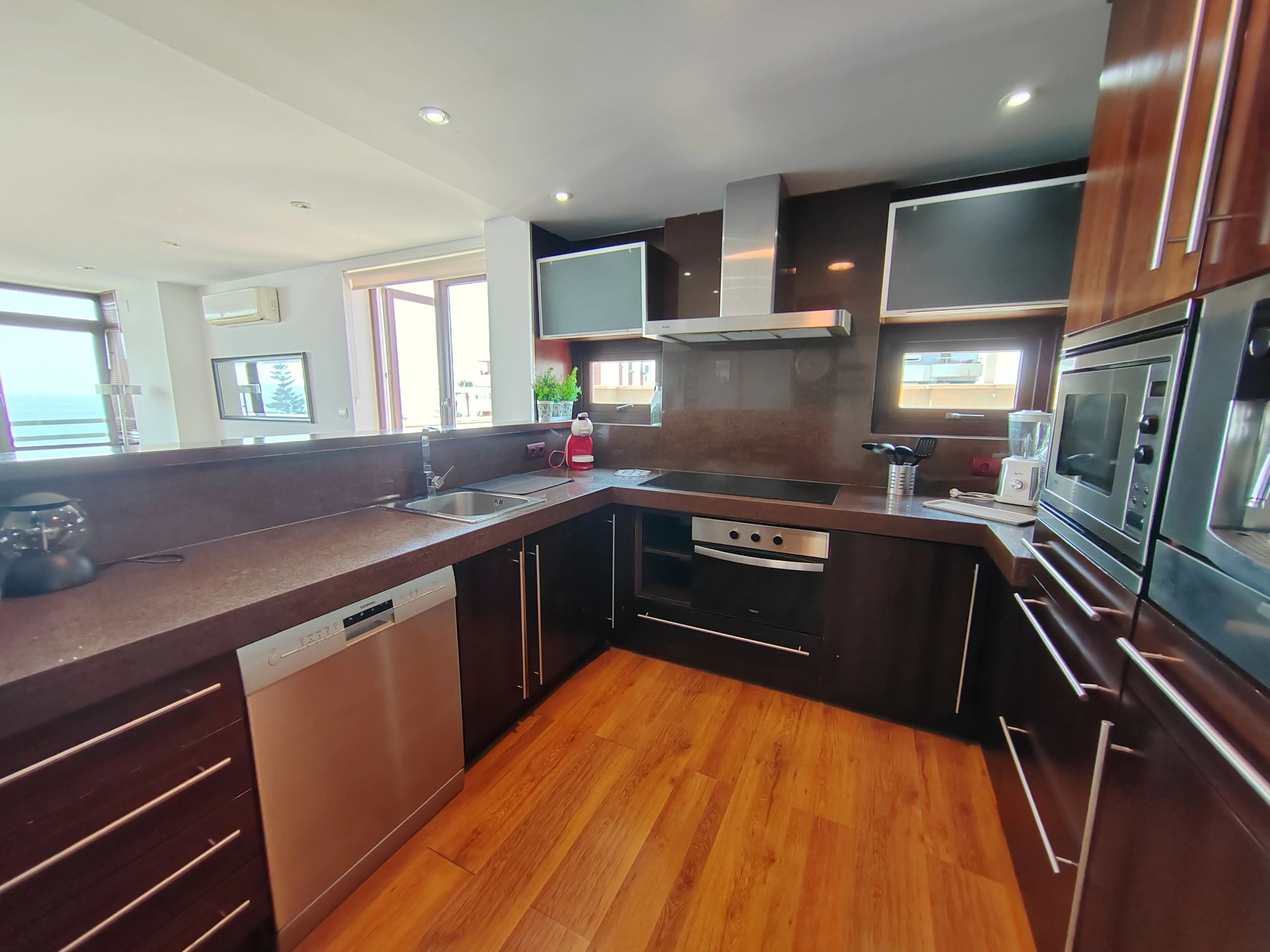La cocina americana, equipada con vitrocerámica, dispone de todos los electrodomésticos necesarios, como nevera, microondas, horno, congelador, lavadora, así como vajilla, cubertería, utensilios de cocina, cafetera, tostadora y hervidor de agua para que te sientas como en casa. No se aceptan mascotas, y se ofrece servicio de transporte al aeropuerto bajo suplemento.