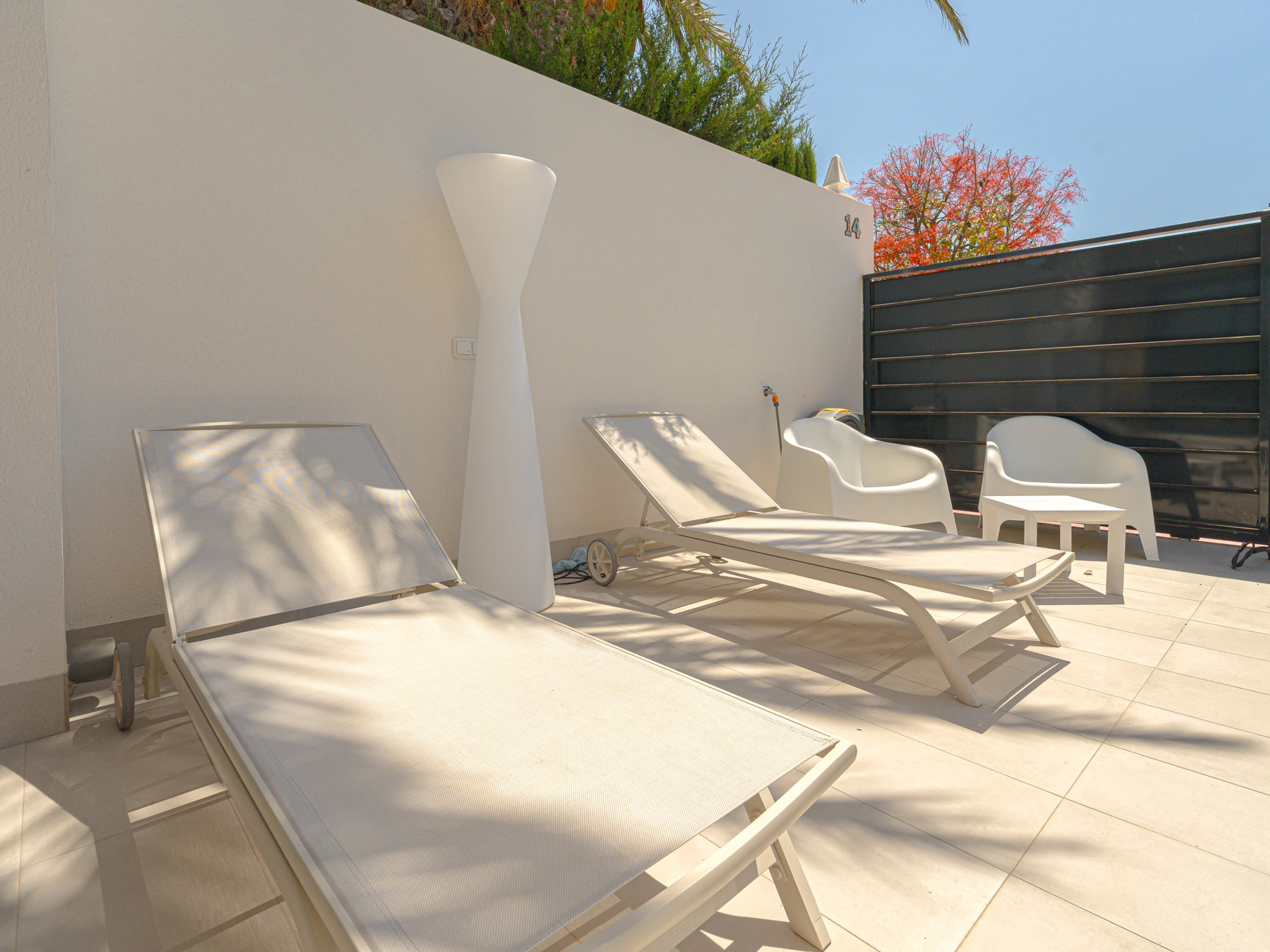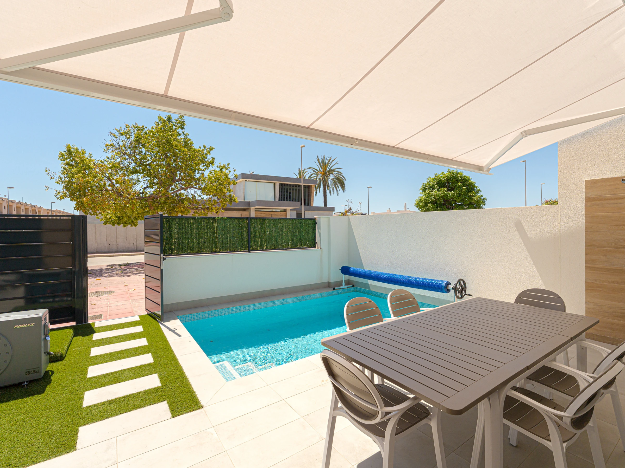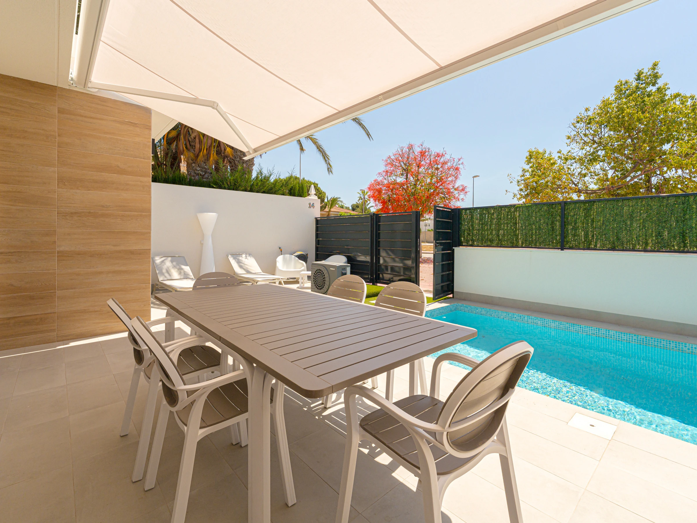 Un punto destacado es el jardín privado de 70 metros cuadrados con terraza y mobiliario de exterior, perfecto para disfrutar de momentos de relax al aire libre. La casa también ofrece una piscina privada estándar y otra climatizada, ideal para los amantes del baño en cualquier época del año.