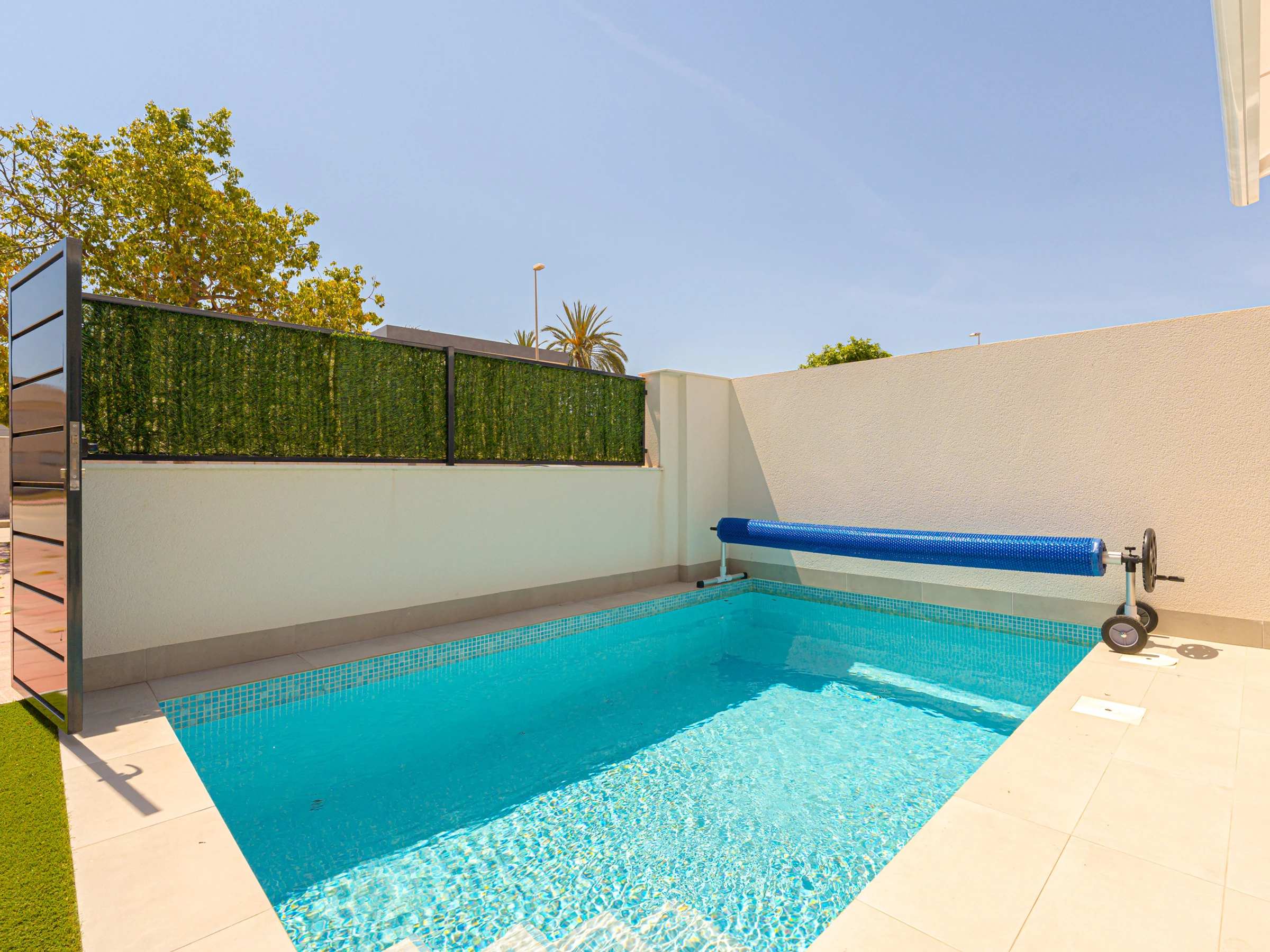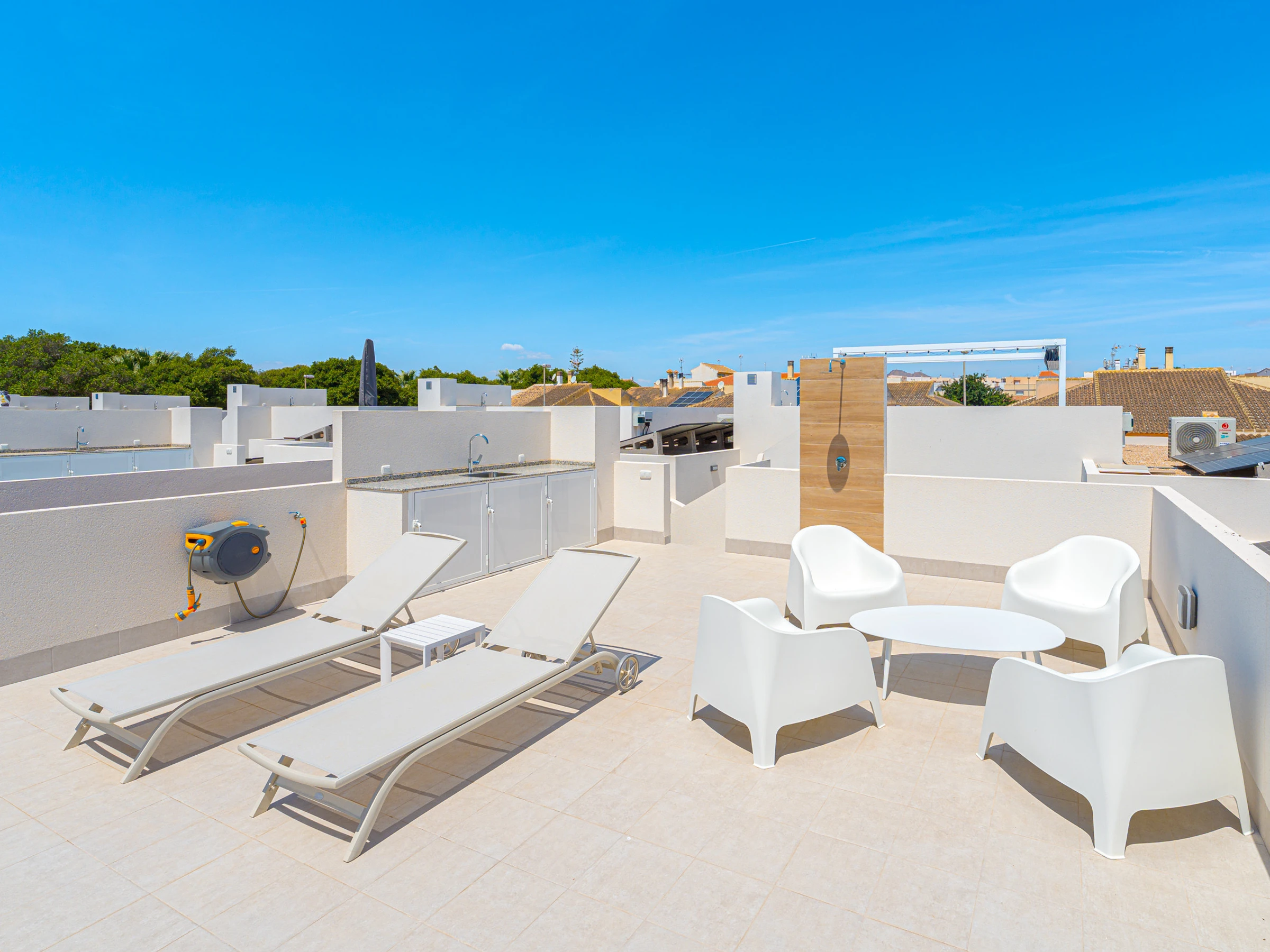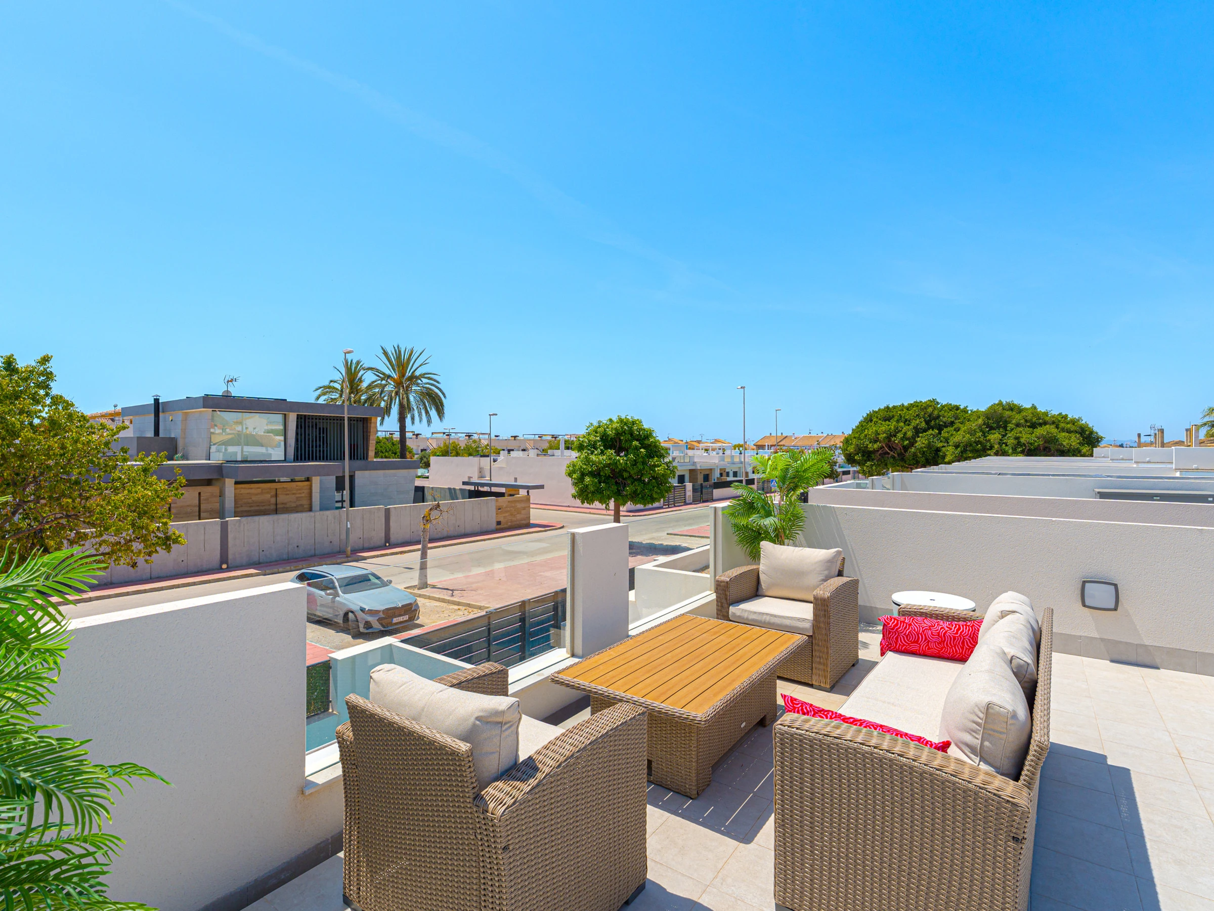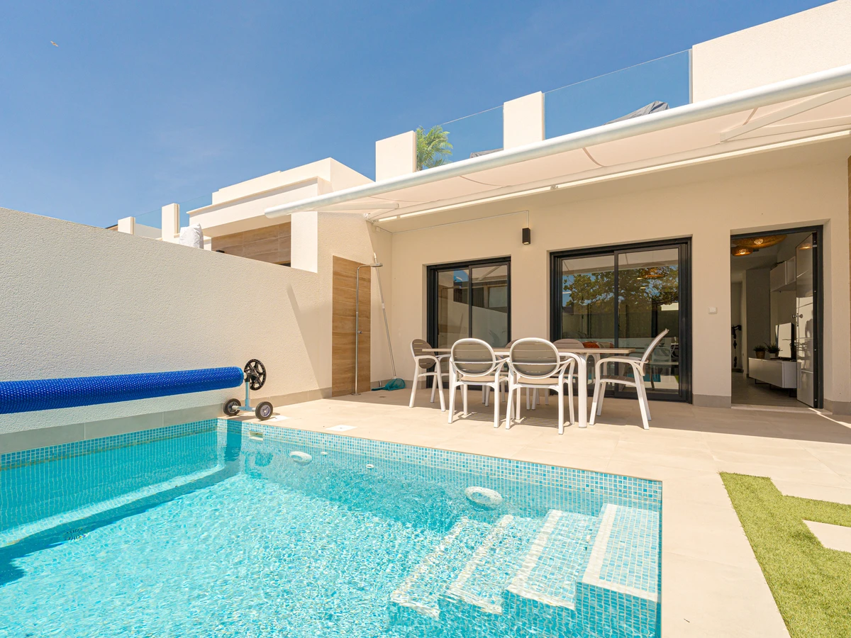Su ubicación es inmejorable. Se encuentra a solo 4 kilómetros de la playa de Los Narejos, a 1 kilómetro del campo de golf Roda Golf, y muy cerca de restaurantes, supermercados y cafeterías. Los aeropuertos de Alicante y Murcia están a una distancia accesible, facilitando el desplazamiento.