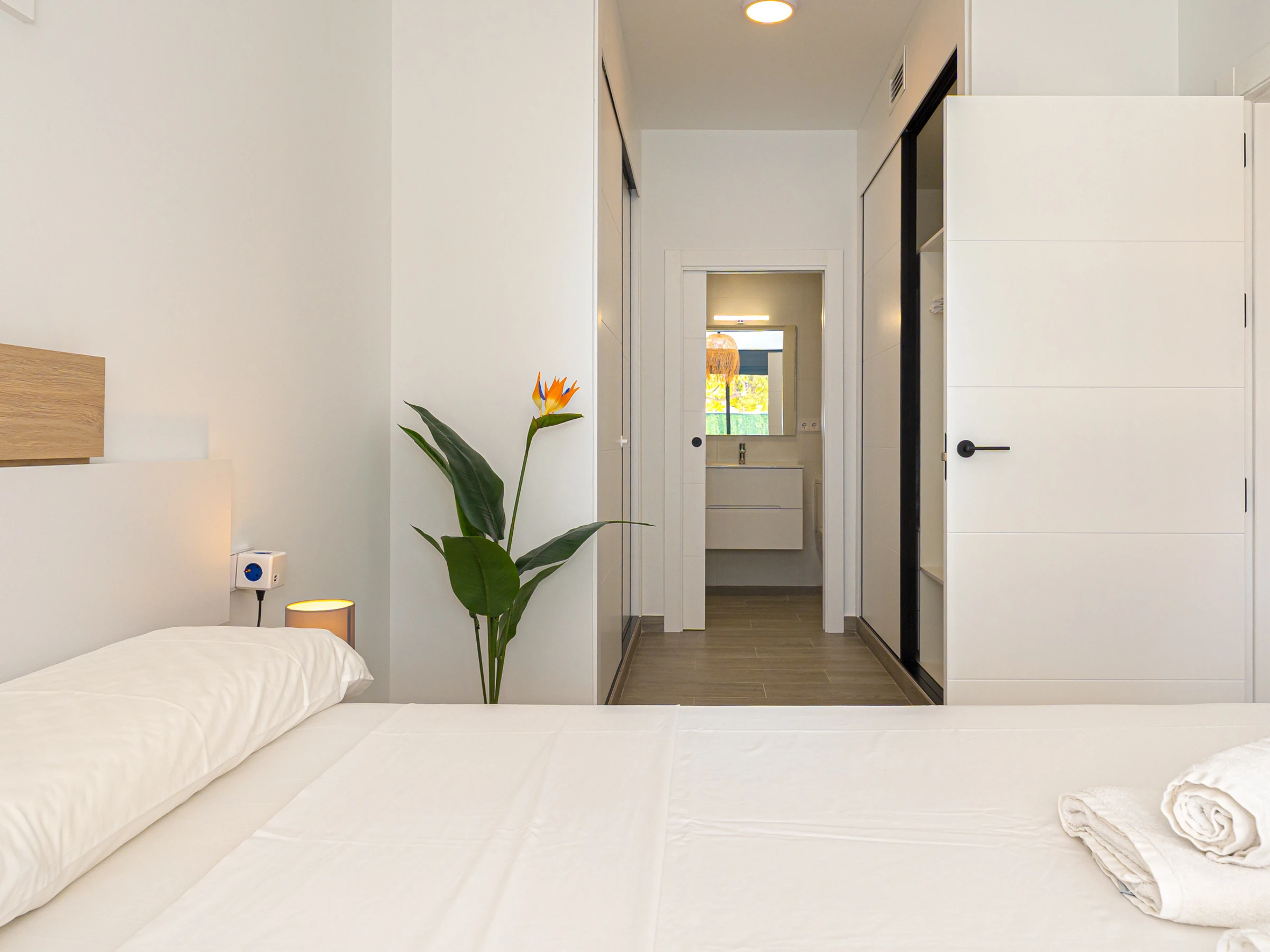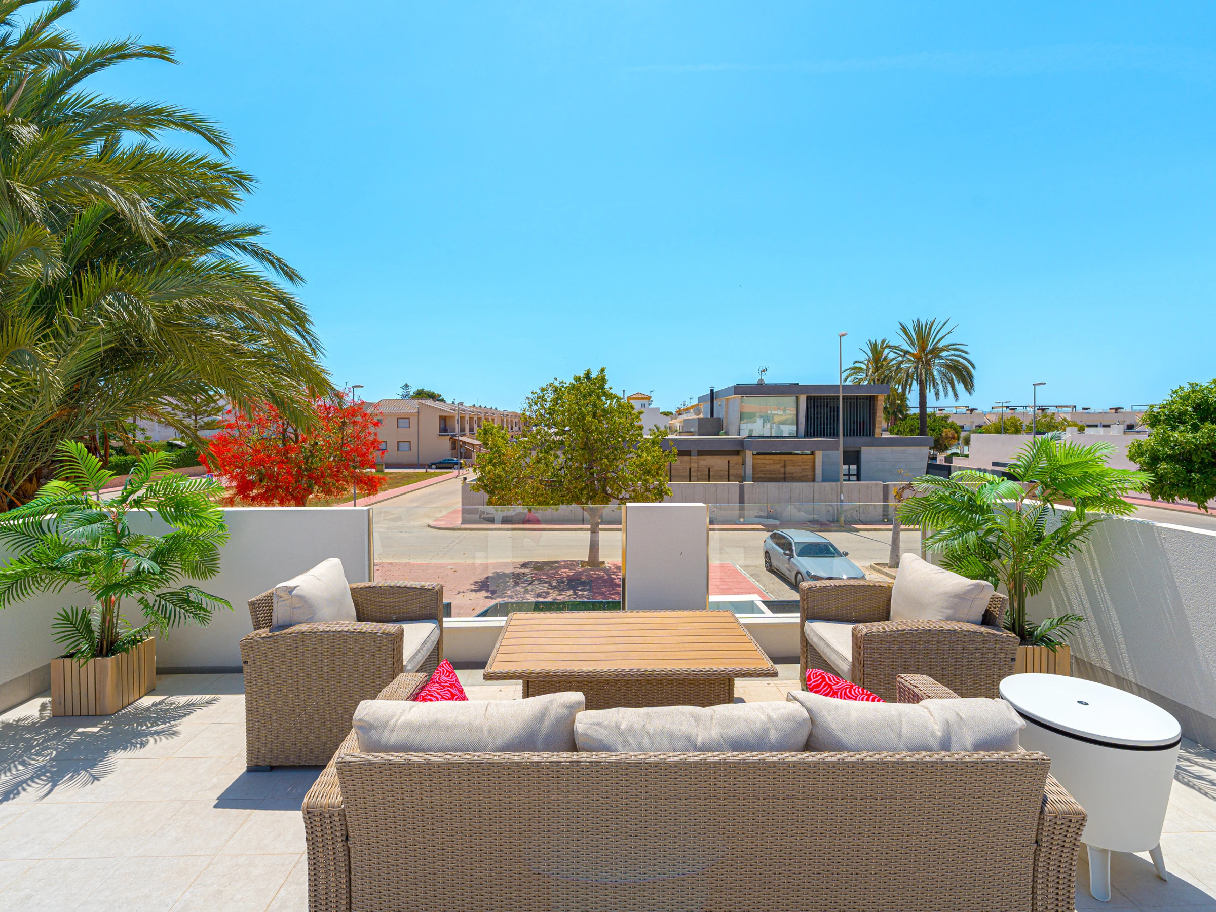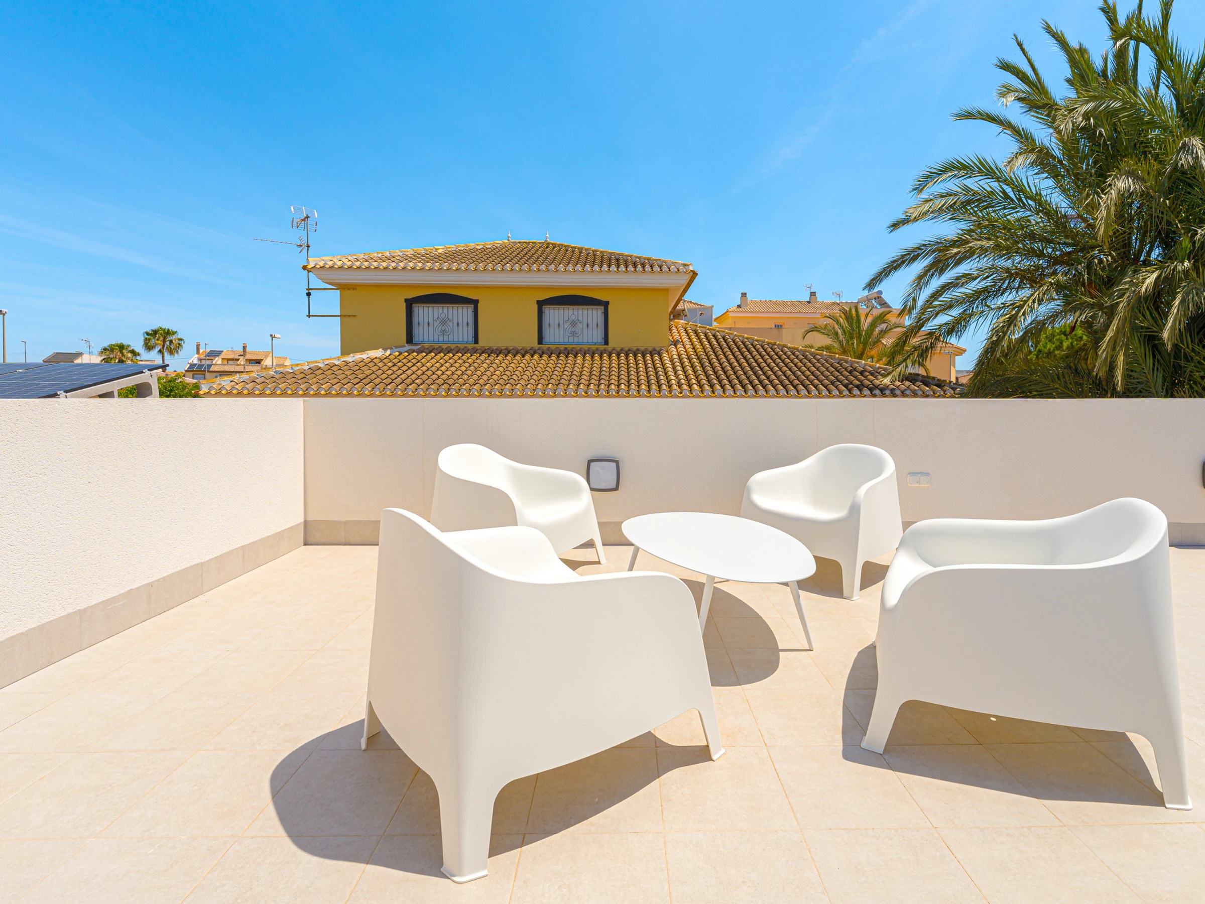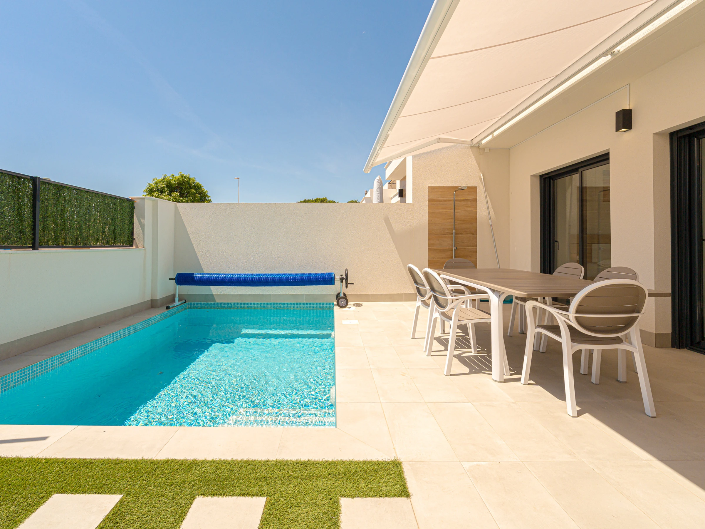 Su ubicación es inmejorable. Se encuentra a solo 4 kilómetros de la playa de Los Narejos, a 1 kilómetro del campo de golf Roda Golf, y muy cerca de restaurantes, supermercados y cafeterías. Los aeropuertos de Alicante y Murcia están a una distancia accesible, facilitando el desplazamiento.
