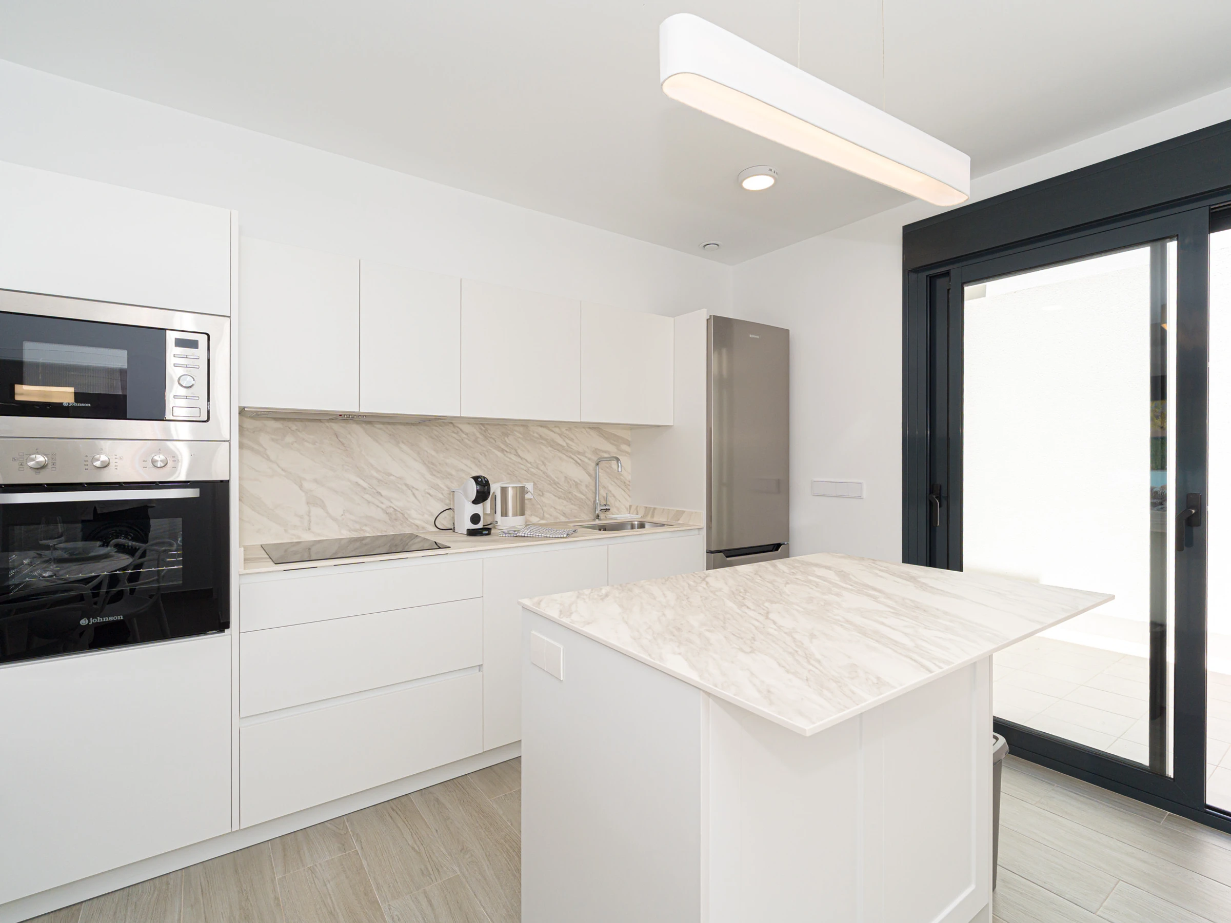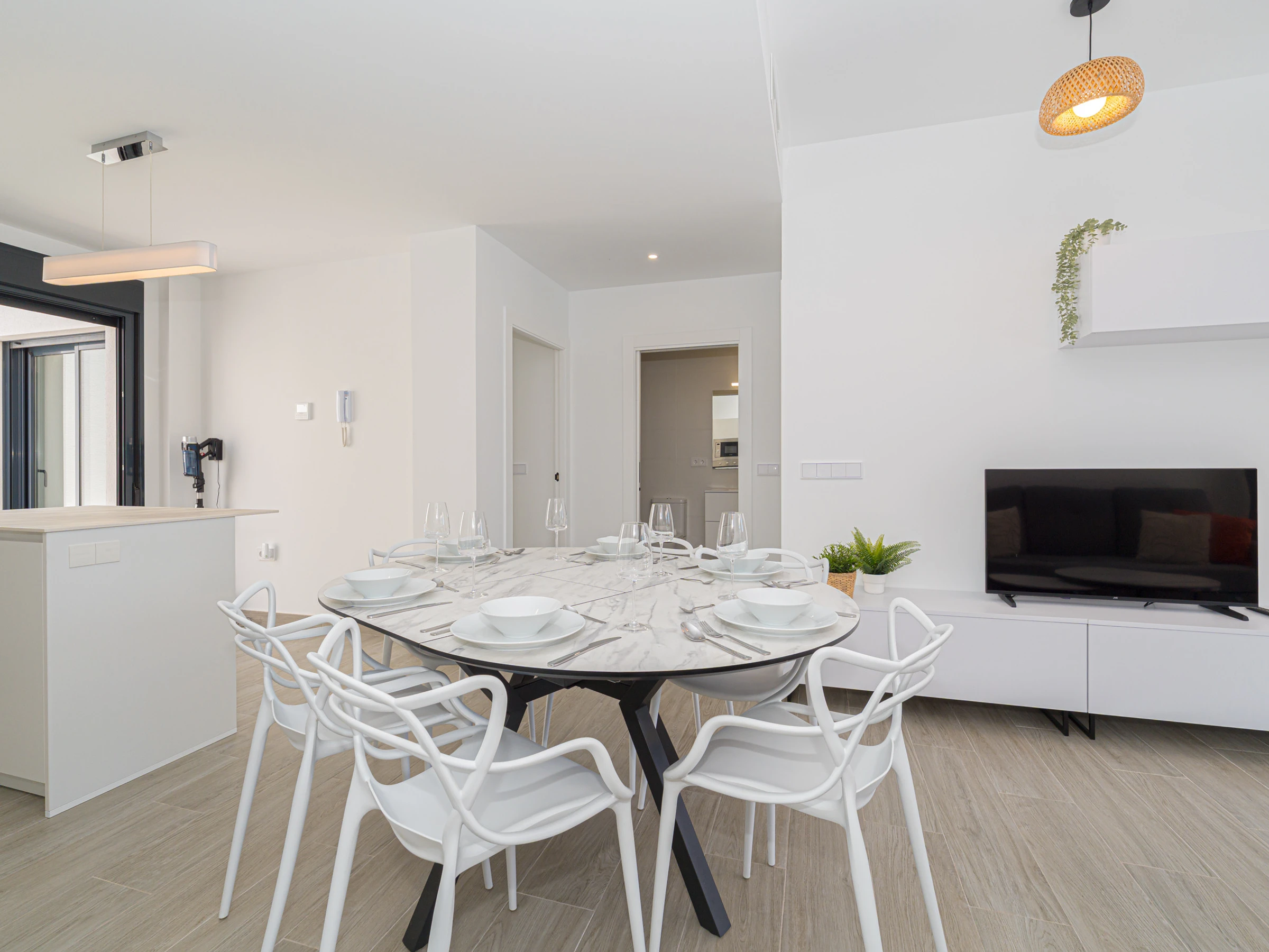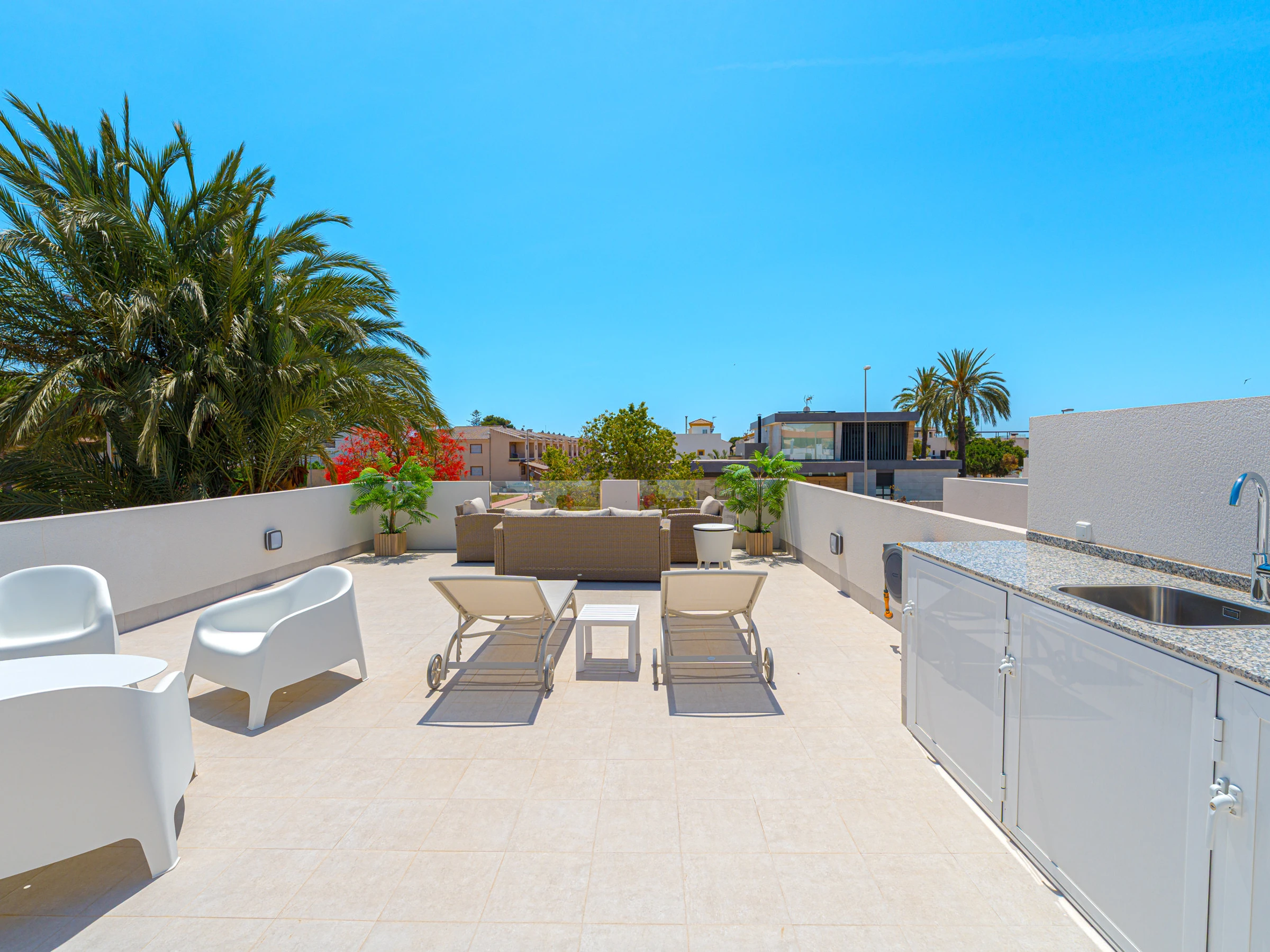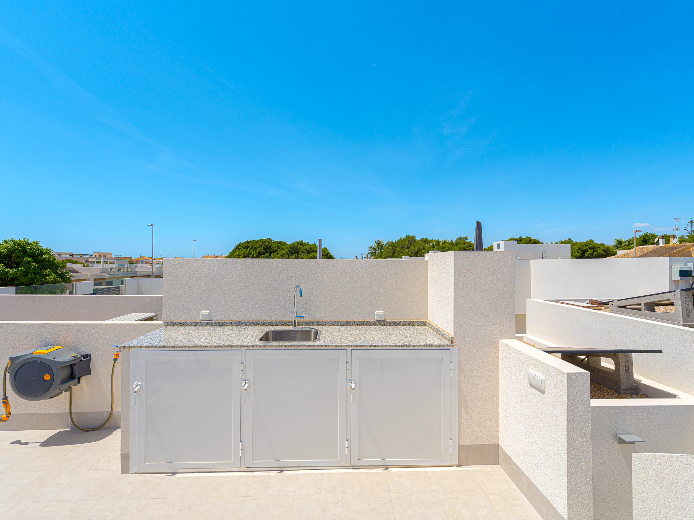 Su ubicación es inmejorable. Se encuentra a solo 4 kilómetros de la playa de Los Narejos, a 1 kilómetro del campo de golf Roda Golf, y muy cerca de restaurantes, supermercados y cafeterías. Los aeropuertos de Alicante y Murcia están a una distancia accesible, facilitando el desplazamiento.