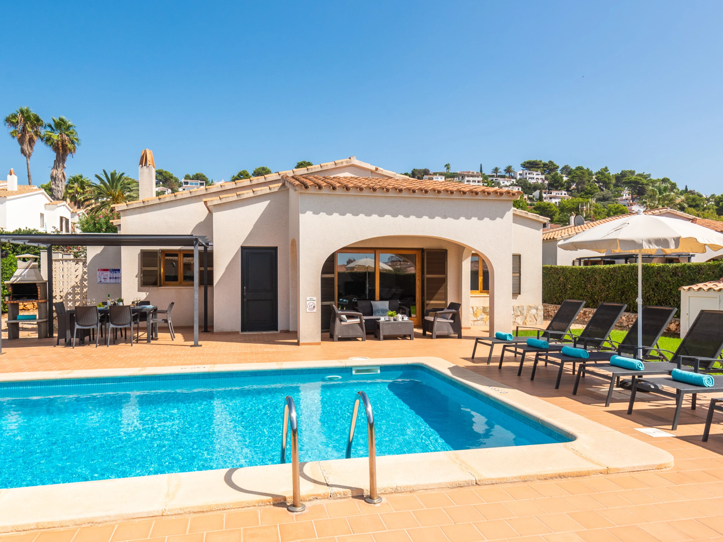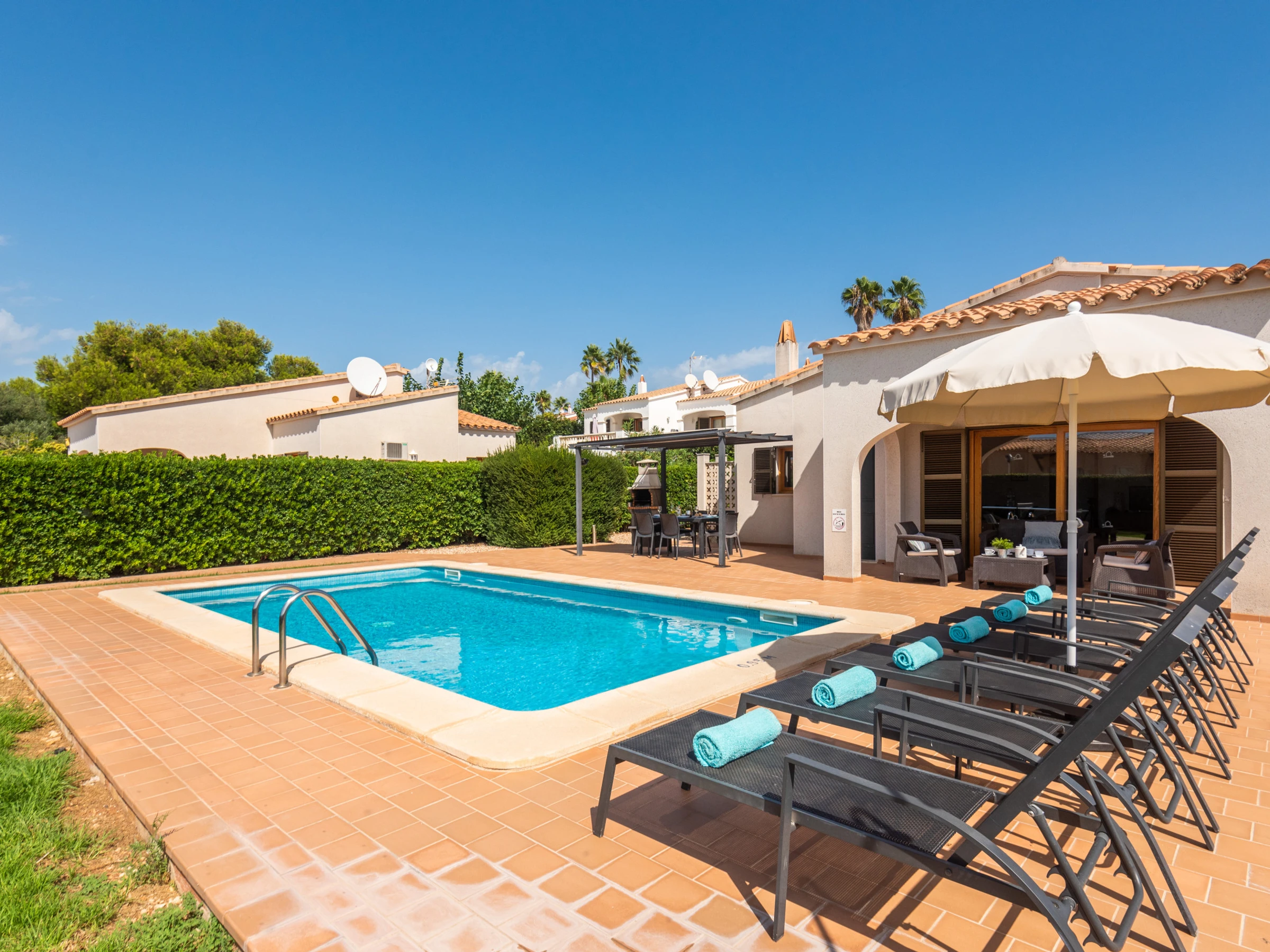En el exterior, Villa Nicolás ofrece una amplia terraza amueblada con mesa y sillas, jardín con césped, y una piscina privada rodeada de un seto alto bien mantenido. La zona exterior se completa con ducha exterior, seis hamacas y una barbacoa de obra, ideales para disfrutar del clima y de agradables veladas al aire libre.