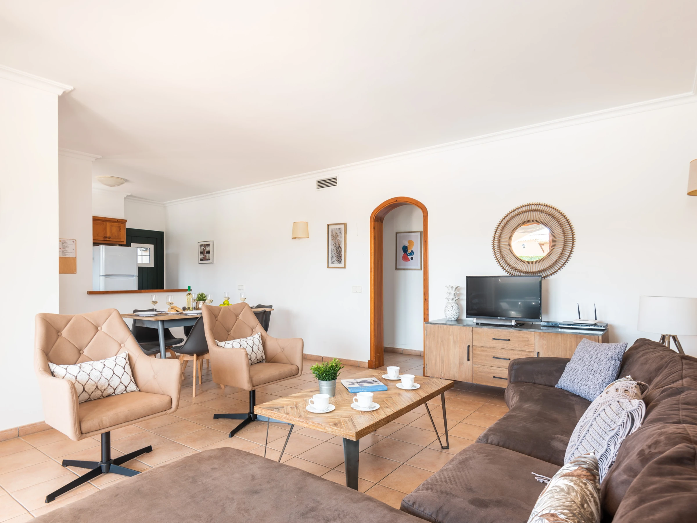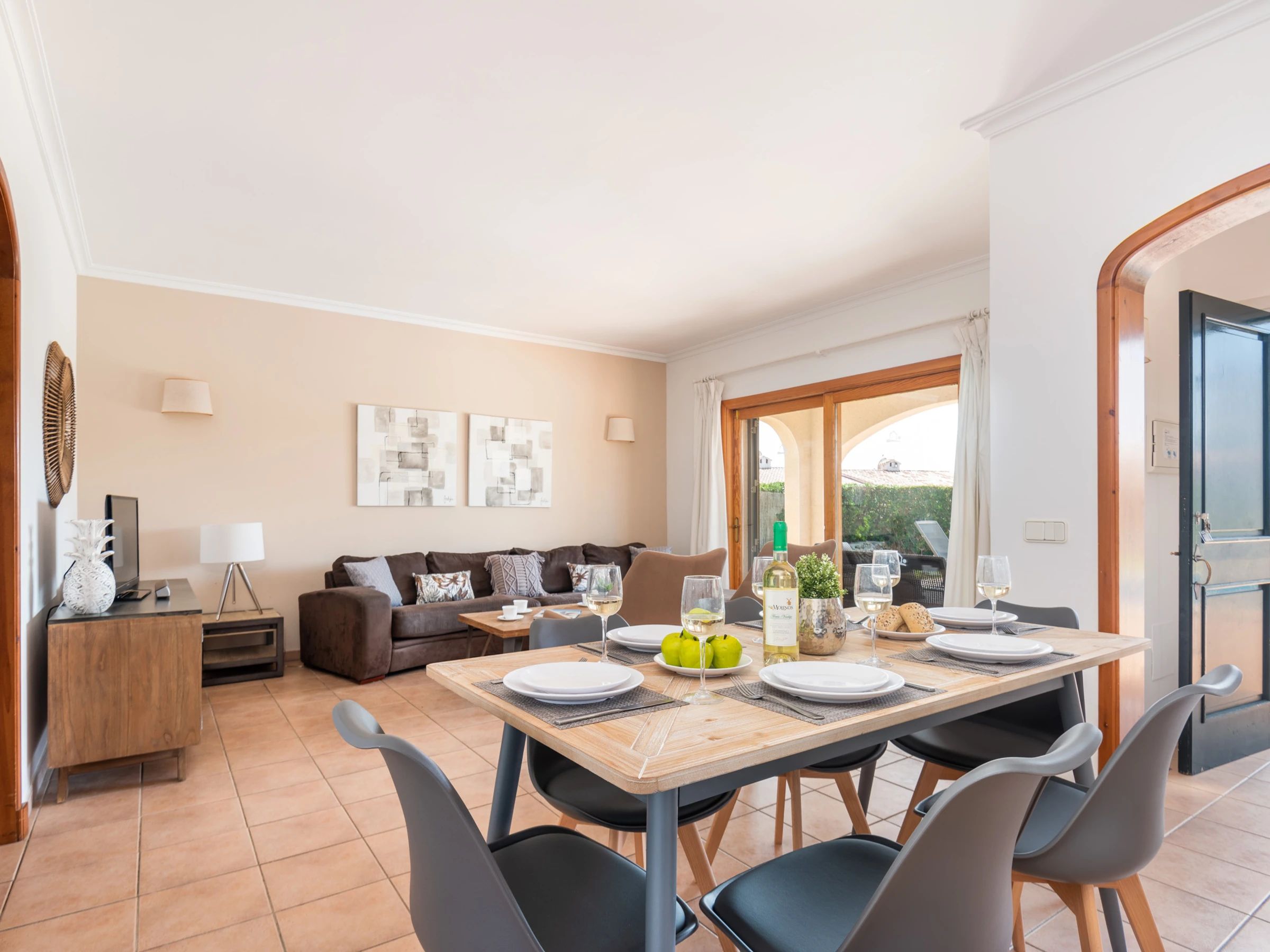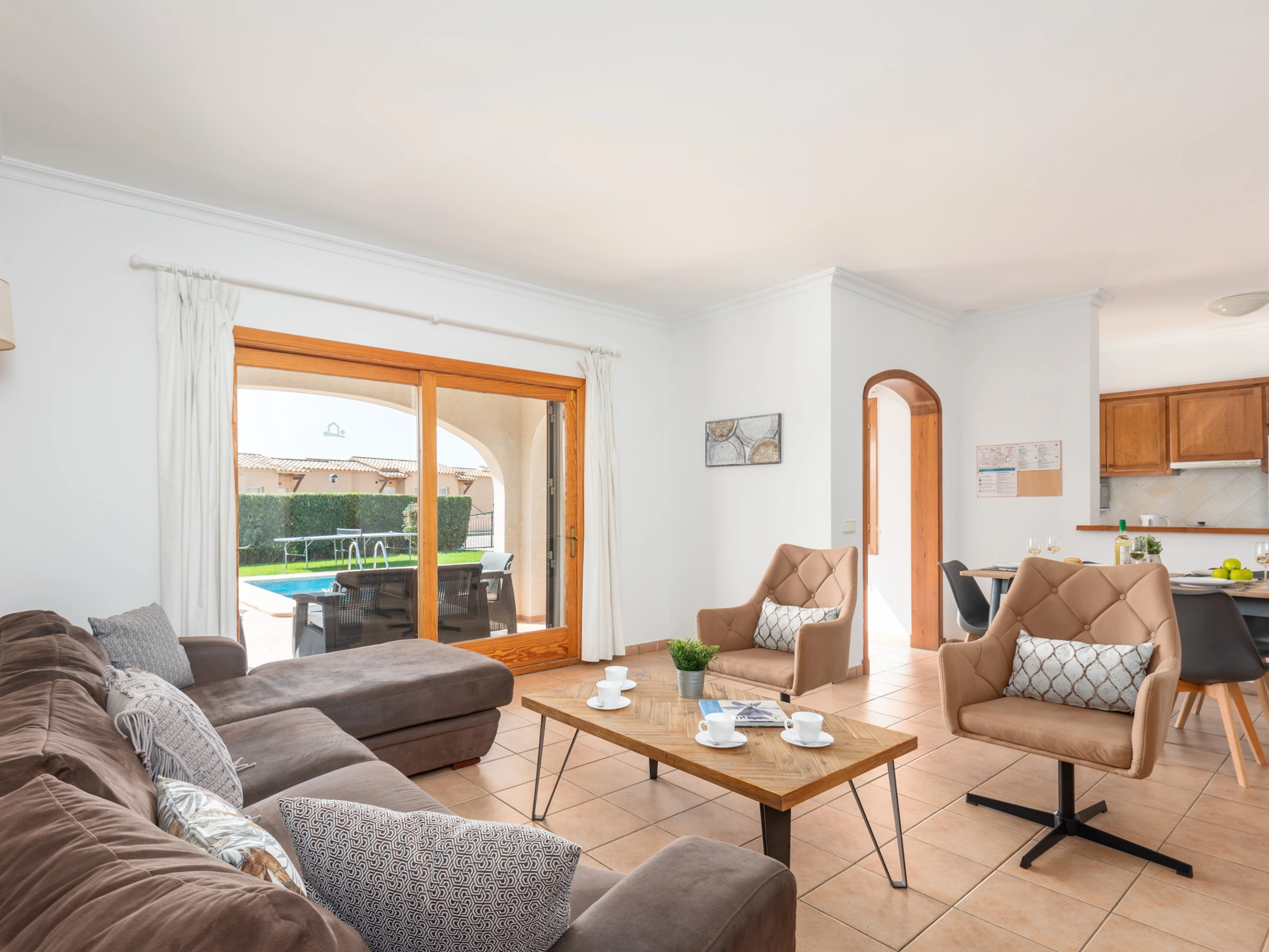 El amplio espacio diáfano que integra salón, comedor y cocina crea un ambiente luminoso y acogedor. El salón dispone de cómodos sofás, Smart TV y equipo de música, y se abre mediante grandes puertas al comedor exterior, al jardín y a la magnífica piscina privada, logrando una perfecta conexión entre el interior y el exterior. La cocina abierta, moderna y totalmente equipada, cuenta con horno, vitrocerámica, microondas, lavavajillas y frigorífico con congelador. La vivienda se completa con un lavadero independiente que dispone de lavadora y termo eléctrico.