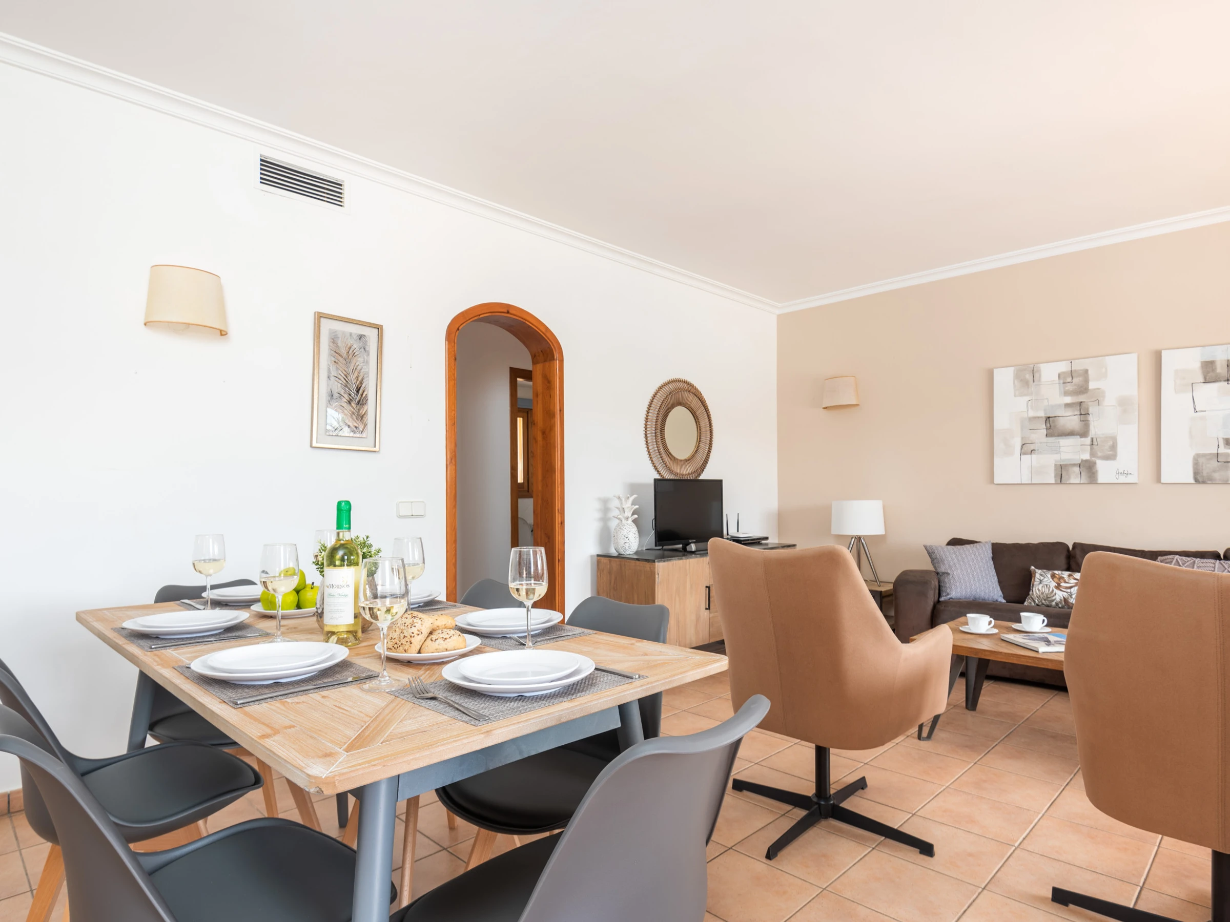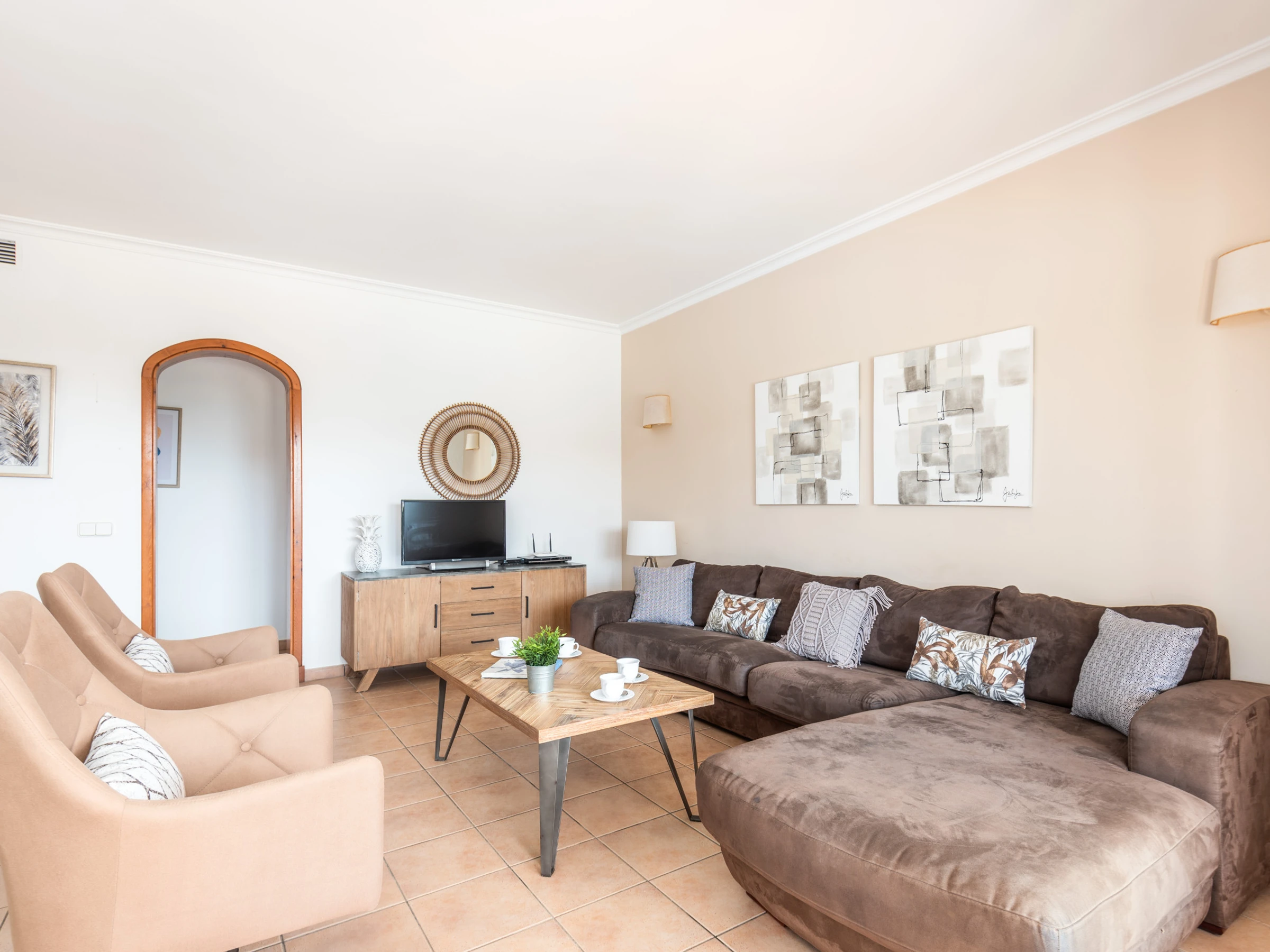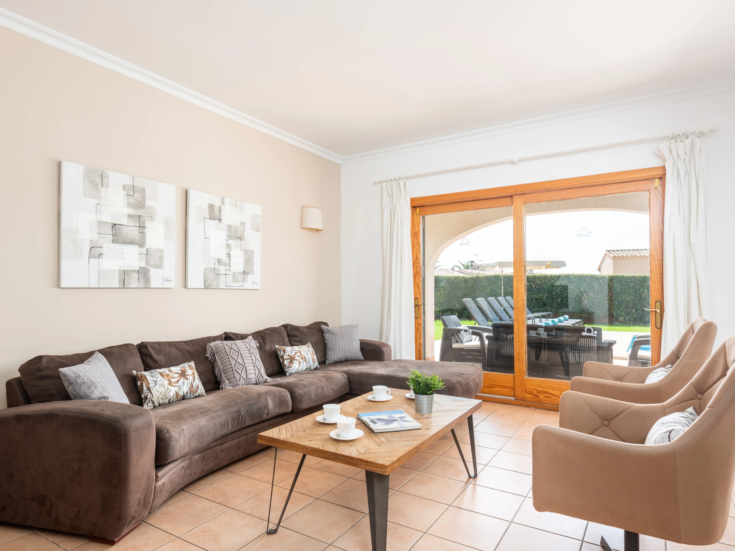 El amplio espacio diáfano que integra salón, comedor y cocina crea un ambiente luminoso y acogedor. El salón dispone de cómodos sofás, Smart TV y equipo de música, y se abre mediante grandes puertas al comedor exterior, al jardín y a la magnífica piscina privada, logrando una perfecta conexión entre el interior y el exterior. La cocina abierta, moderna y totalmente equipada, cuenta con horno, vitrocerámica, microondas, lavavajillas y frigorífico con congelador. La vivienda se completa con un lavadero independiente que dispone de lavadora y termo eléctrico.