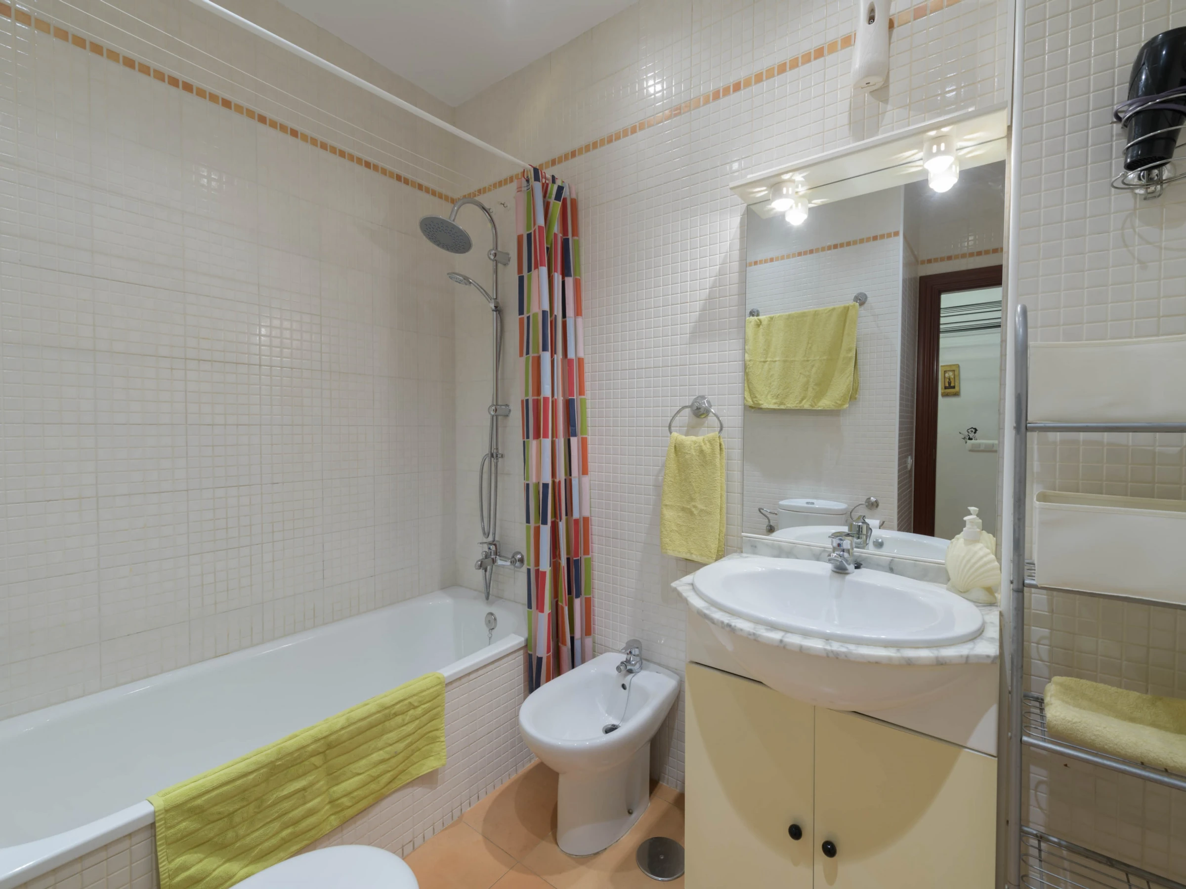 Este encantador estudio está ubicado en la planta baja del edificio. Dispone de un amplio salón-comedor-cocina que está equipada con aire acondicionado, TV satélite, vitrocerámica y lavadora, entre otros. Nuestros huéspedes pueden descansar en el sofá cama del salón y los huéspedes extra disponen de dos camas plegables detrás de los biombos. El baño está equipado con bañera. Por último, podemos proporcionar una cuna y una trona si viaja con su bebé.
