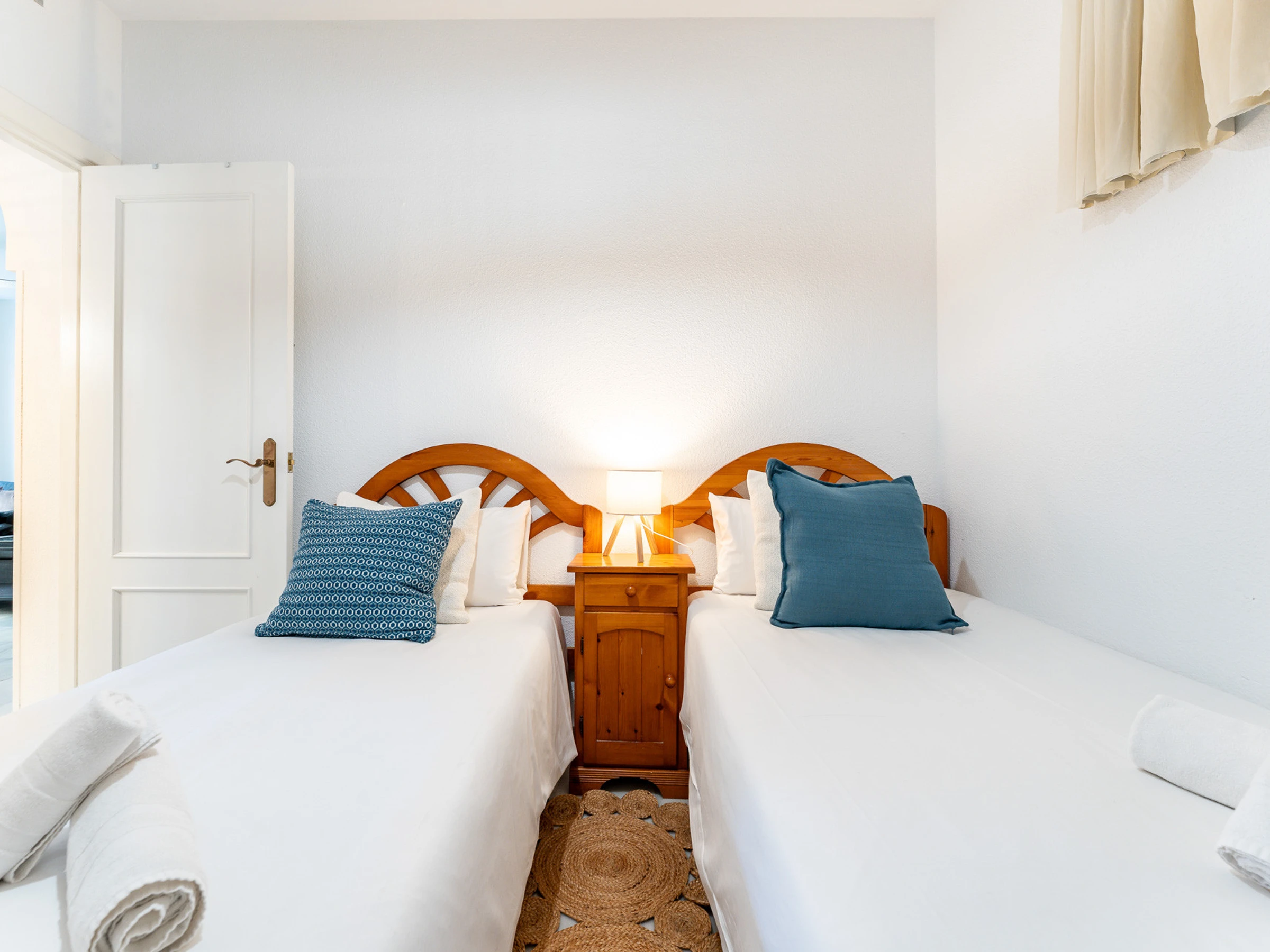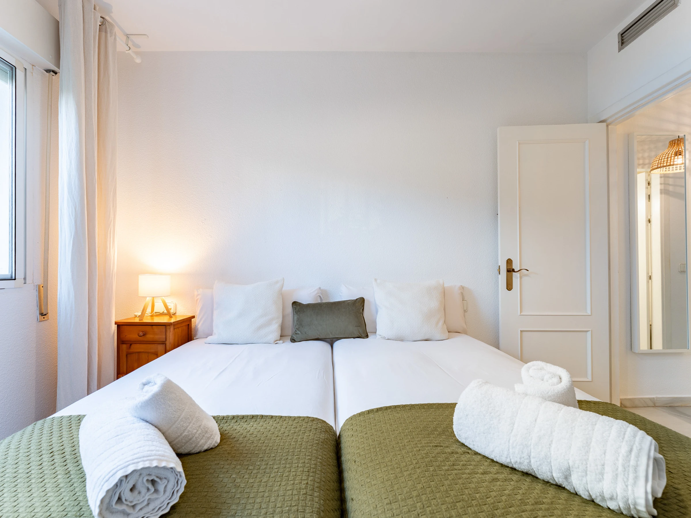 El apartamento incluye dos habitaciones con dos camas individuales cada una, perfecta para familias o grupos de amigos. Dispone de un completo cuarto de baño con ducha, proporcionando un espacio relajante después de un día de actividades.