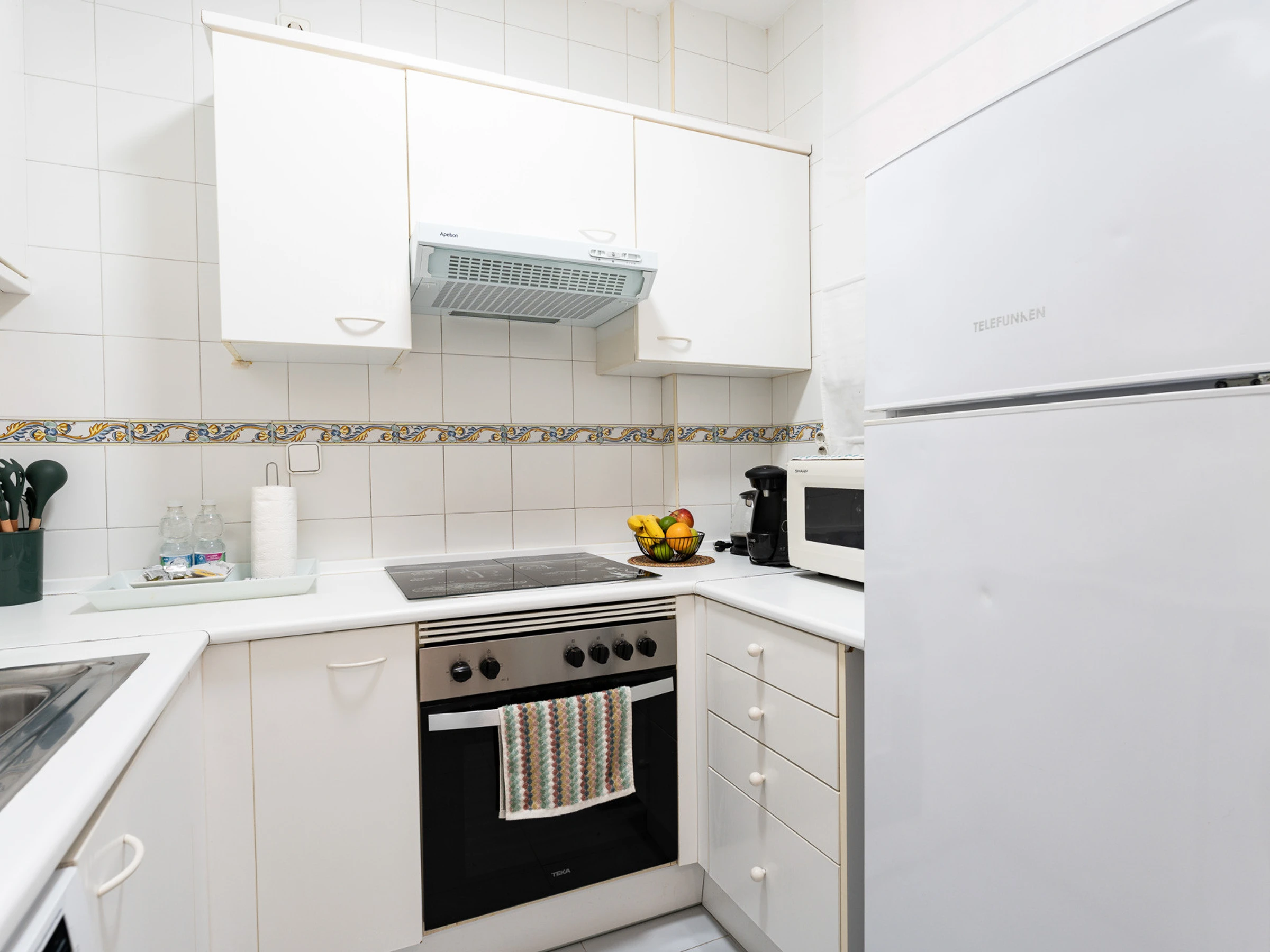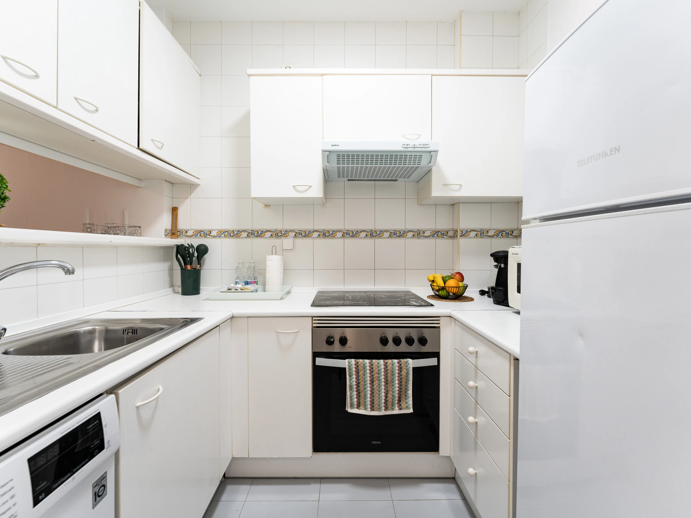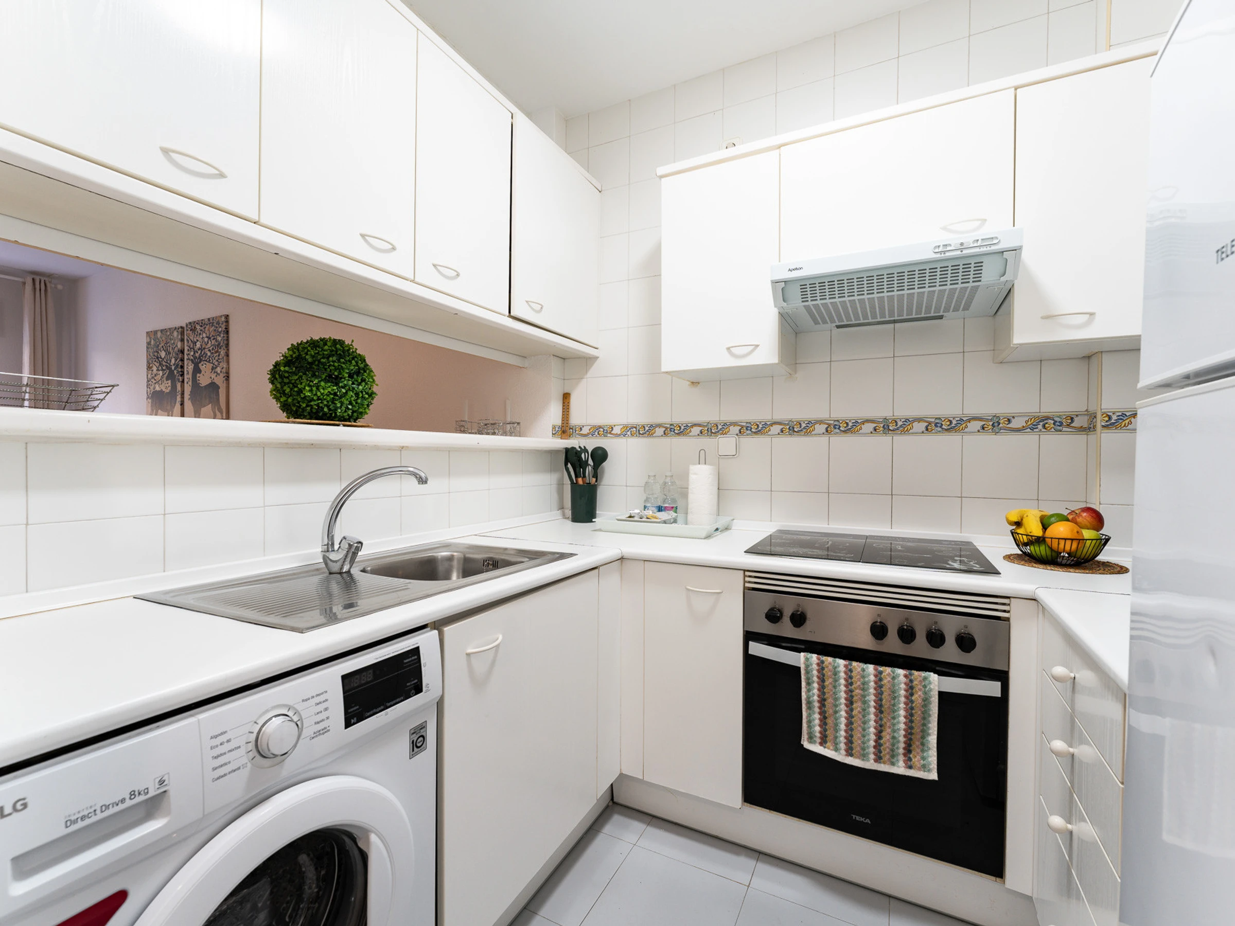 La cocina americana está totalmente equipada con electrodomésticos de última generación, incluyendo nevera, congelador, lavadora, horno, microondas, cafetera, tostadora y hervidor. Cuenta con todos los utensilios de cocina necesarios para preparar comidas deliciosas durante su estancia.