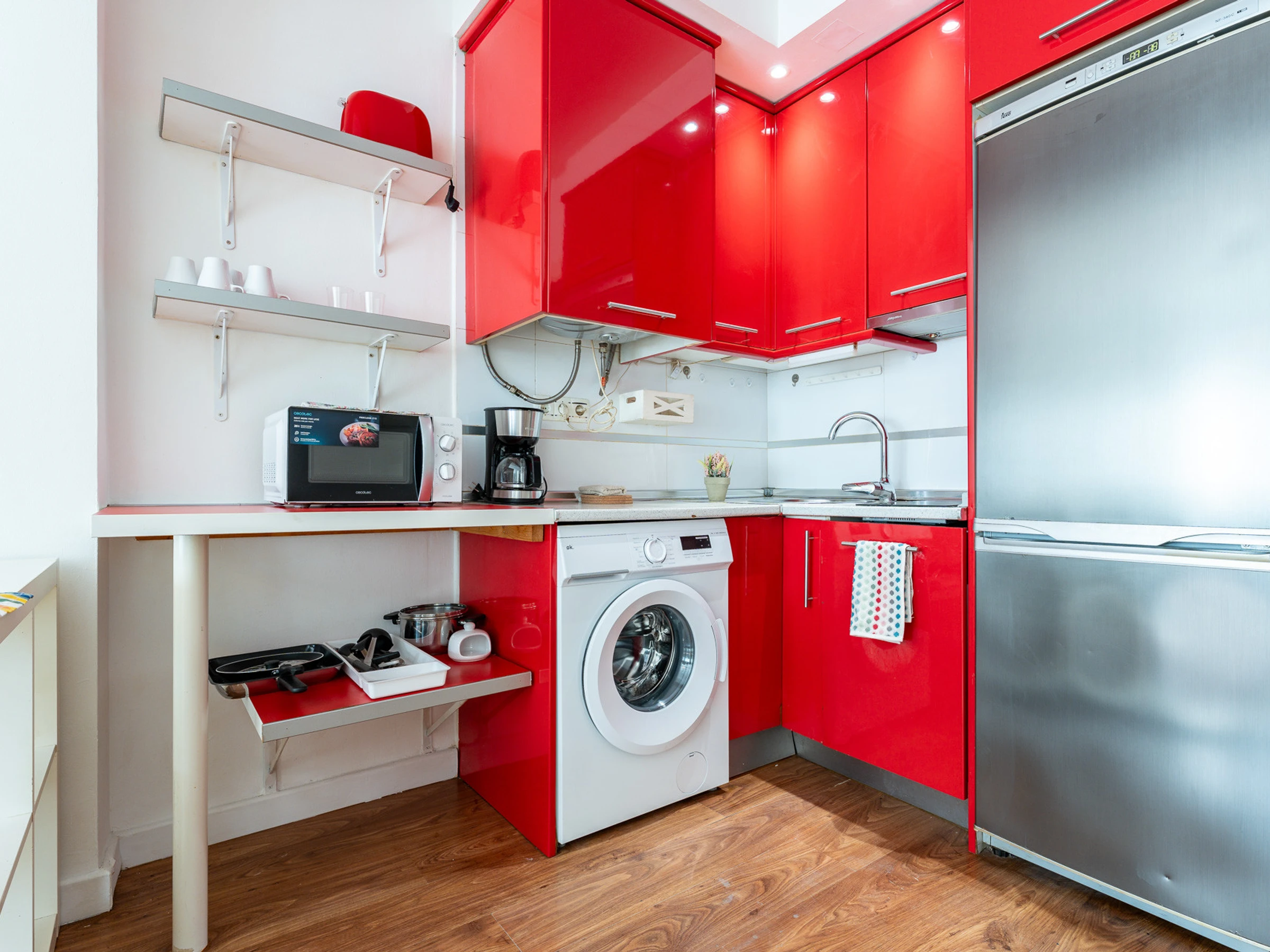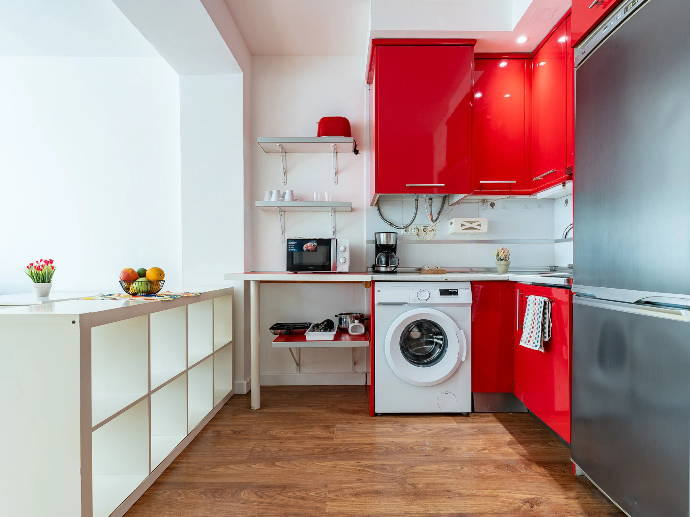La cocina está totalmente equipada con accesorios como nevera, cafetera, vajilla/cubertería, utensilios de cocina, cafetera, etc.