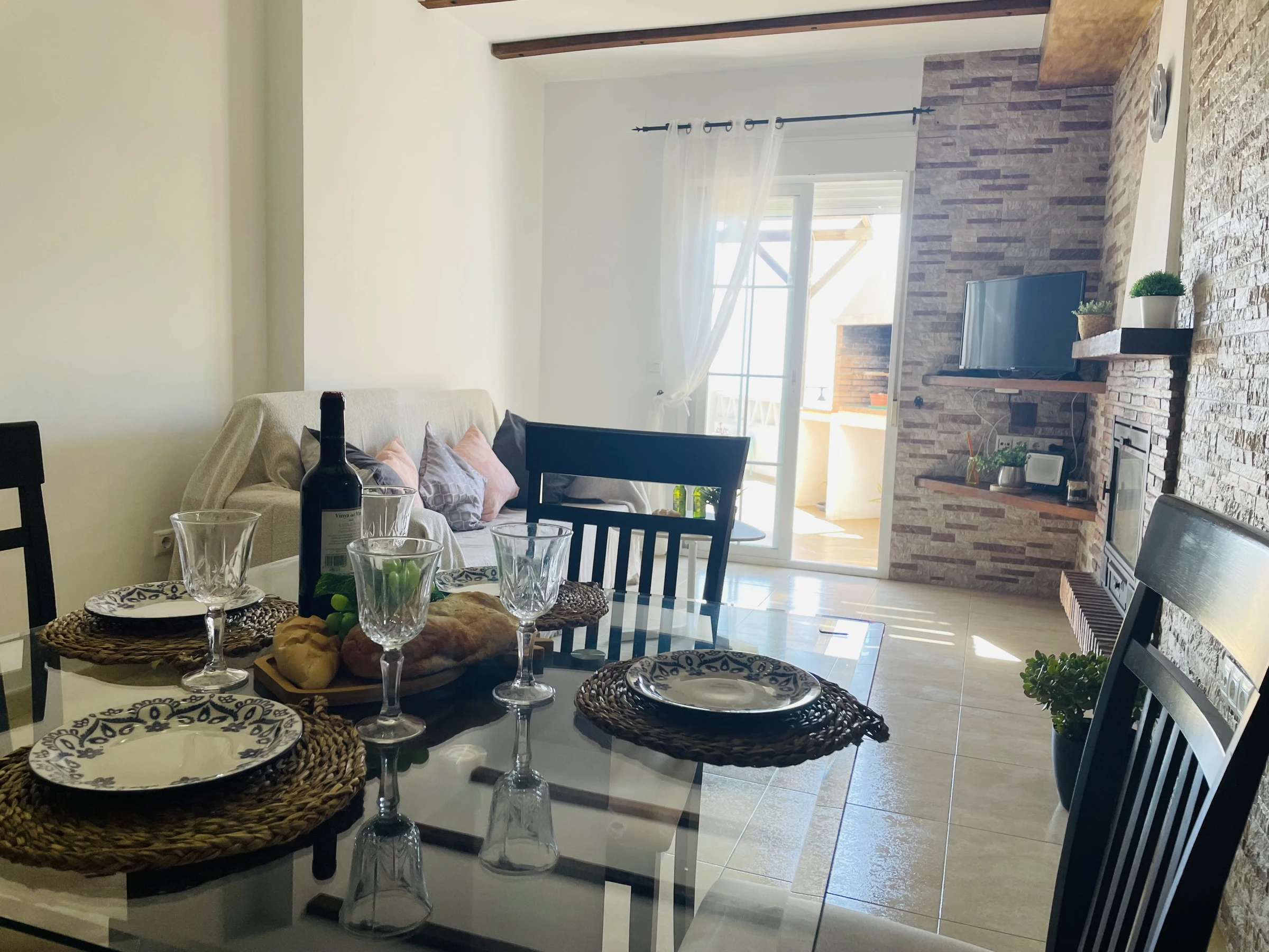El salón, amplio y luminoso, ofrece acceso directo a la terraza y está equipado con chimenea y televisor, creando un ambiente acogedor durante todo el año.