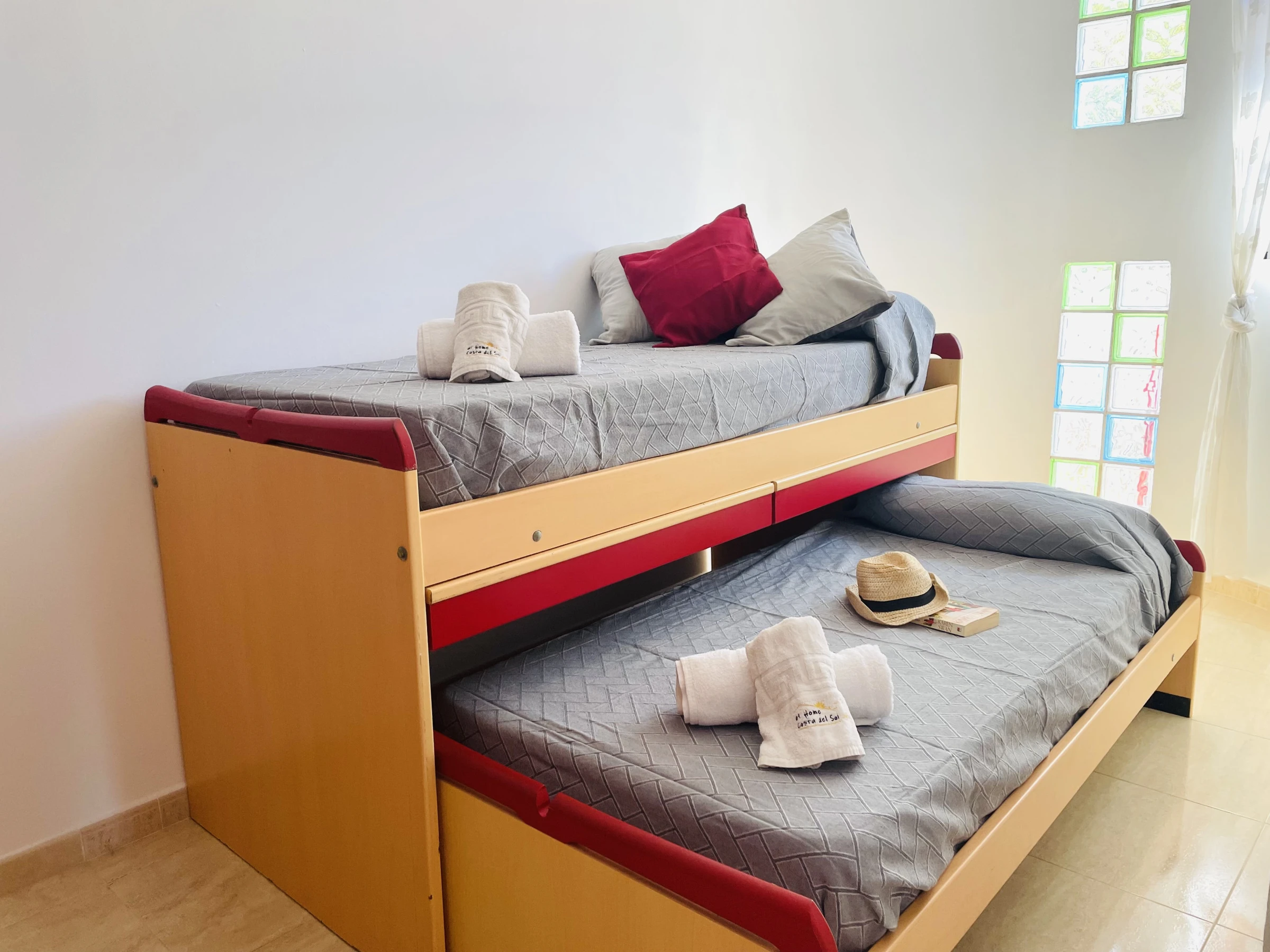 La propiedad cuenta con 3 dormitorios: uno con cama queen, otro con cama de matrimonio, y un tercero con cama nido (dos camas individuales de 90 cm), pensados para garantizar el máximo confort de todos los huéspedes. Dispone de un baño completo con plato de ducha, bidé y WC.