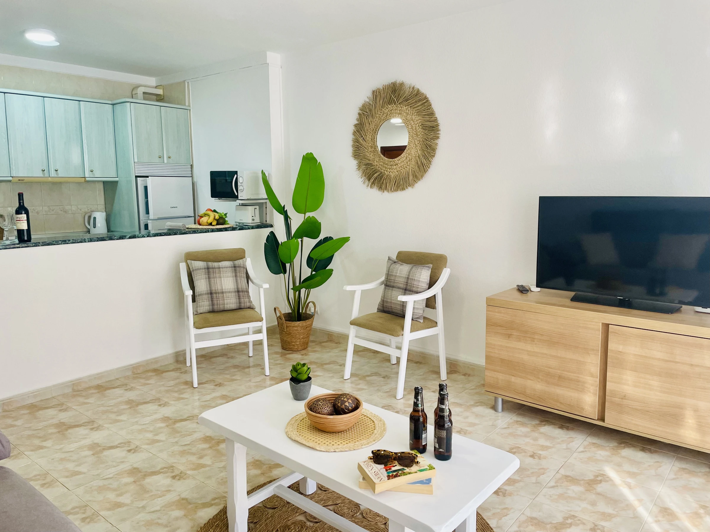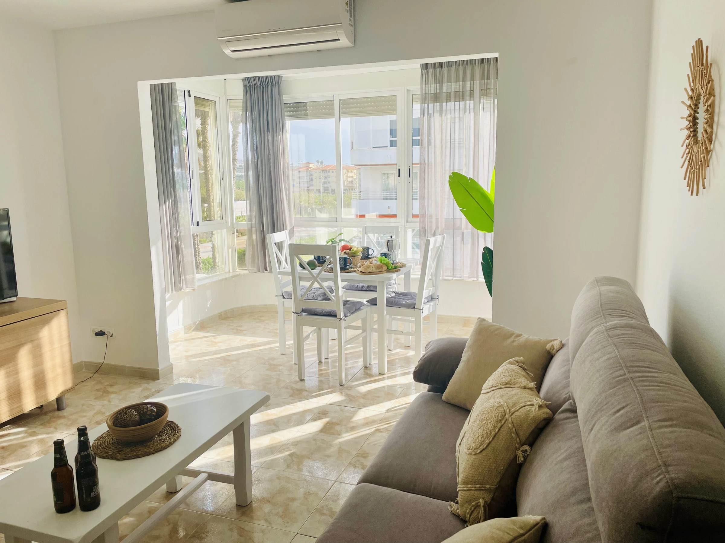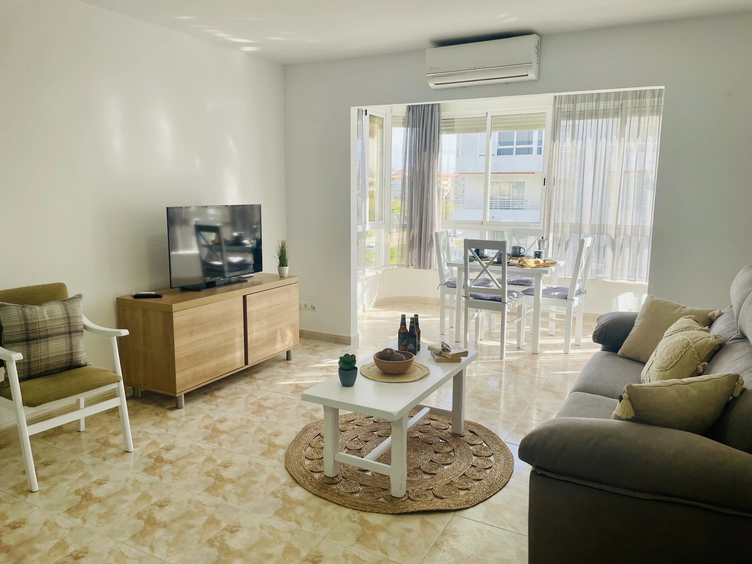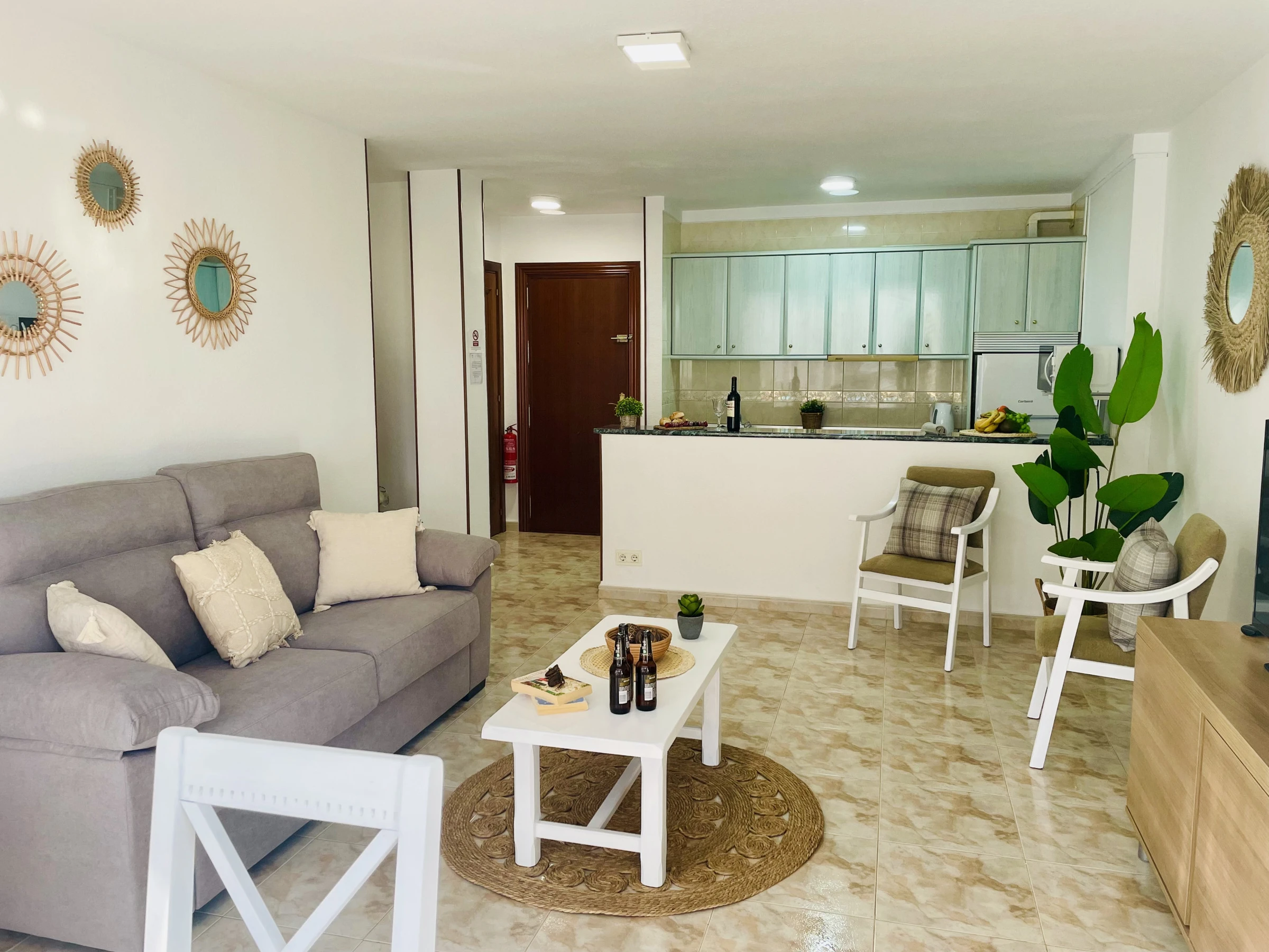 El salón con cocina americana es amplio y lleno de luz natural, equipado con aire acondicionado, TV con canales internacionales y cocina totalmente equipada, perfecta para preparar comidas mientras disfruta de la vista.