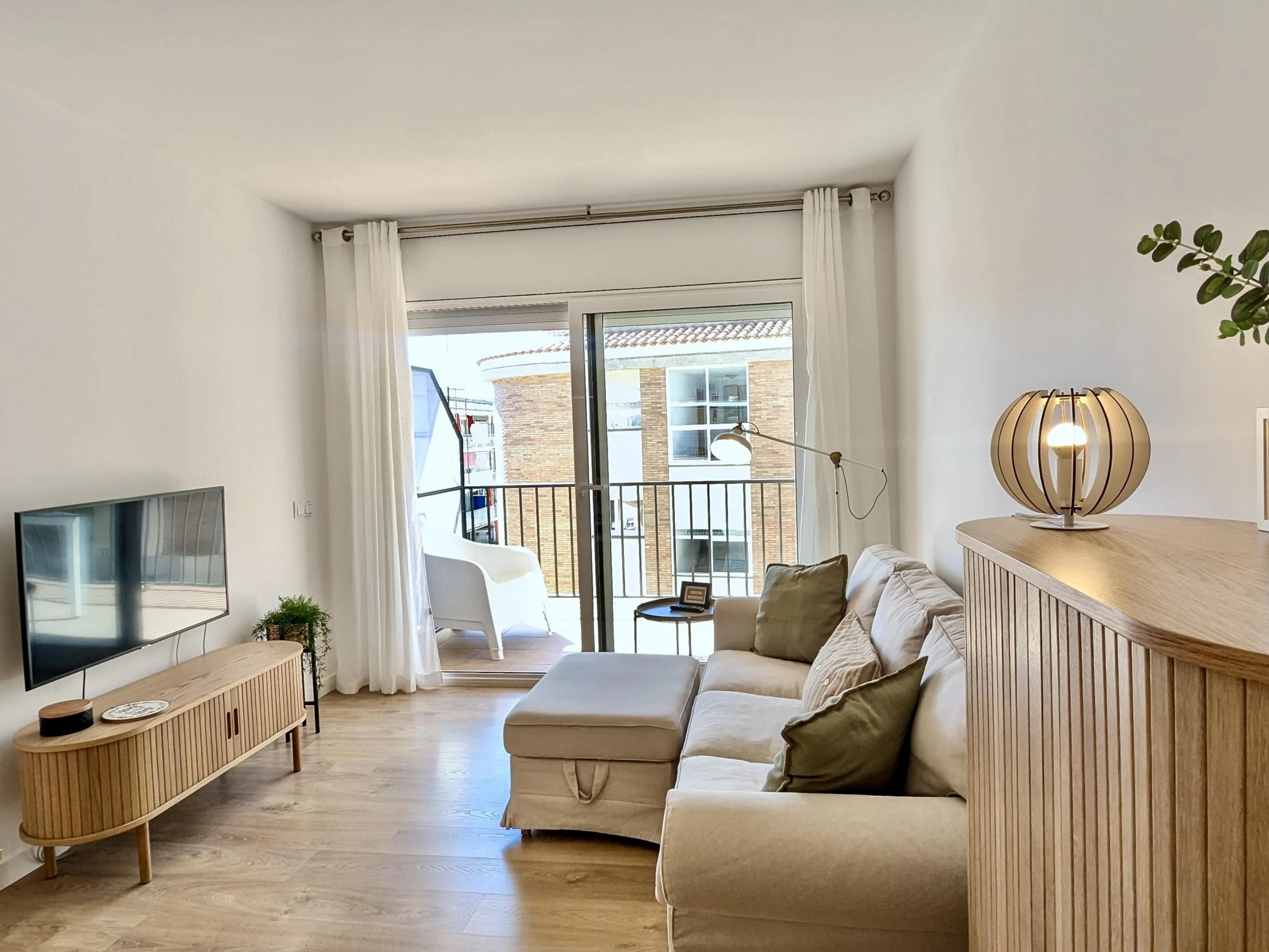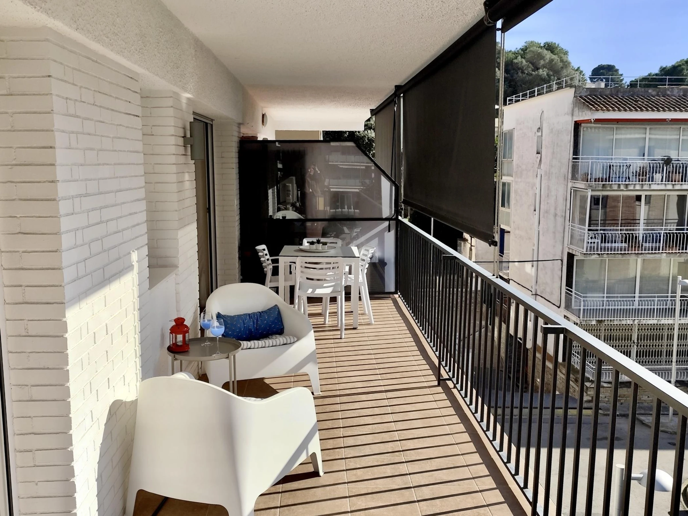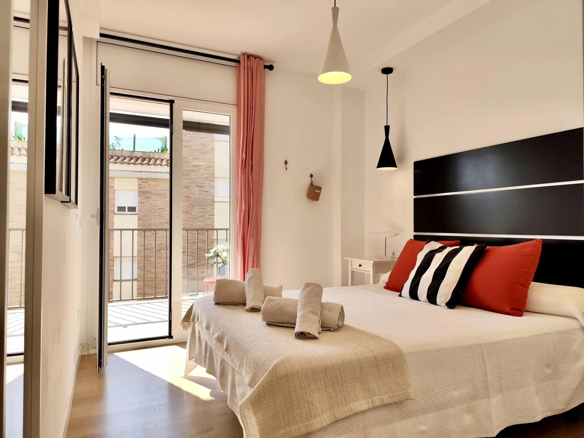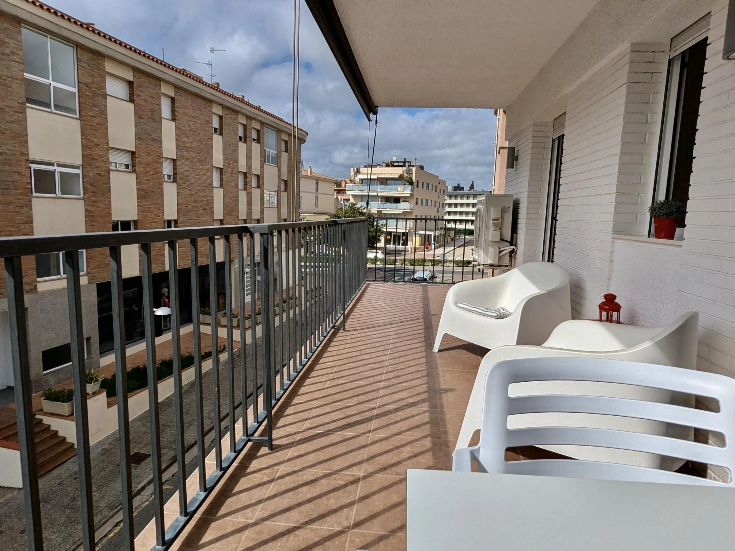 El apartamento cuenta con 2 habitaciones: una con cama doble y otra con dos camas individuales, además de un baño completo. Está completamente equipado con aire acondicionado, wifi para que puedas mantenerte conectado durante tu estancia y un gran balcón donde relajarte después de un día de playa.