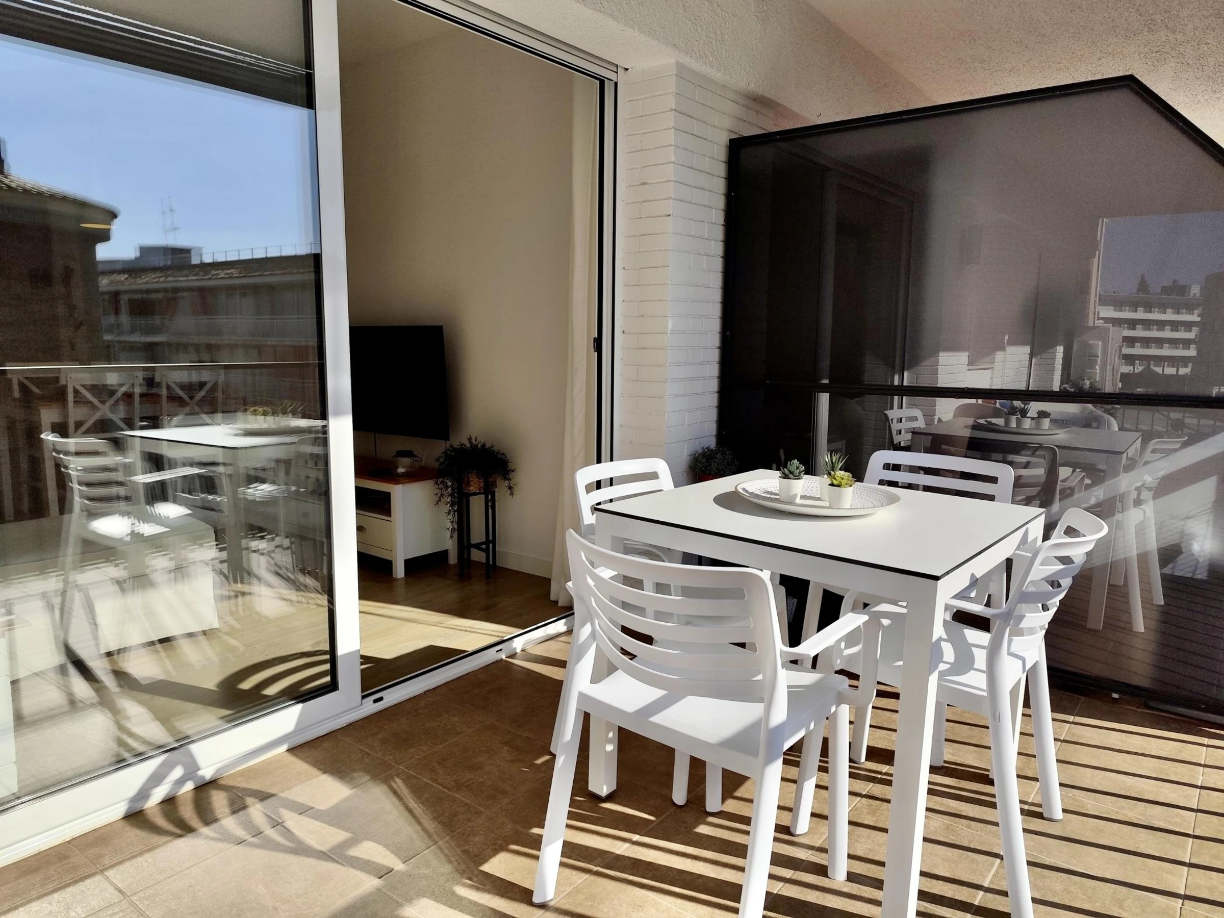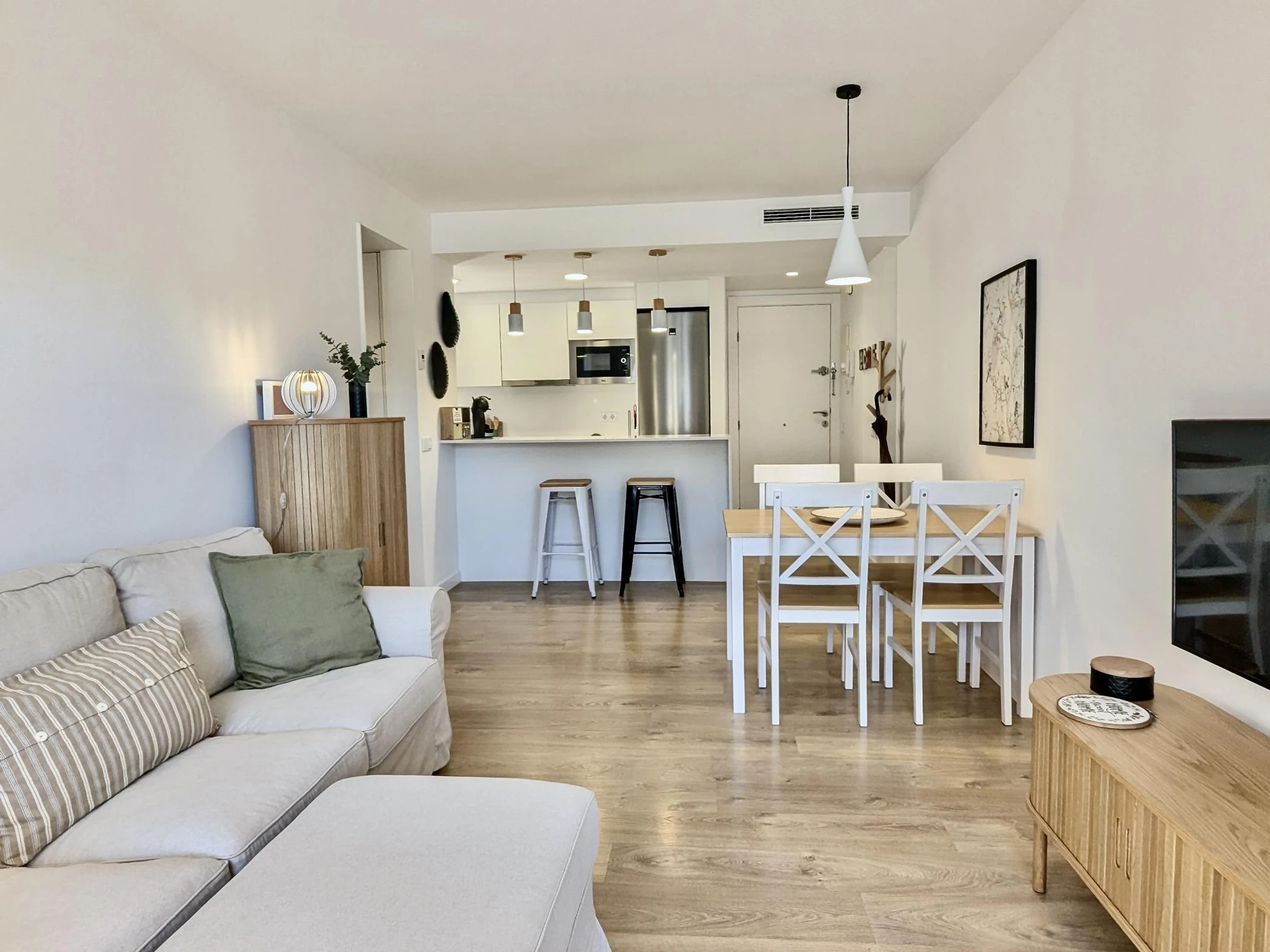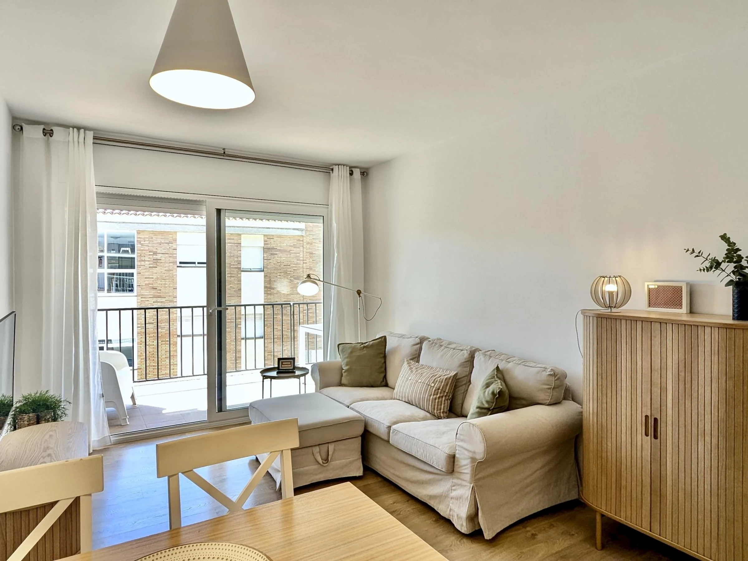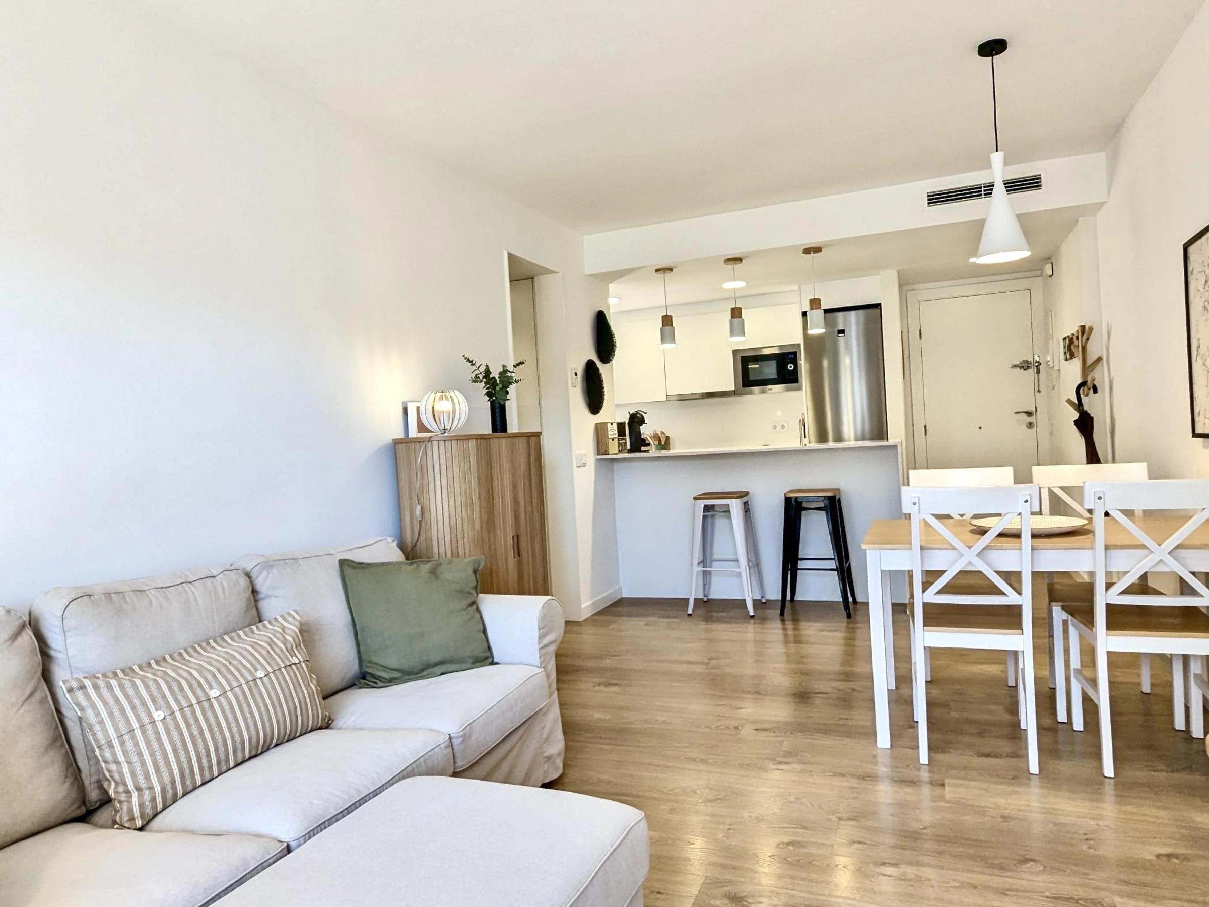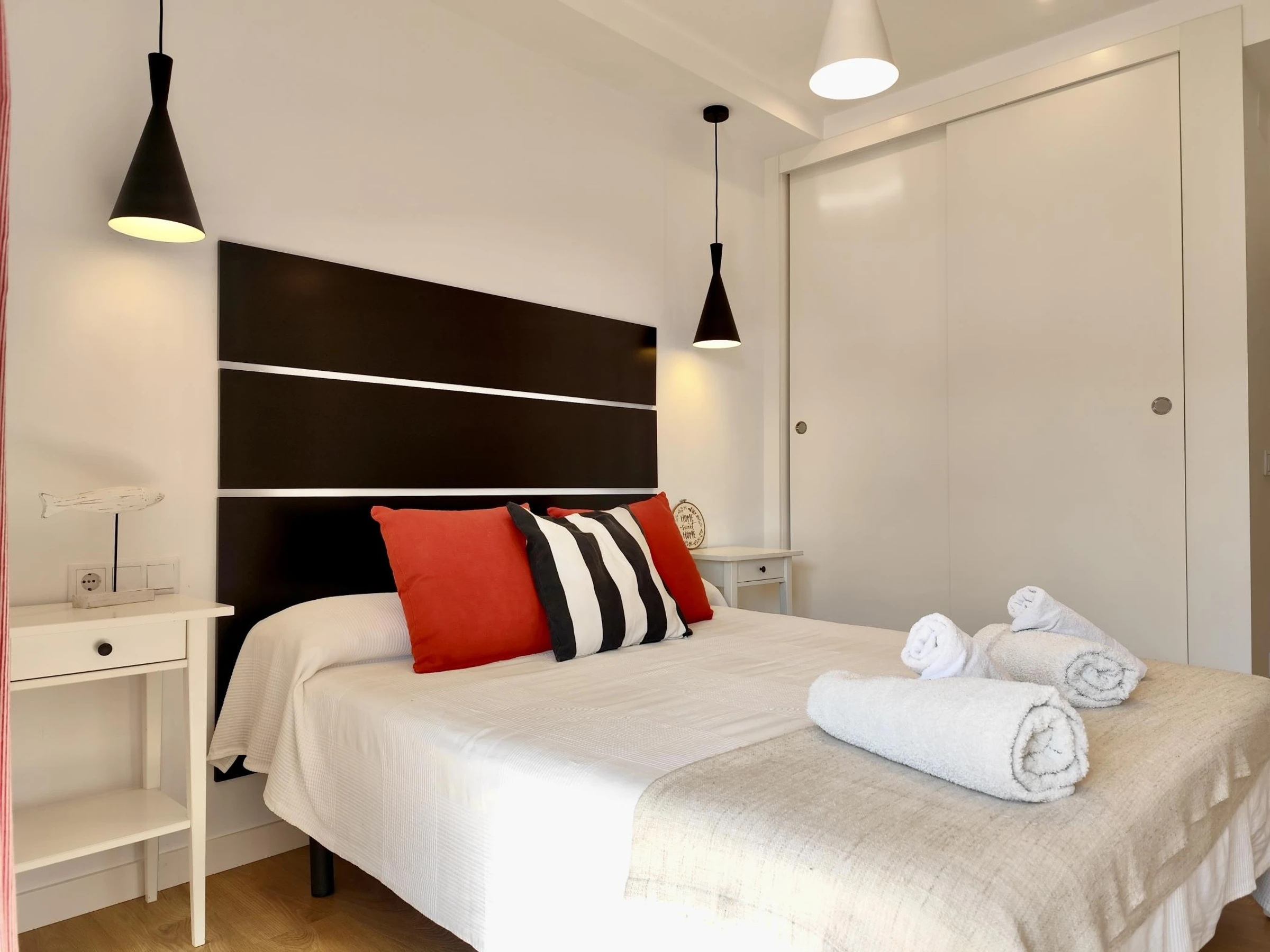 El apartamento cuenta con 2 habitaciones: una con cama doble y otra con dos camas individuales, además de un baño completo. Está completamente equipado con aire acondicionado, wifi para que puedas mantenerte conectado durante tu estancia y un gran balcón donde relajarte después de un día de playa.