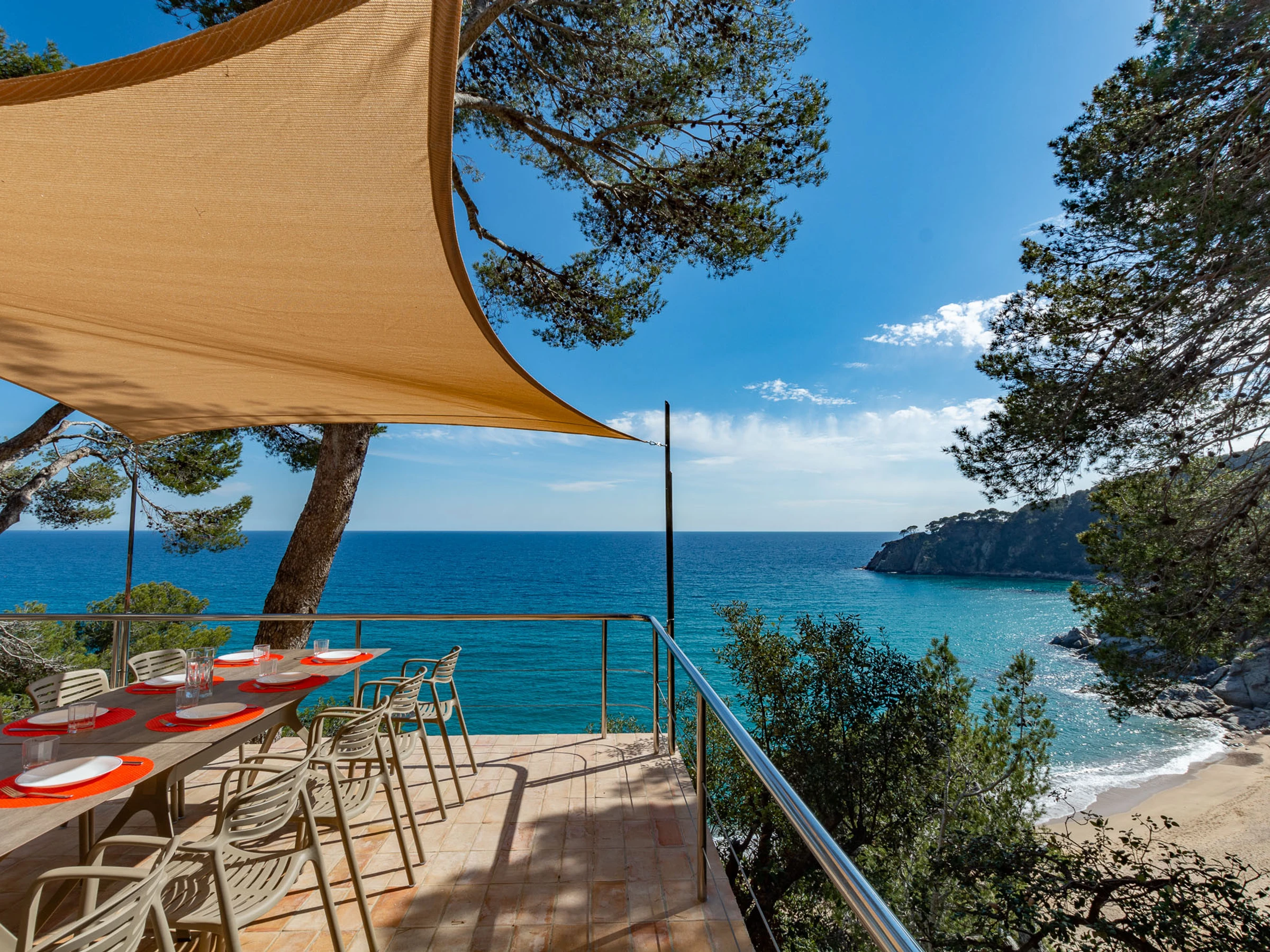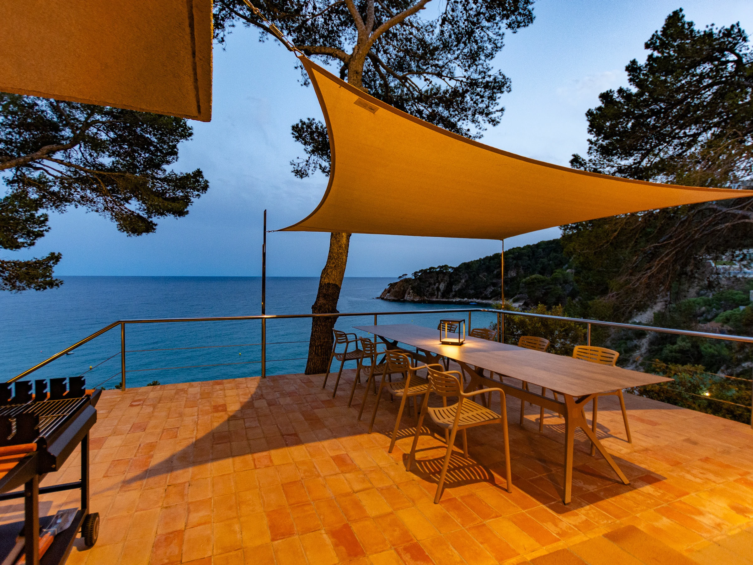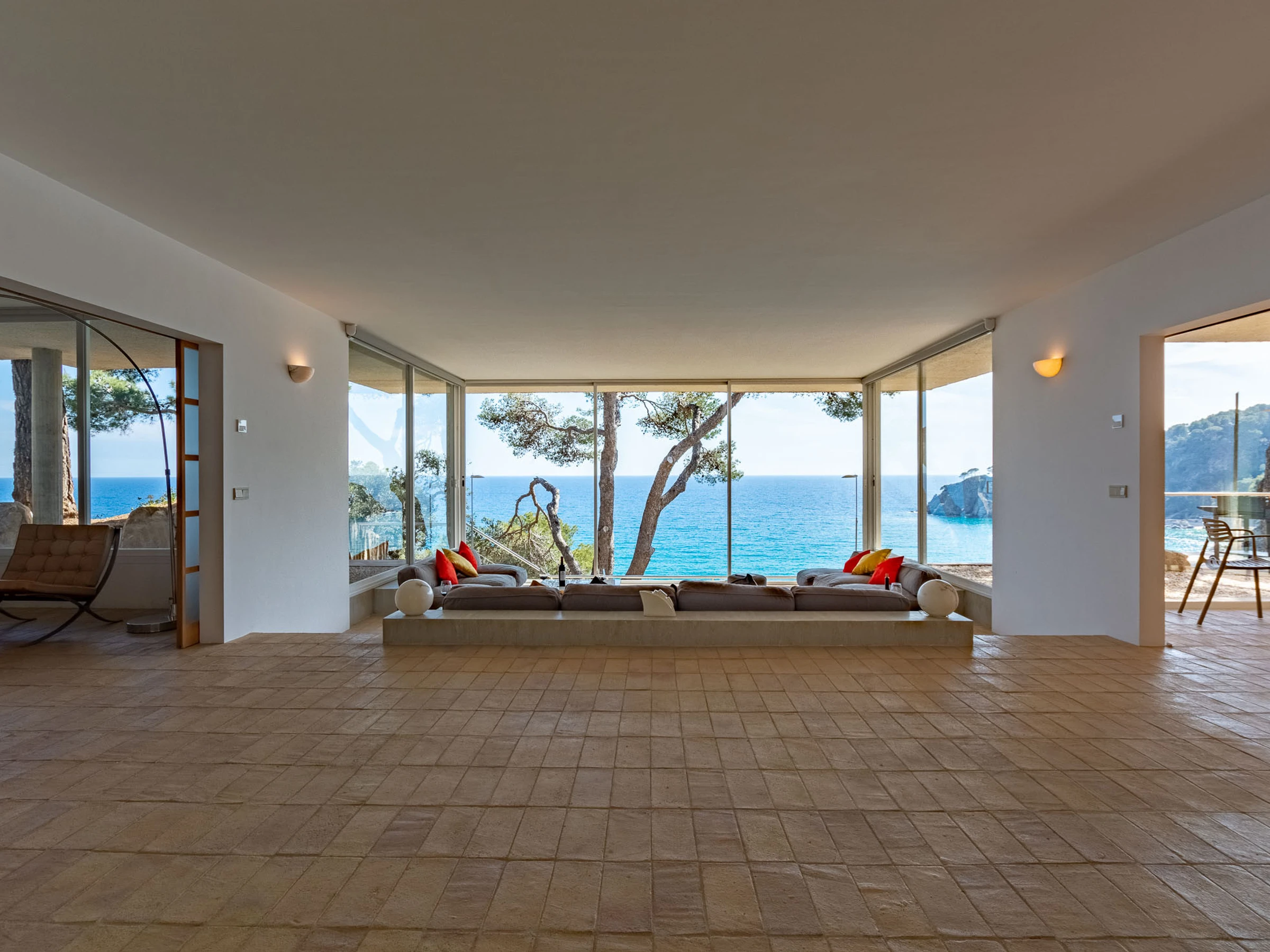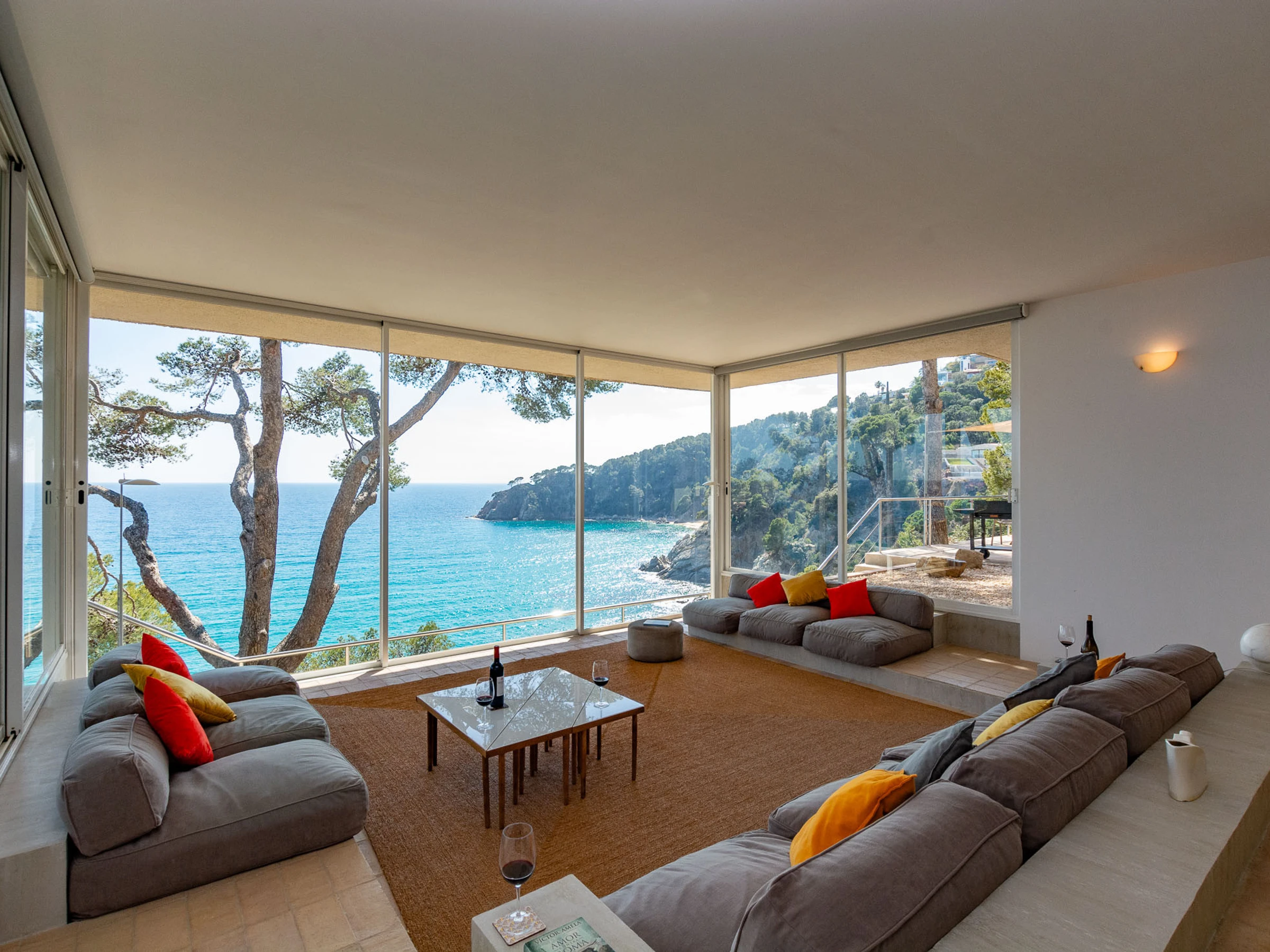 Esta espectacular villa de lujo está ubicada directamente sobre el mar, en la comunidad cerrada de Cala Santa Maria de Llorell, en Tossa de Mar.