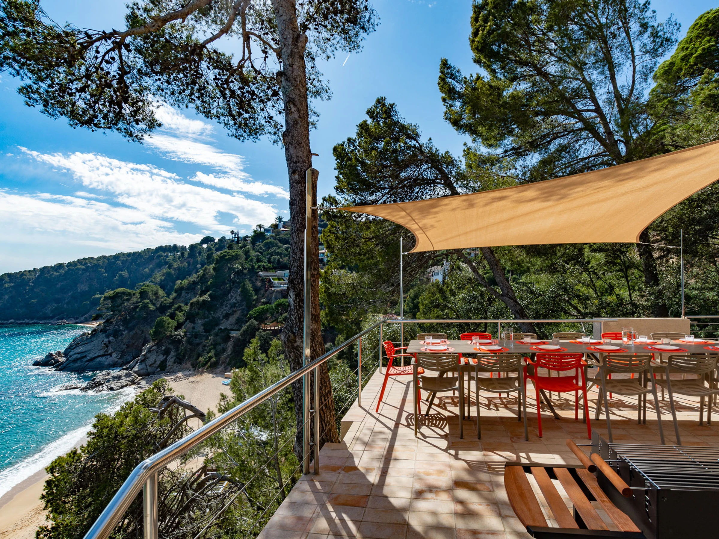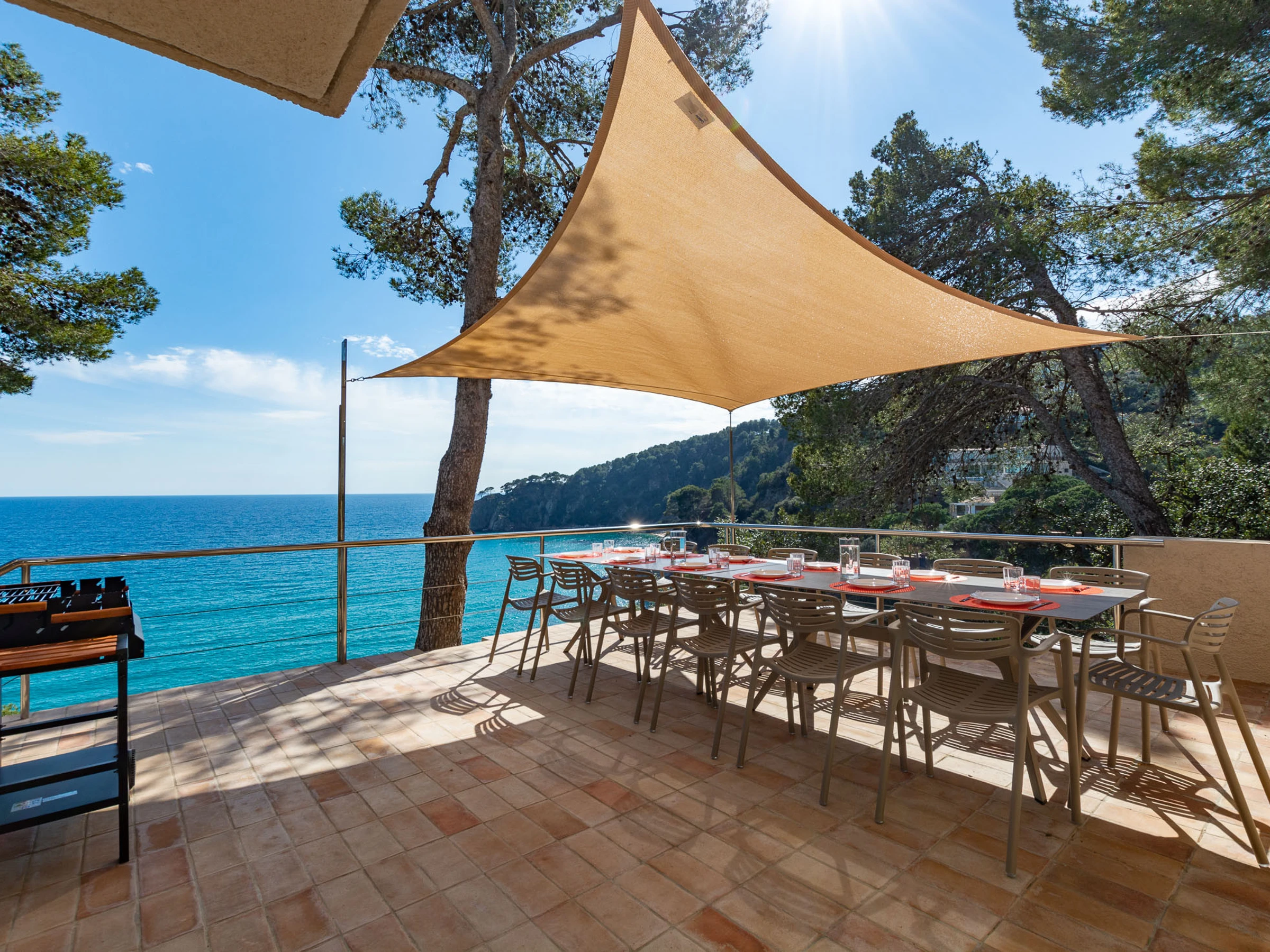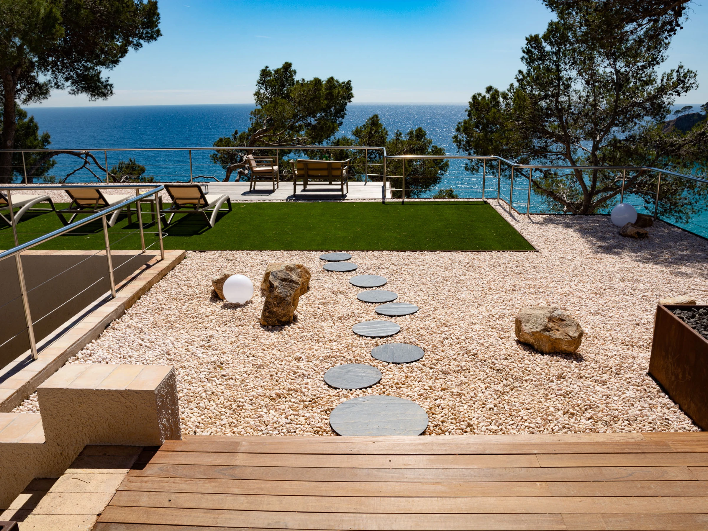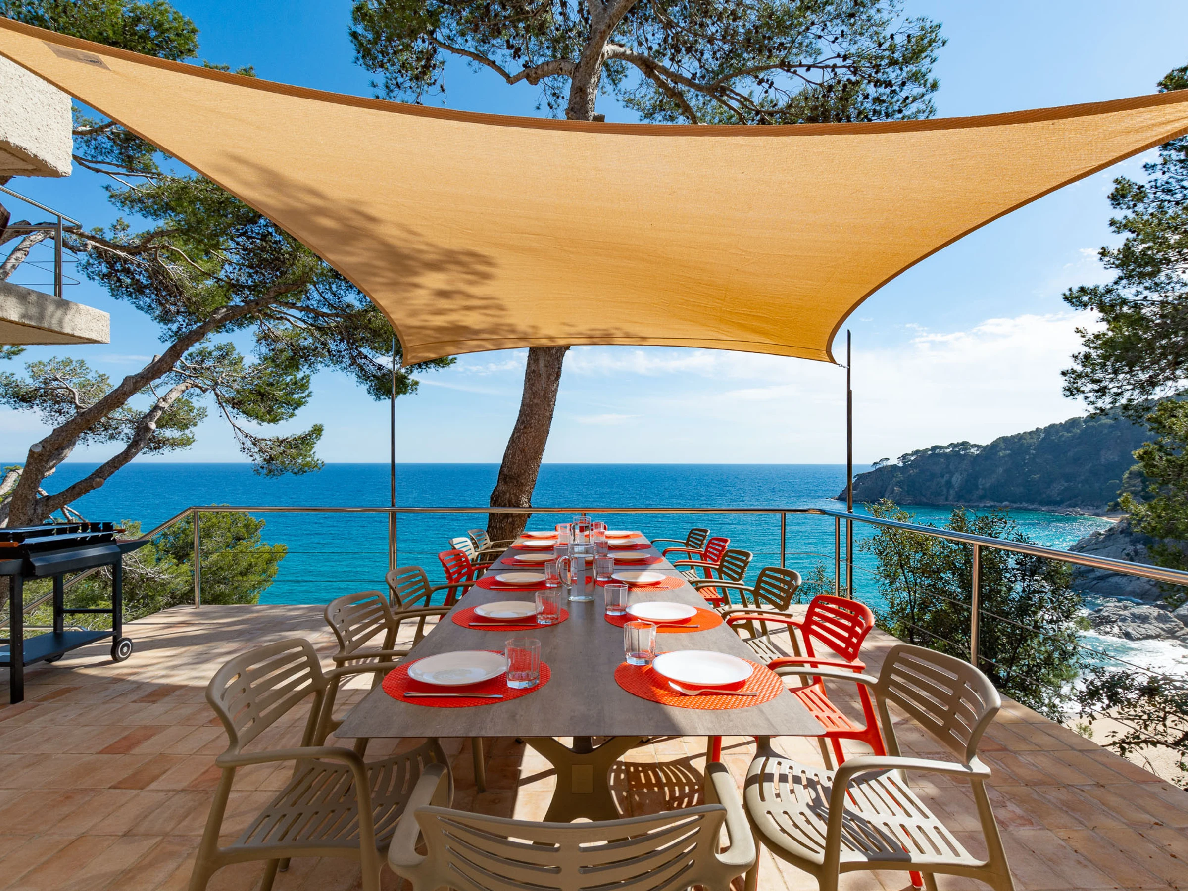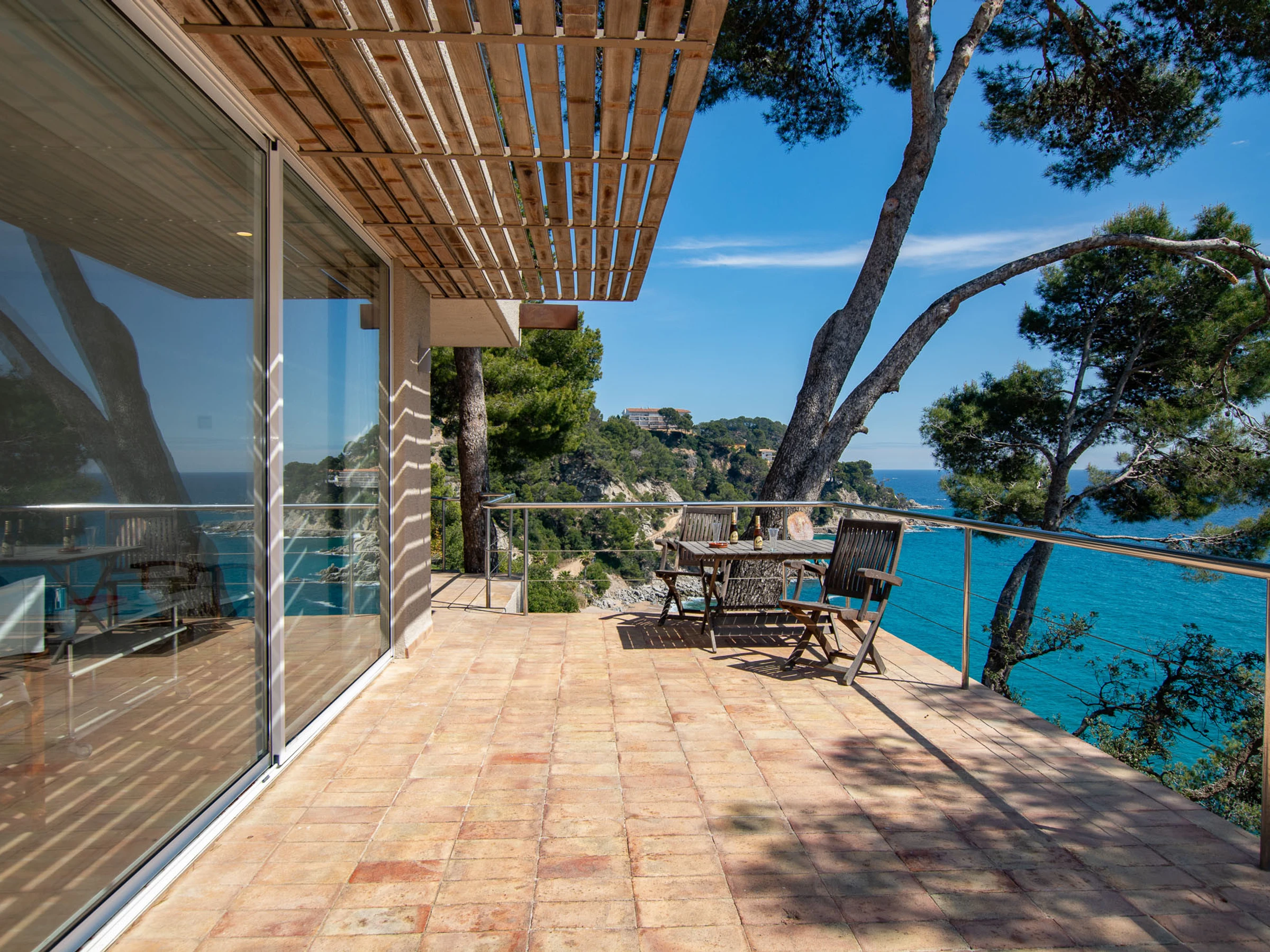 Esta espectacular villa de lujo está ubicada directamente sobre el mar, en la comunidad cerrada de Cala Santa Maria de Llorell, en Tossa de Mar.