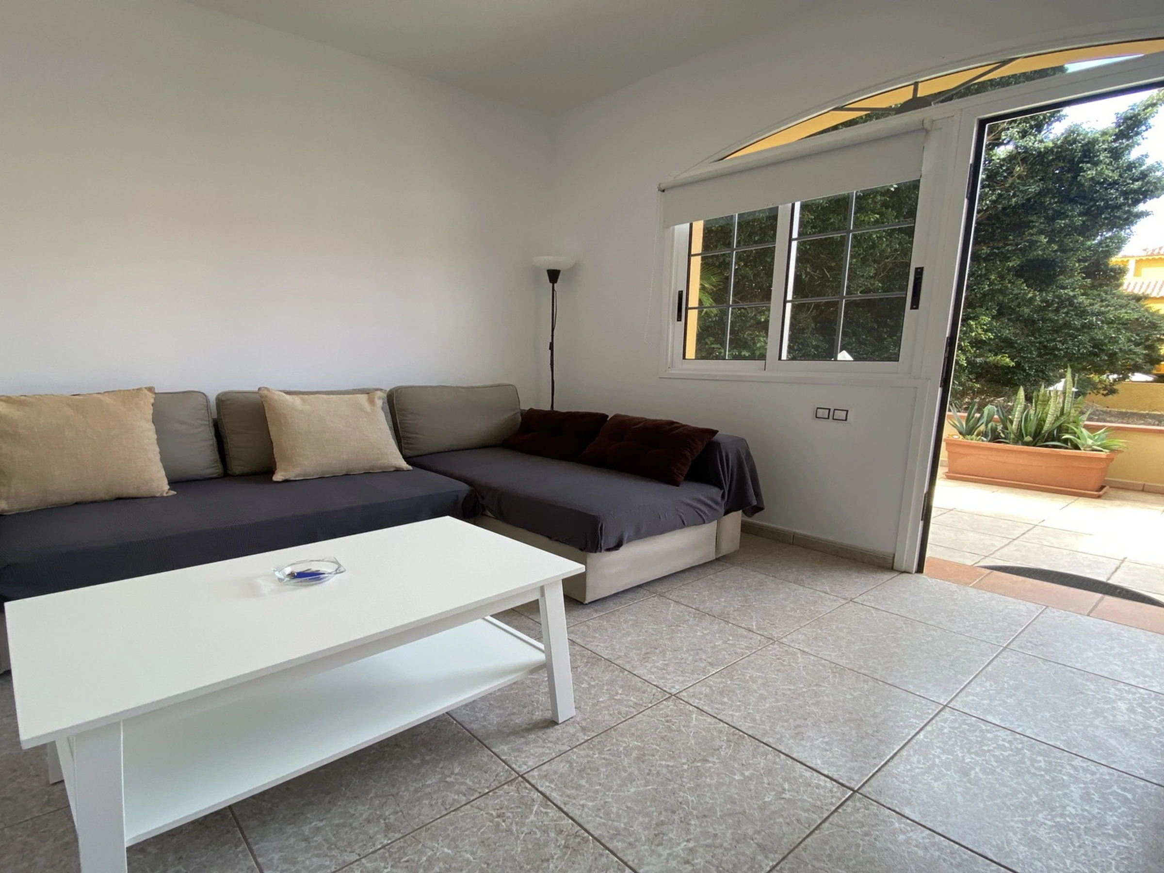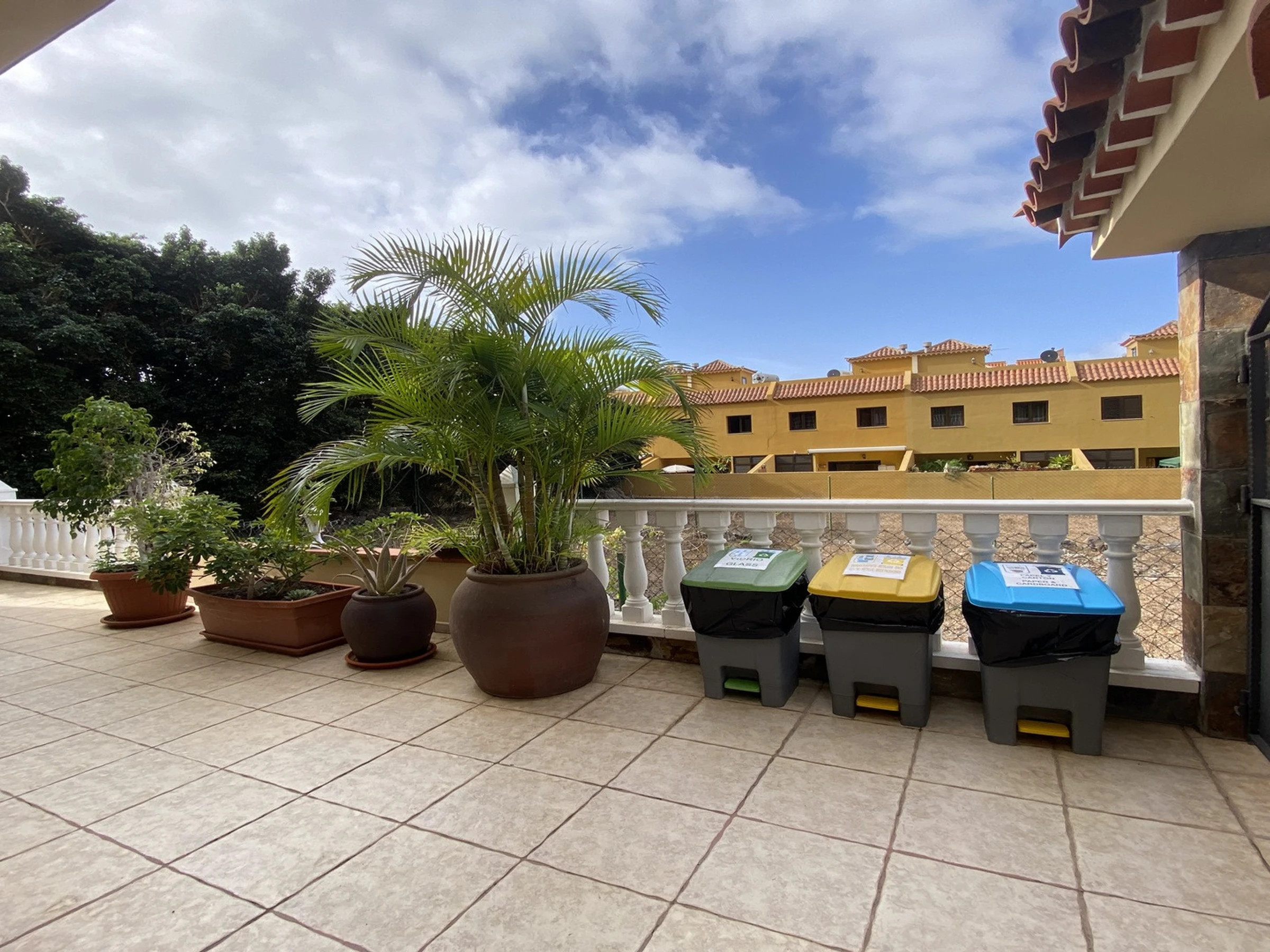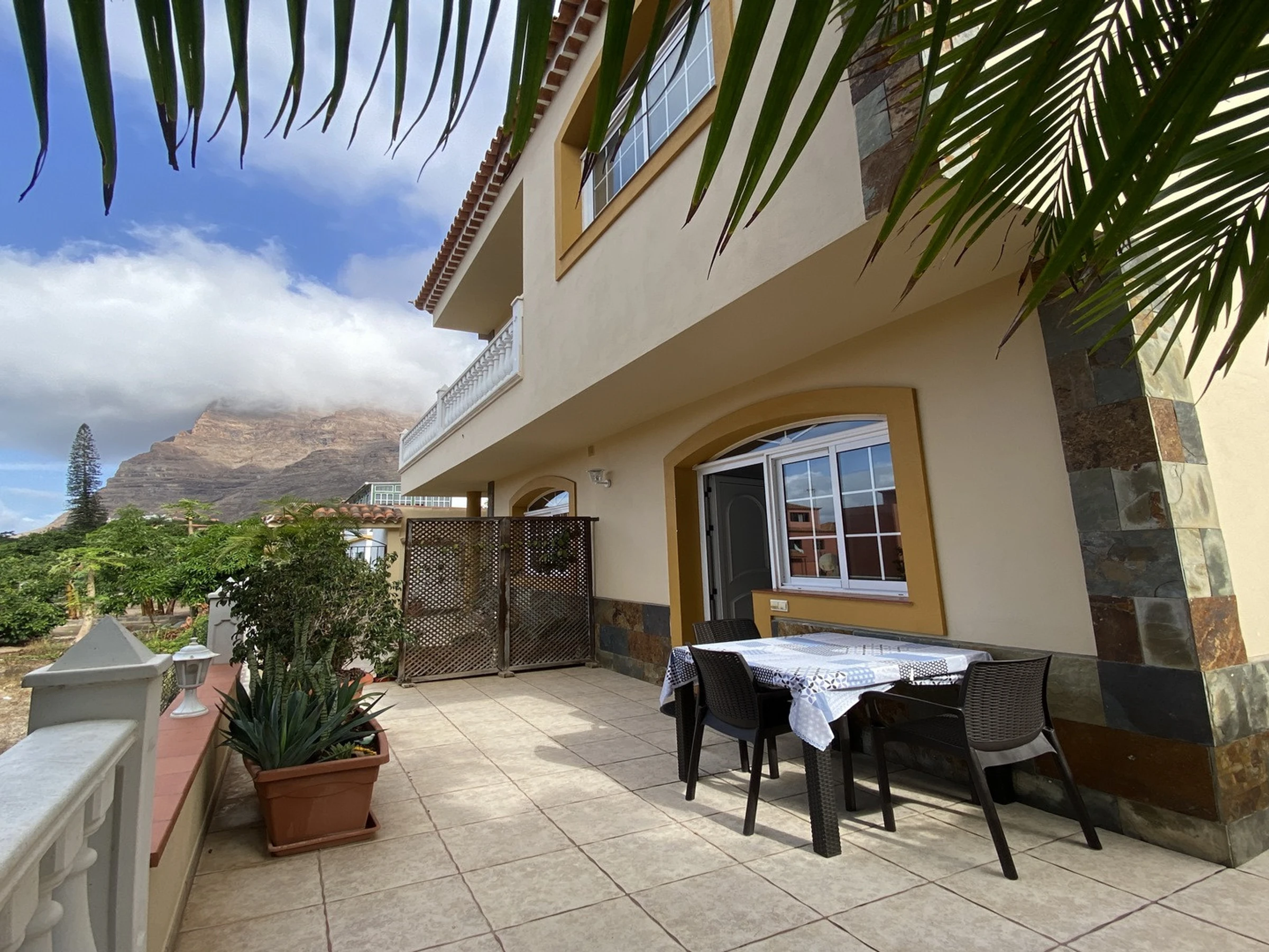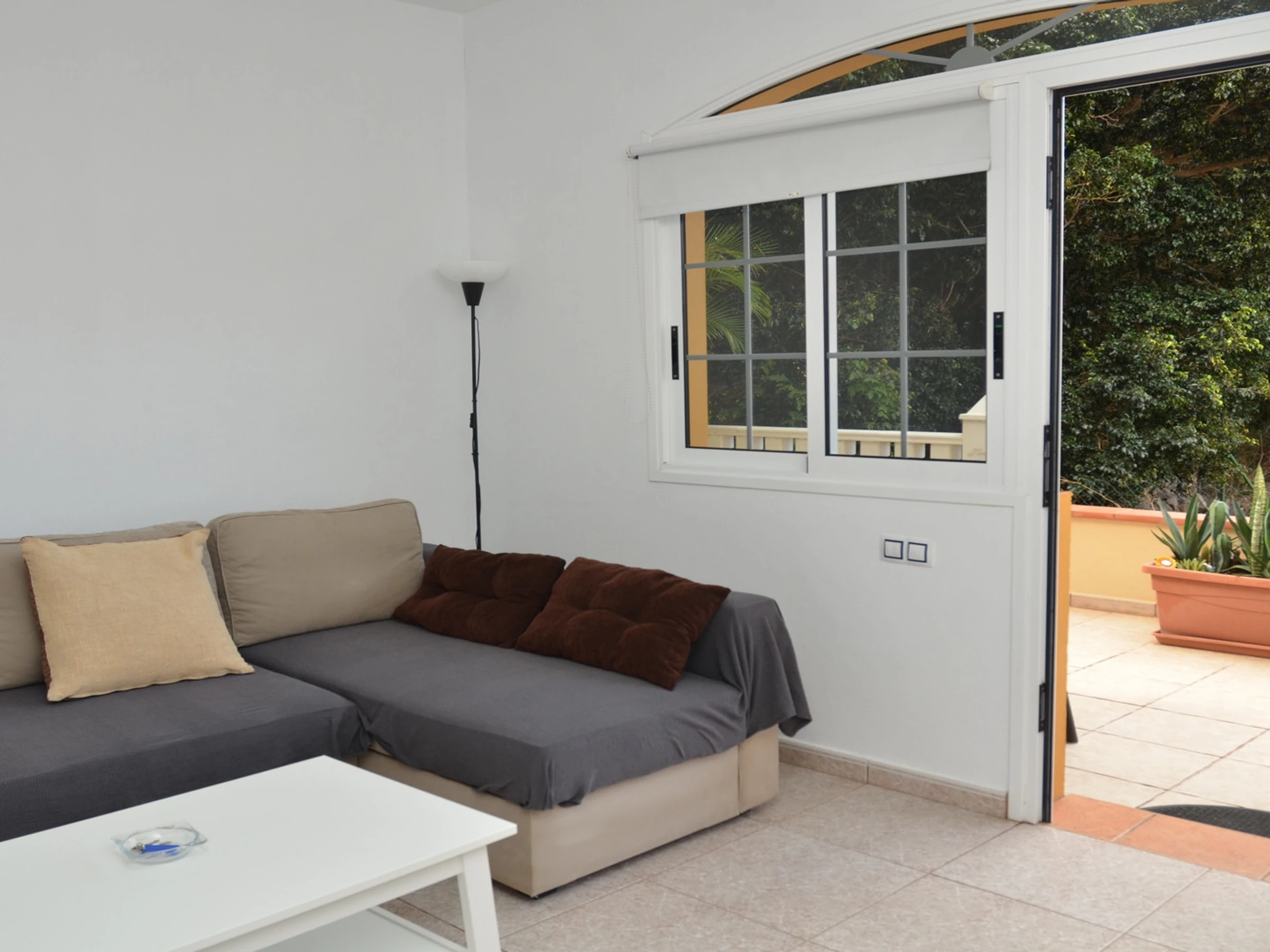 Apartamentos Passiflora son dos apartamentos en la planta baja de una casa privada, que se encuentra en una zona tranquila en el barrio de Borbalán. Desde la carretera hay que pasar por un camino de peatones de más o menos 200 m hasta la casa. Cada apartamento tiene su terraza con mesas y sillas y en común hay una azotea equipada con tumbonas. Los clientes del apartamento 1B tienen que pasar alado de la terraza del apartamento 1A para llegar a su entrada. Los apartamentos están muy bien equipados y decorados con colores alegres. Apartamento 1 B: Tiene un dormitorio con dos camas individuales, en la zona de la entrada un sofá-cama y televisión, una cocina a parte con mesa de comedor y un baño.
