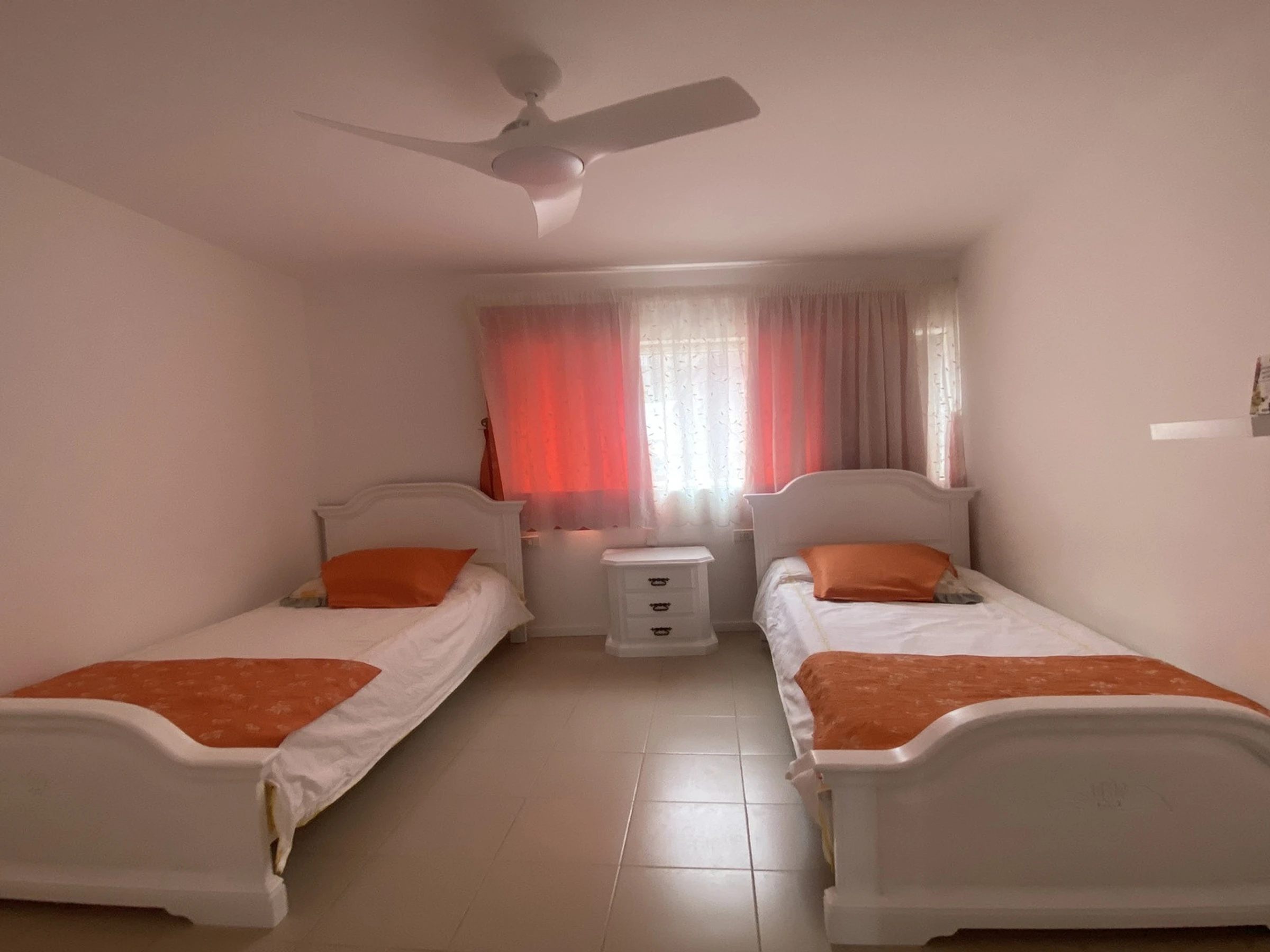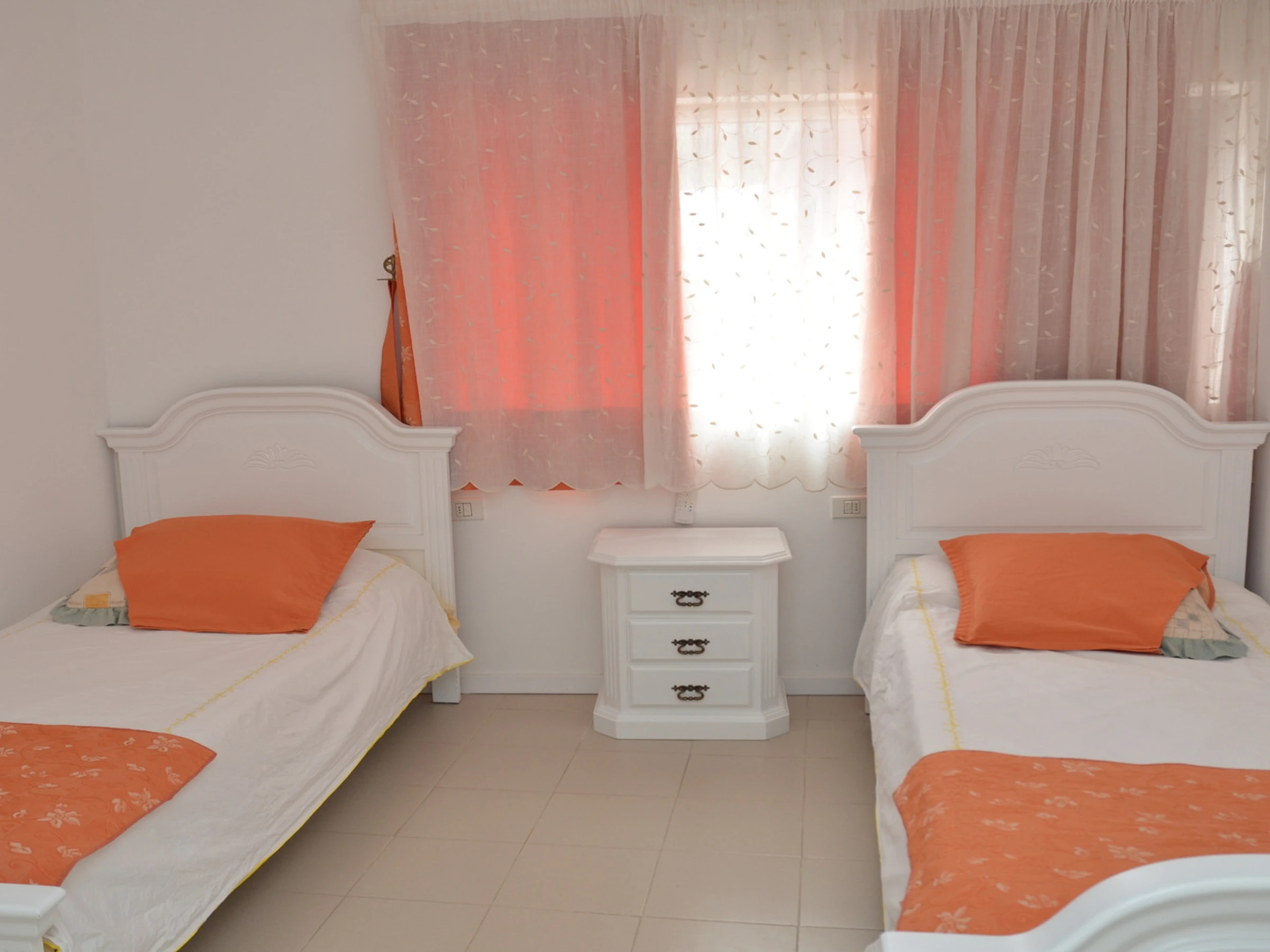 En la planta superior se encuentra la zona de descanso. La habitación principal es muy amplia y cuenta con una cama de matrimonio, armarios empotrados y acceso a una terraza privada ideal para disfrutar del aire fresco. La segunda habitación dispone de dos camas individuales. Ambas habitaciones están equipadas con ventiladores de techo, lo que asegura un ambiente agradable en cualquier momento. Un baño completo con plato de ducha se ubica también en esta planta.