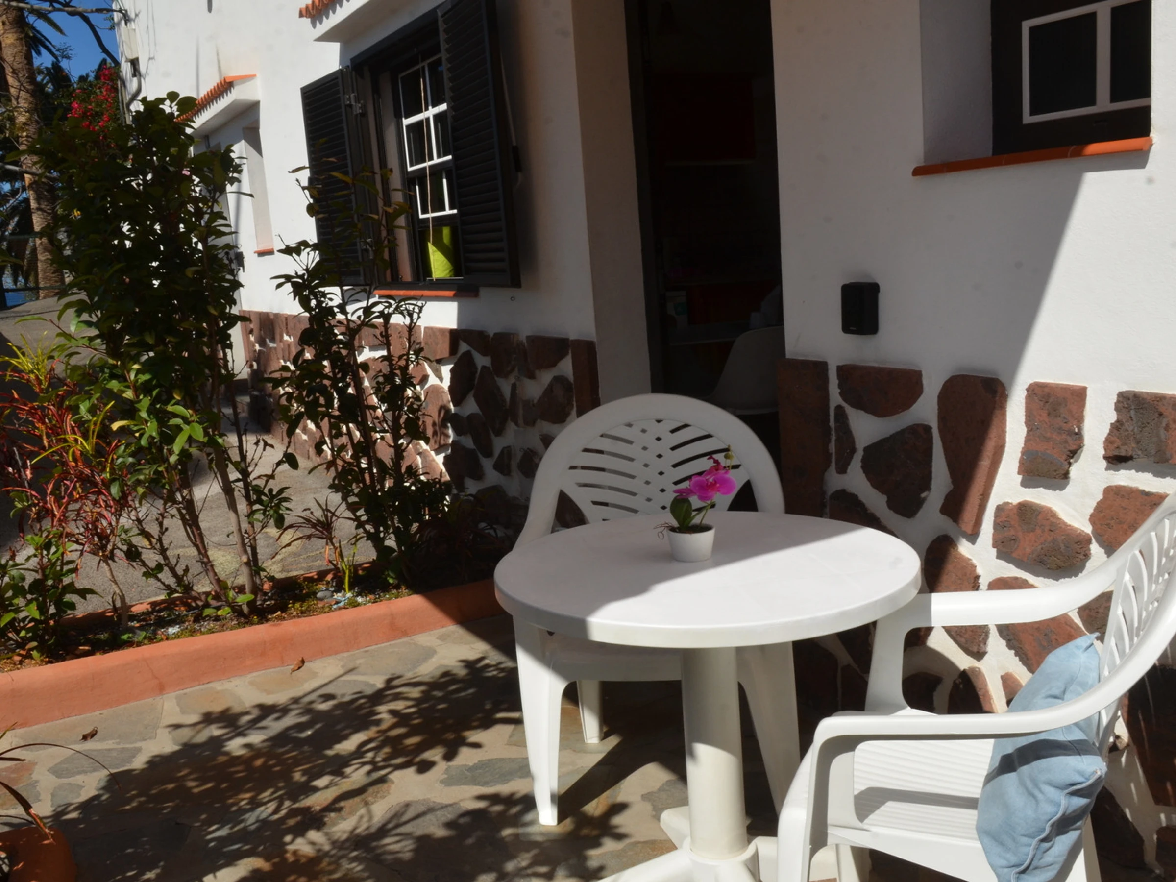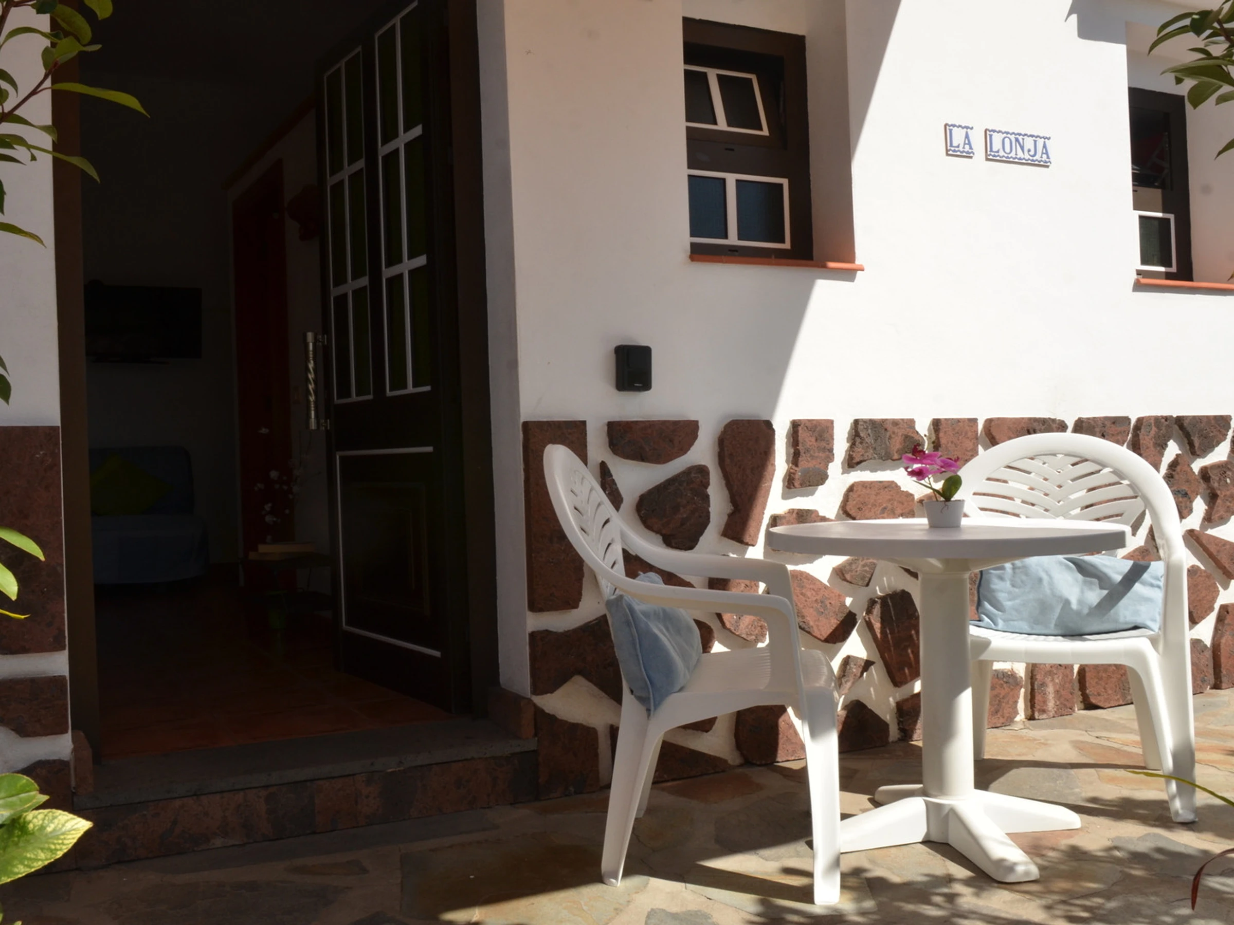 Hay una pequeña terraza delante del estudio con un toldo y una mesa con dos sillas de exterior para uso de los clientes.