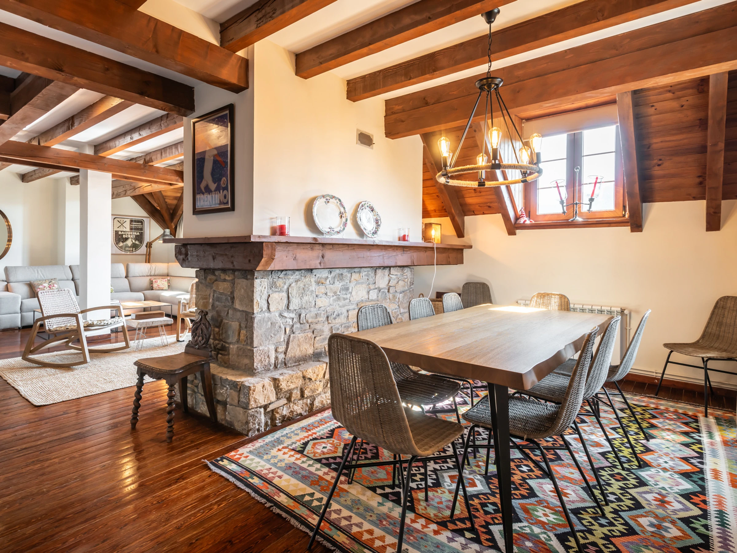 Al llegar al bloque del edificio subes por las escaleras a la segunda planta y al entrar encontrarás un amplio salón amueblado con cómodos sofás donde cae mucha luz natural y enfrente una chimenea, toda esta zona es ideal para disfrutar todos juntos por ser grande. Al lado opuesto de la chimenea está el salón comedor que también tiene ventanas para disfrutar de las vistas. Al lado está también la cocina, un área cerrada completamente equipada con cocina, horno, cafetera eléctrica, microondas, una cocina funcional. La mesa de comedor es para 8 personas. Se pueden añadir 2 sillas más.