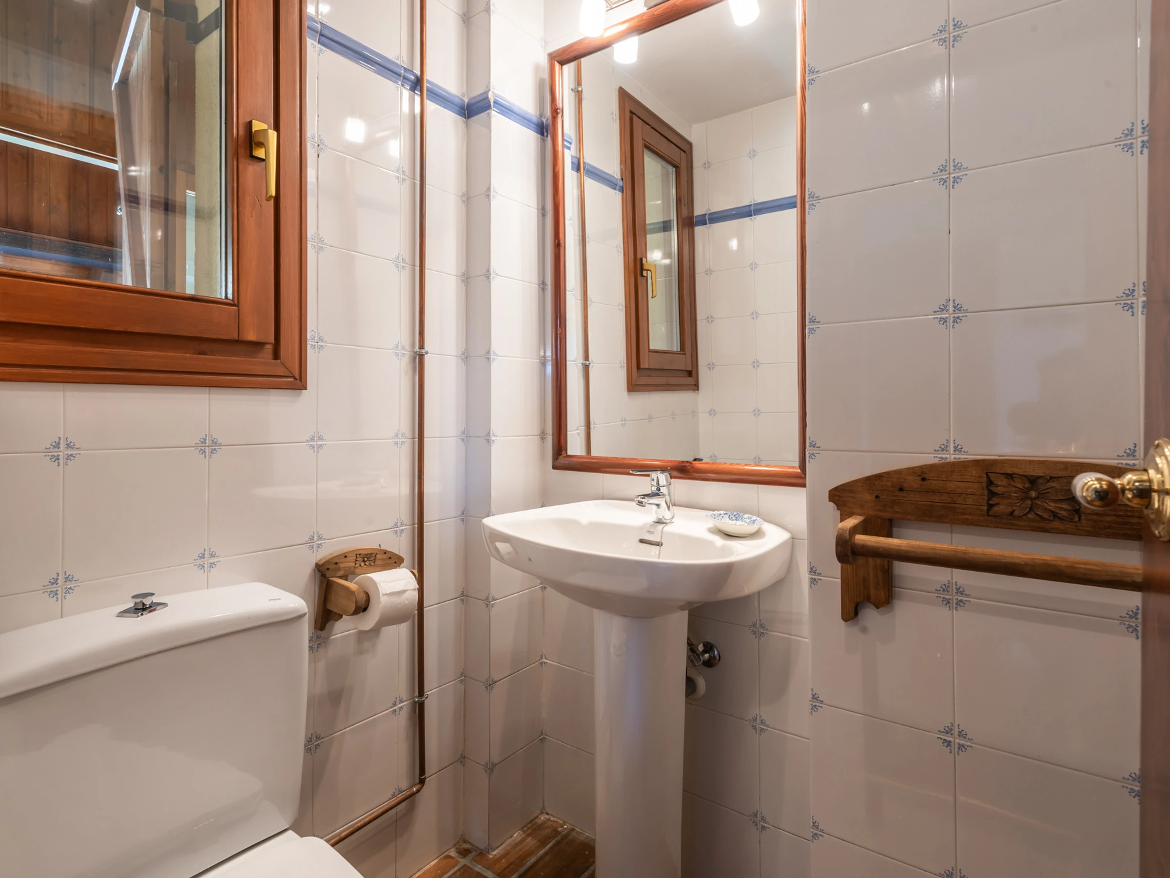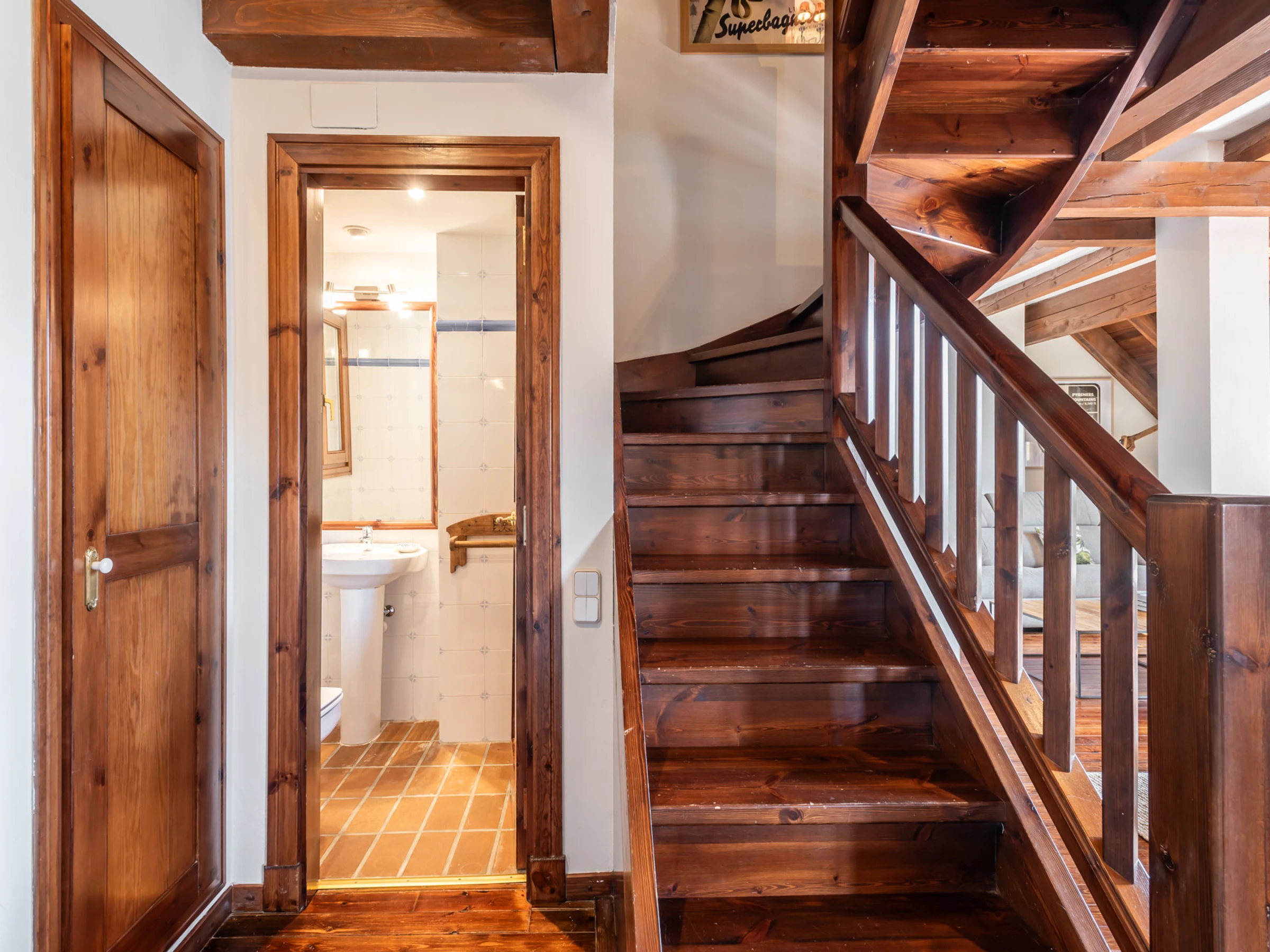 En la entrada de la casa en el recibidor encontrarás un armario para dejar chaquetas y luego veras un aseo de invitados. La escalera de madera al segundo nivel está justo en este punto.