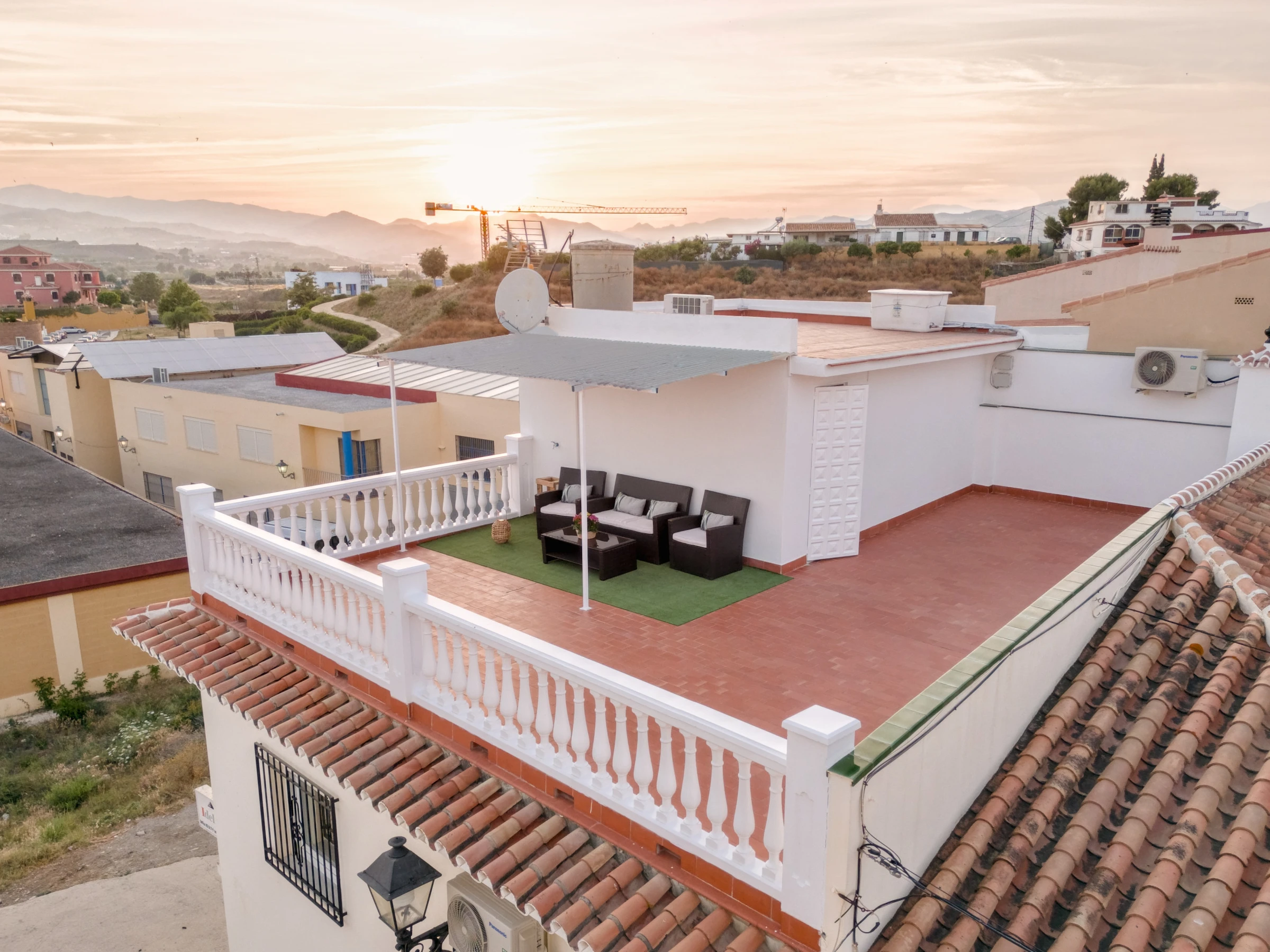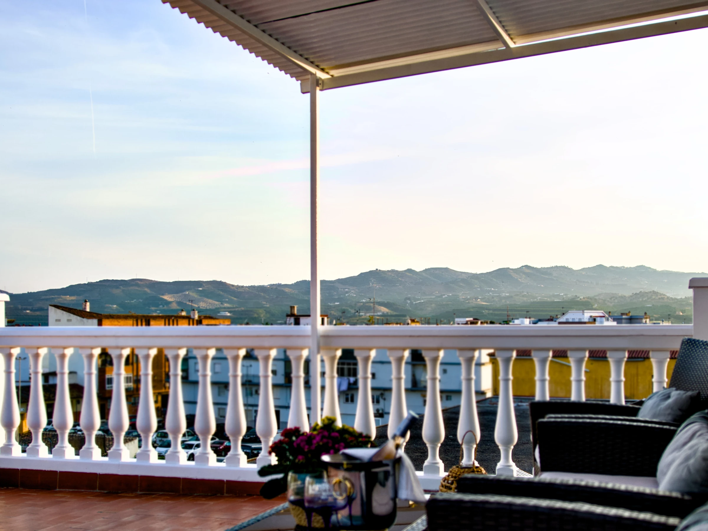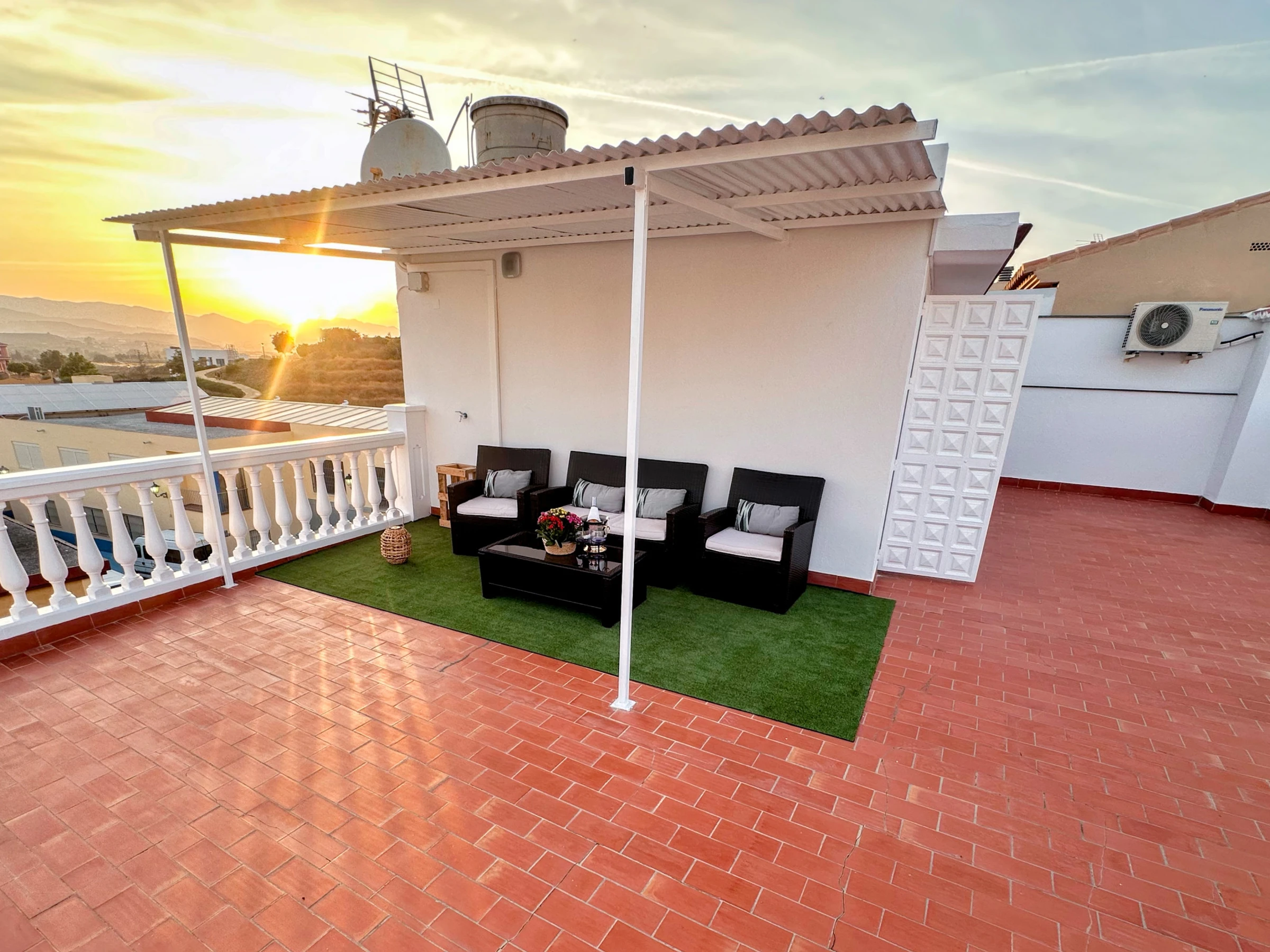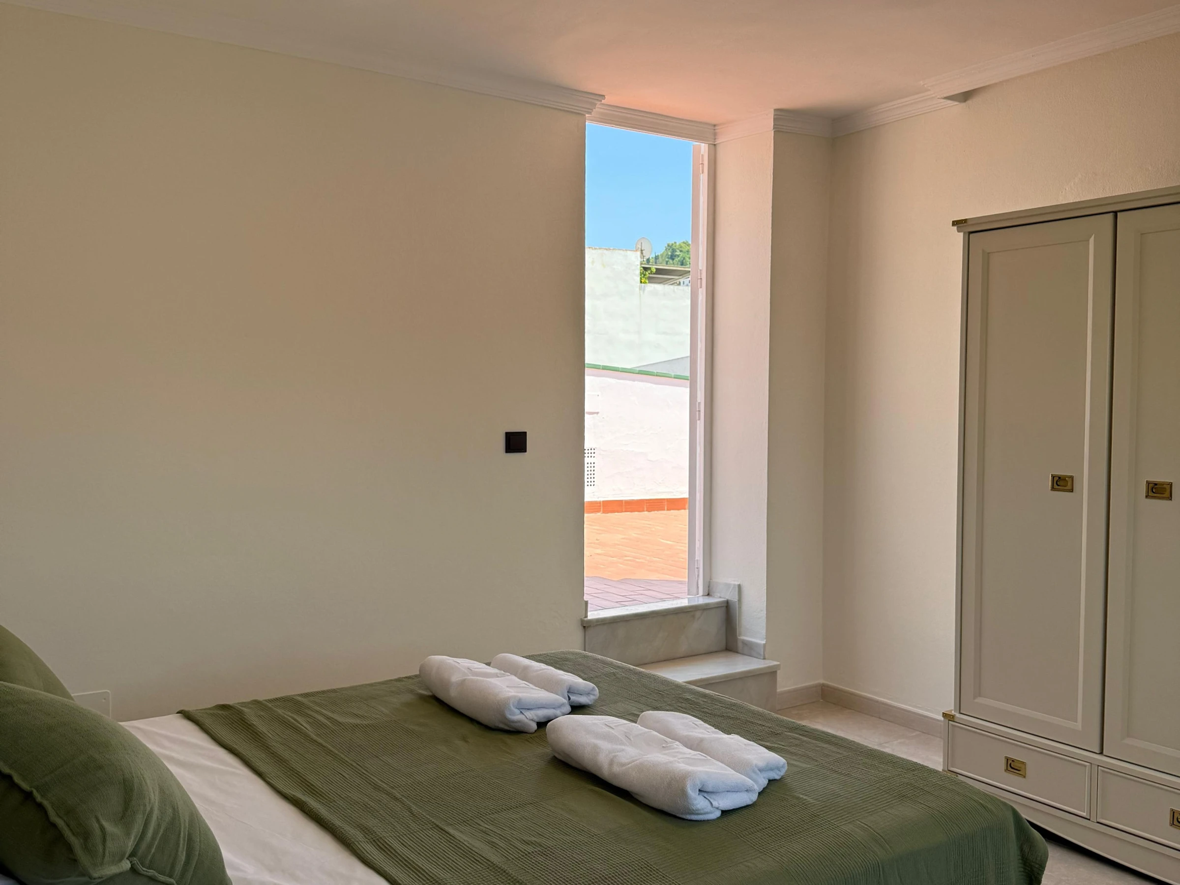 Planta superior: segundo dormitorio también con cama doble y acceso a una terraza privada con vistas panorámicas al entorno cultural de Vélez-Málaga. La terraza, orientada al este, sur y oeste, recibe sol durante todo el día y dispone de una zona techada con mobiliario exterior ideal para relajarse o disfrutar de una cena al aire libre.