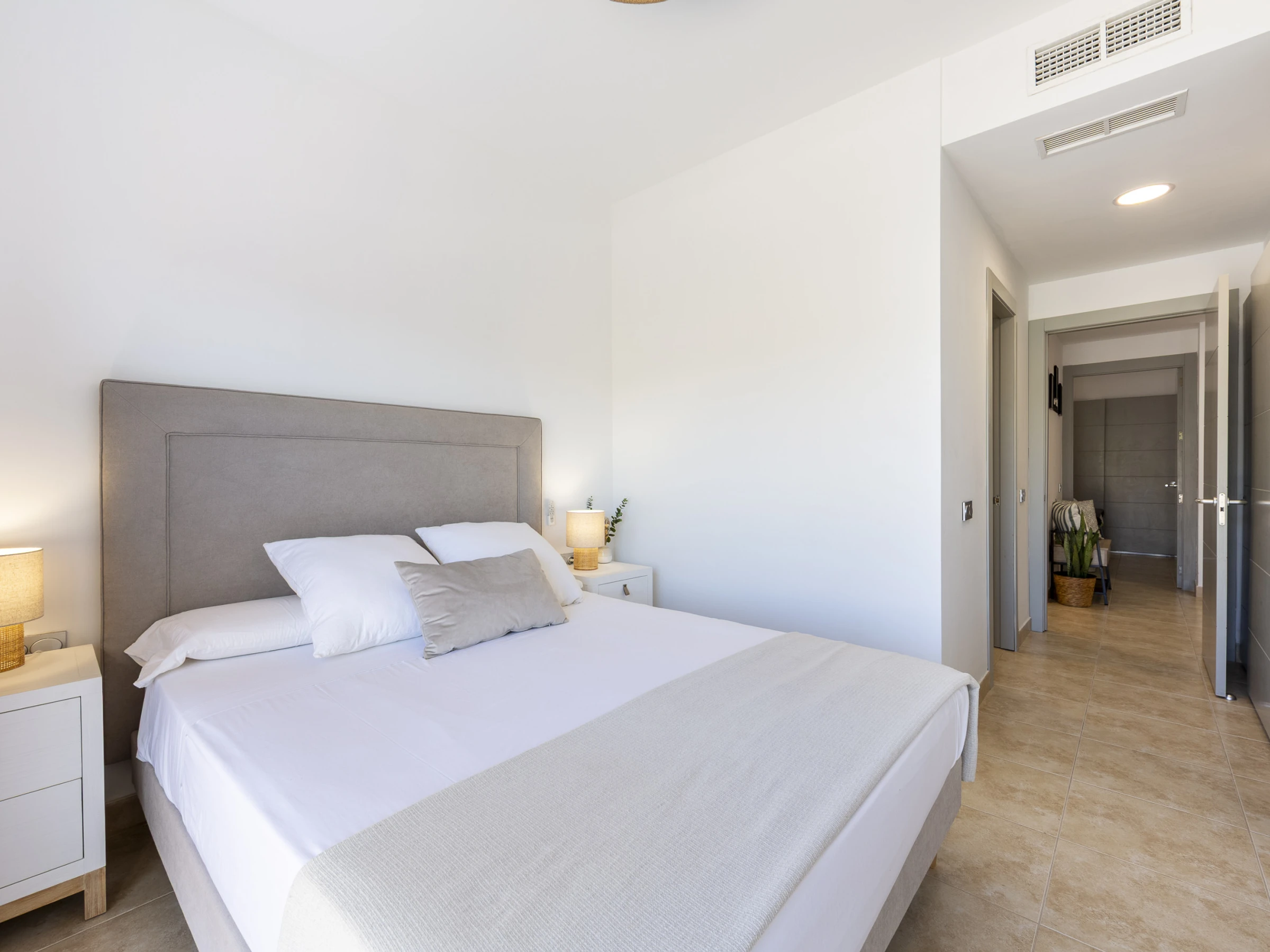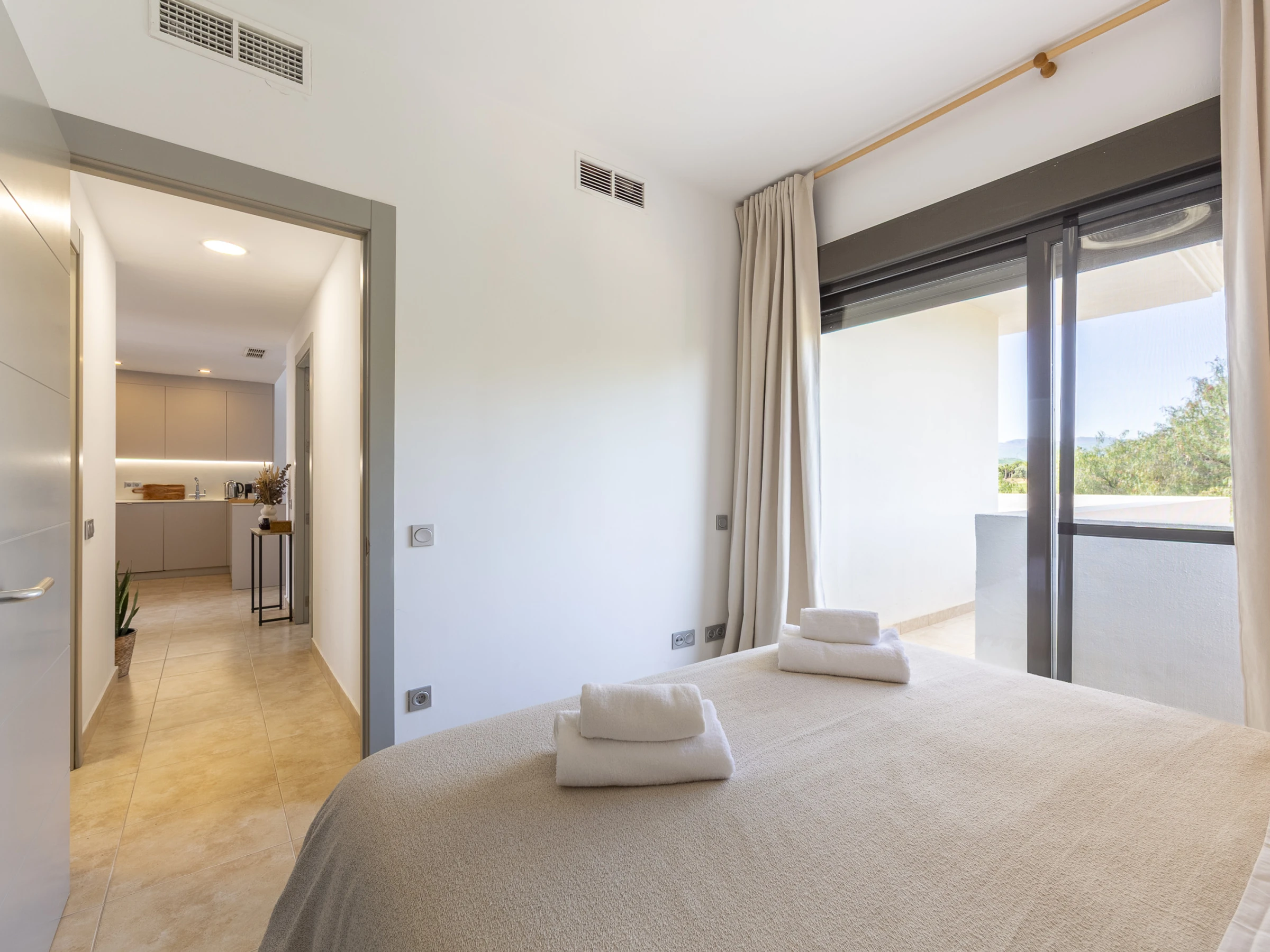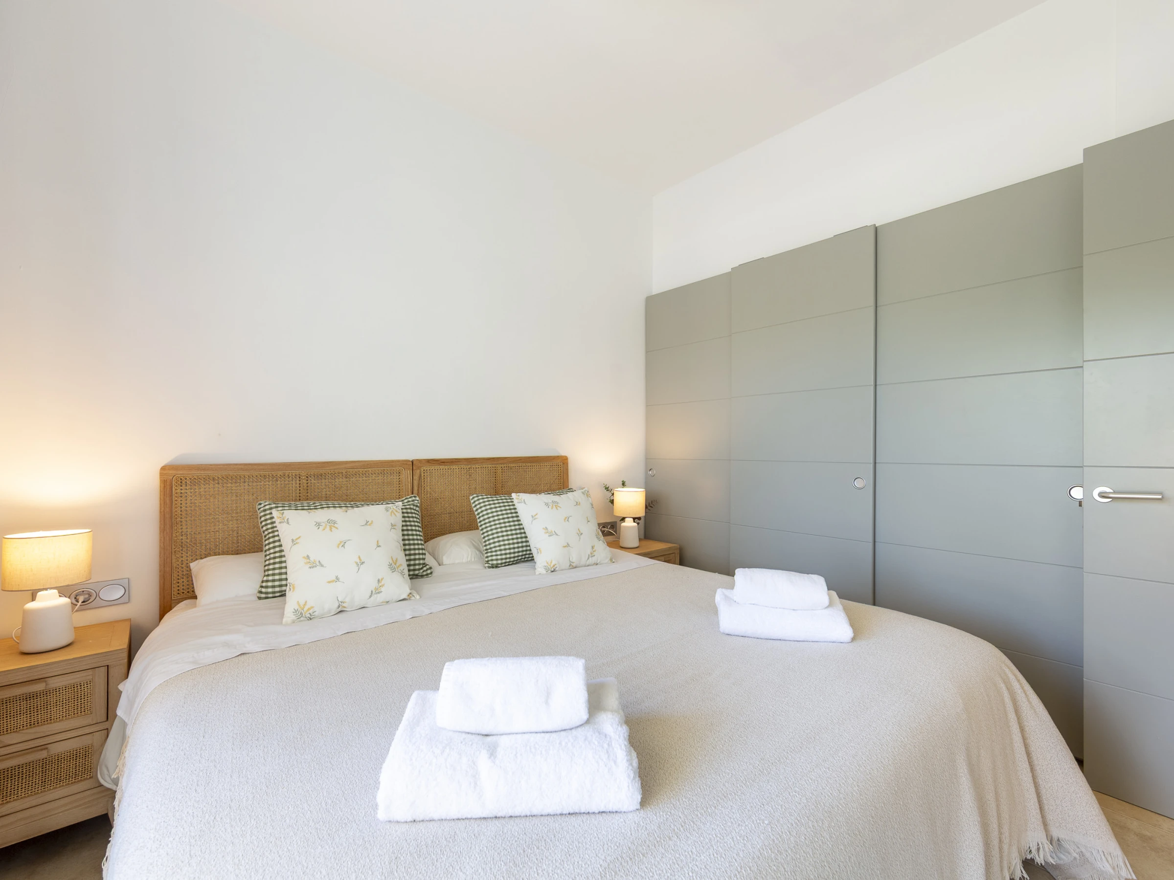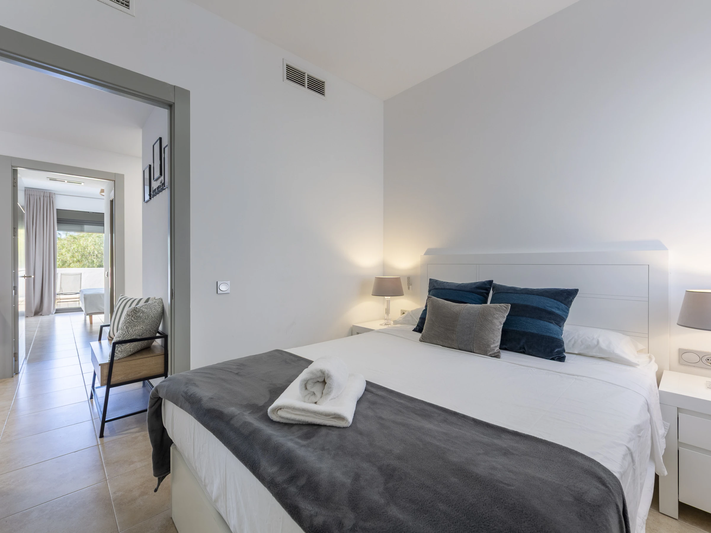 El apartamento cuenta con tres dormitorios elegantemente distribuidos: uno con cama doble, otro con cama king size y un tercero con cama queen size, garantizando un descanso reparador para todos los huéspedes. Dos baños con ducha completan la zona de dormitorios, proporcionando privacidad y comodidad.