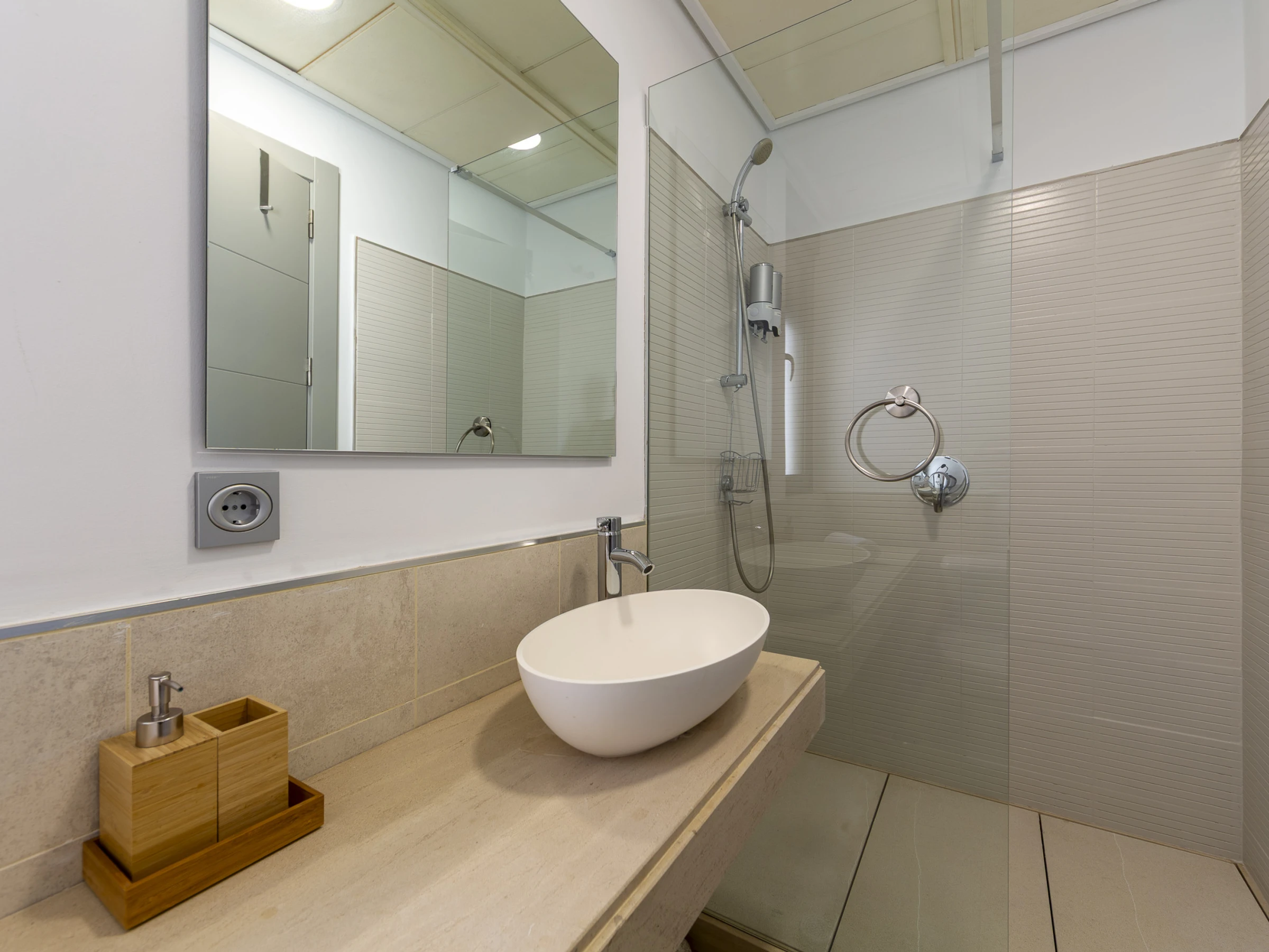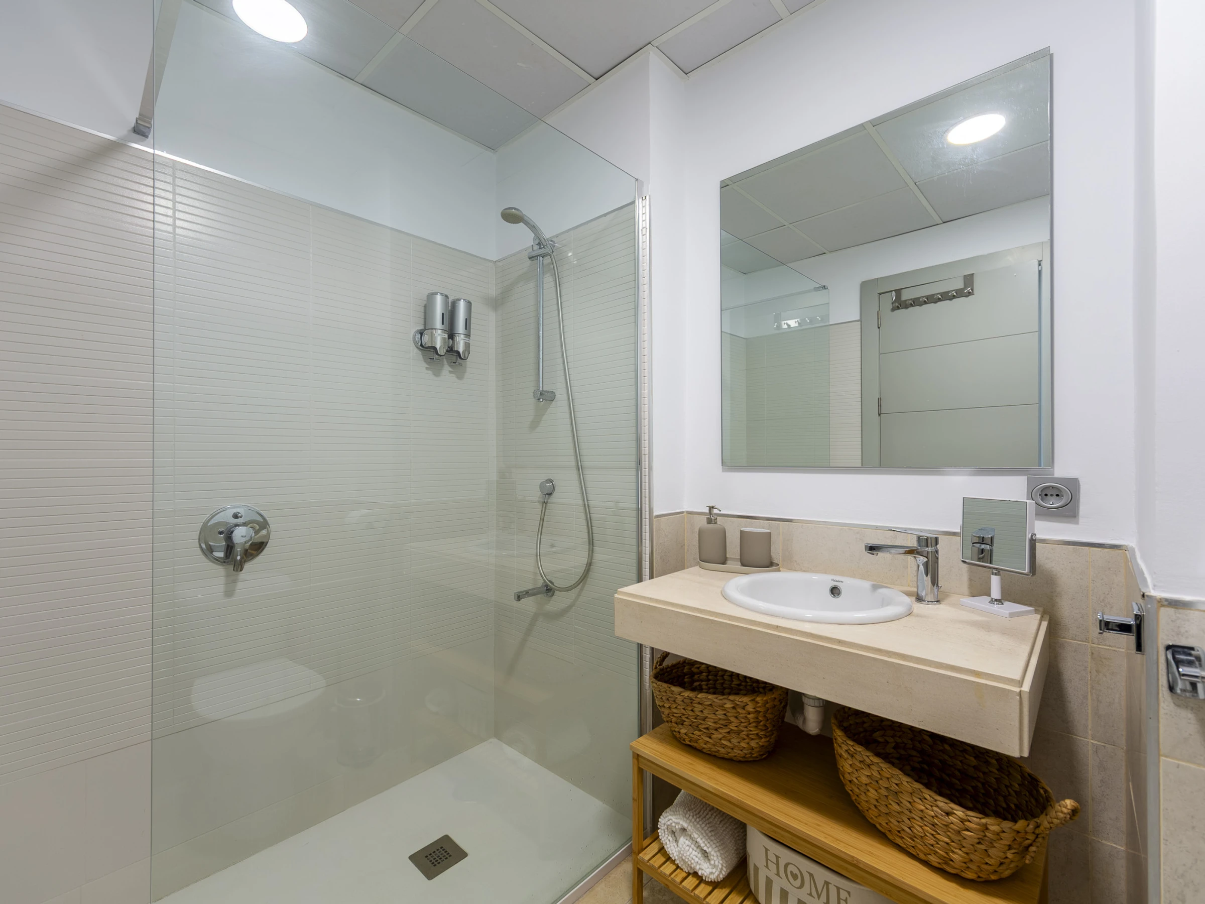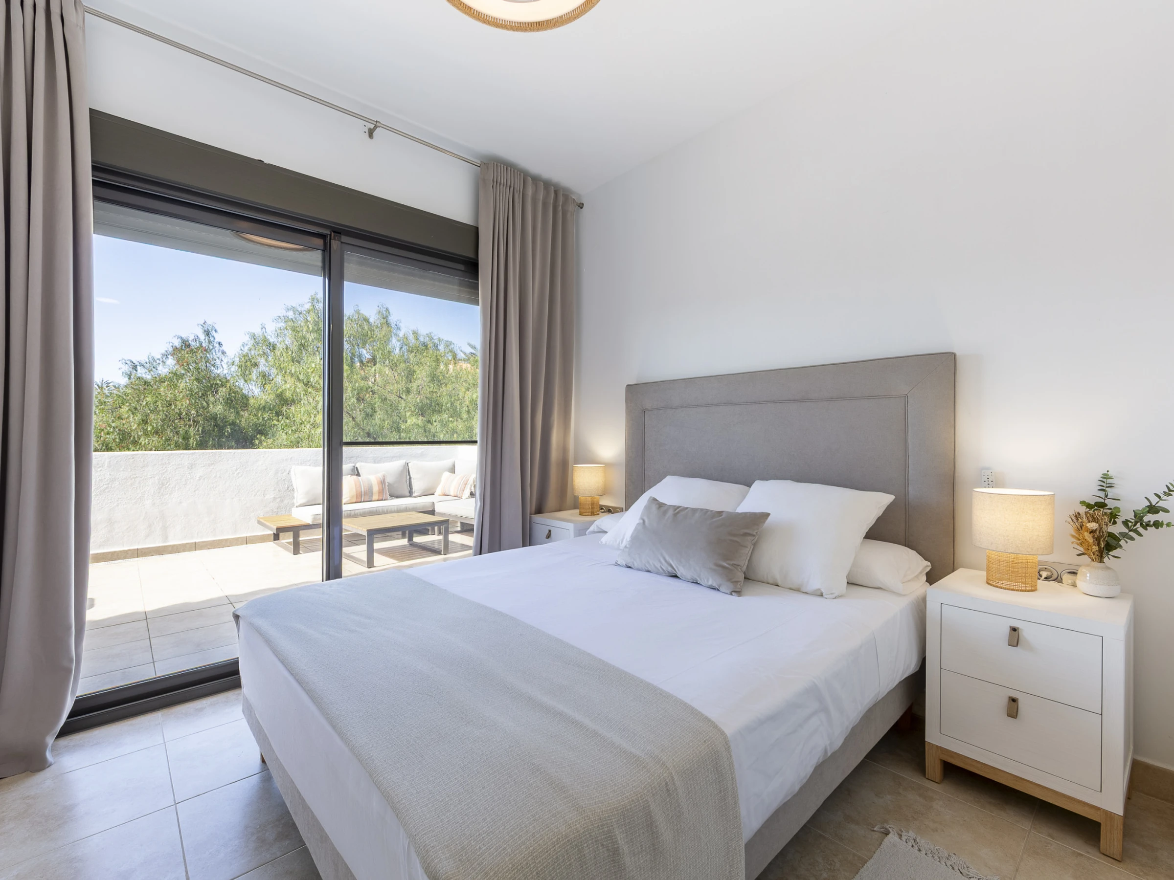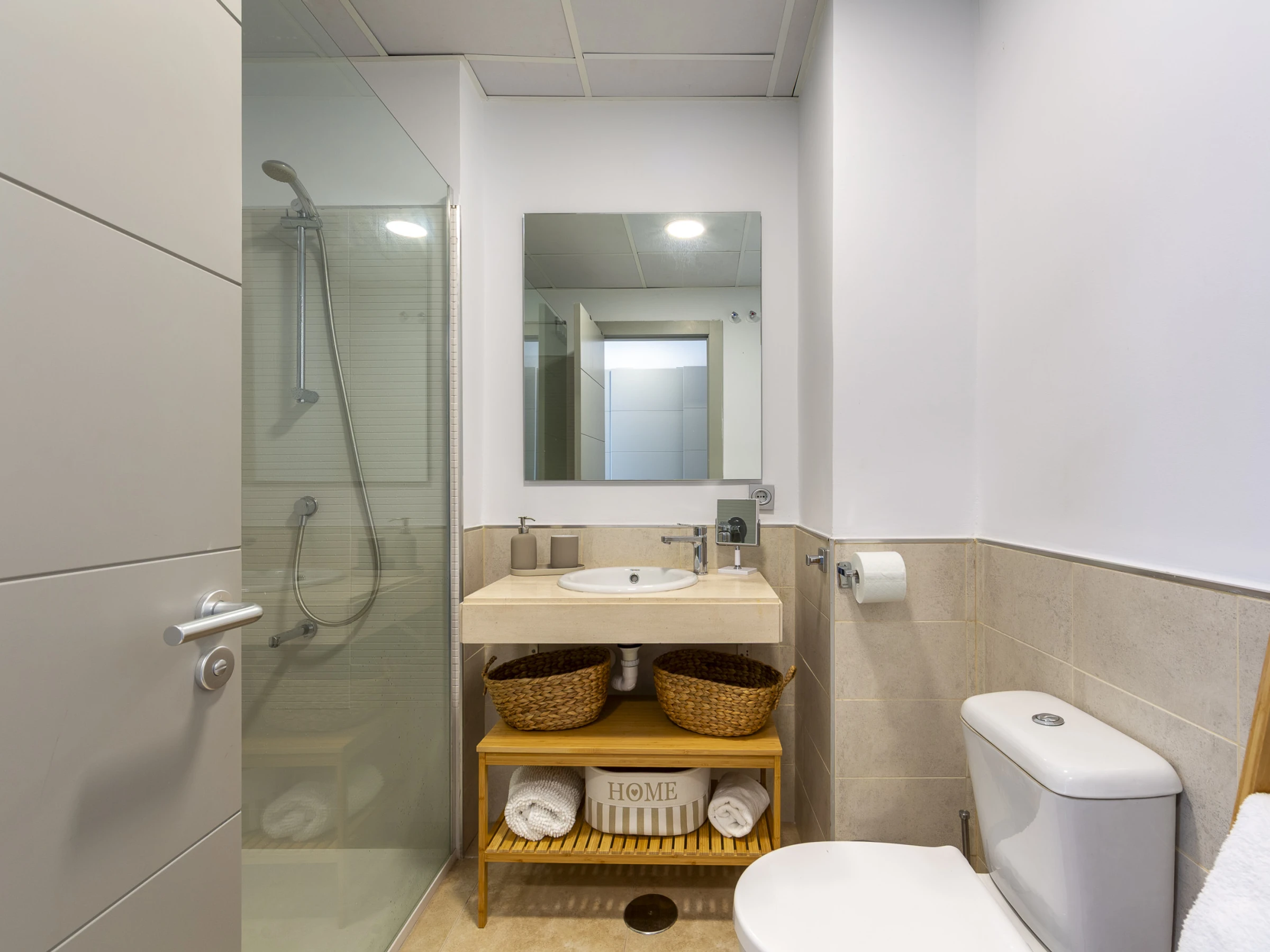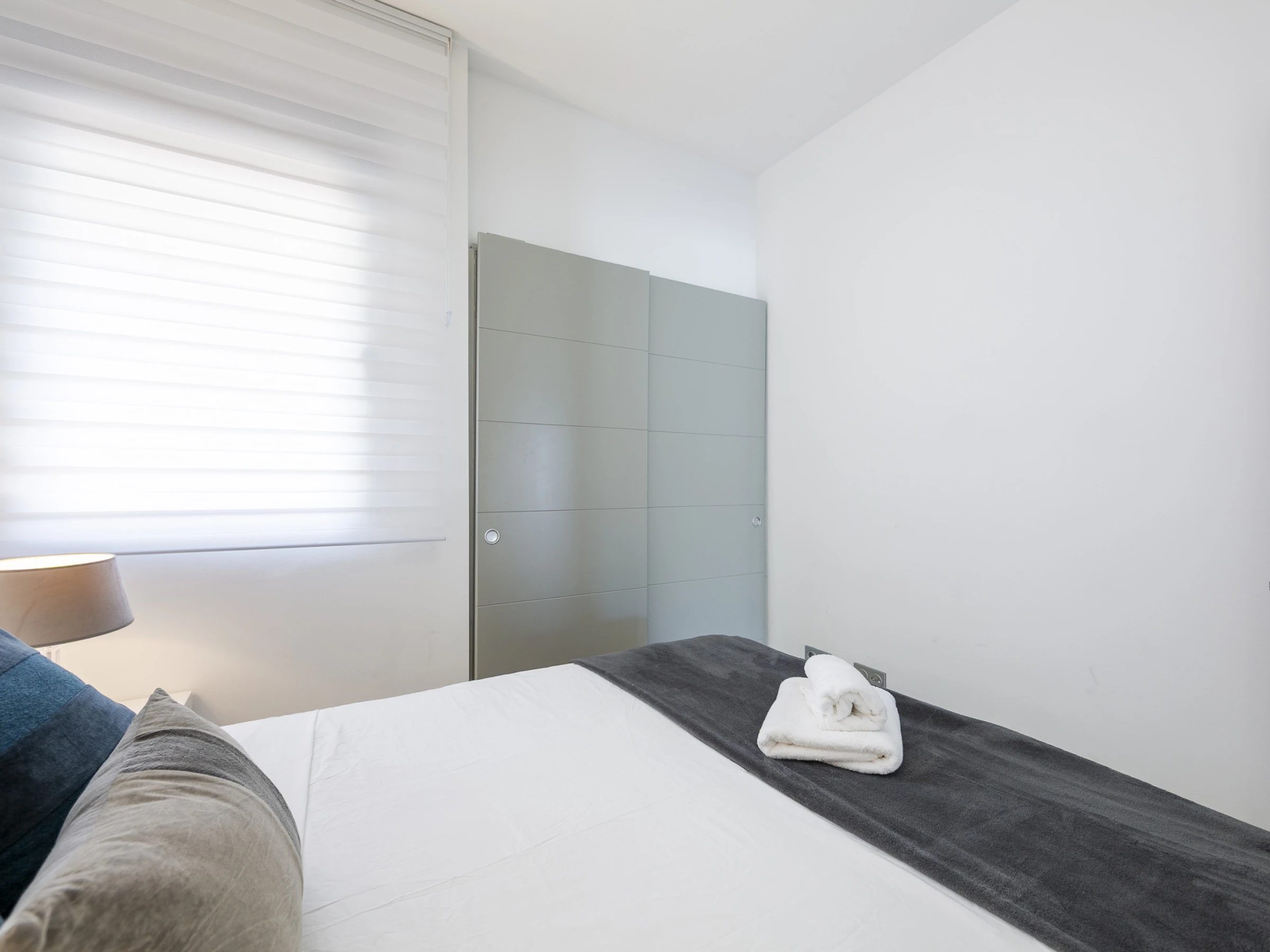 El apartamento cuenta con tres dormitorios elegantemente distribuidos: uno con cama doble, otro con cama king size y un tercero con cama queen size, garantizando un descanso reparador para todos los huéspedes. Dos baños con ducha completan la zona de dormitorios, proporcionando privacidad y comodidad.