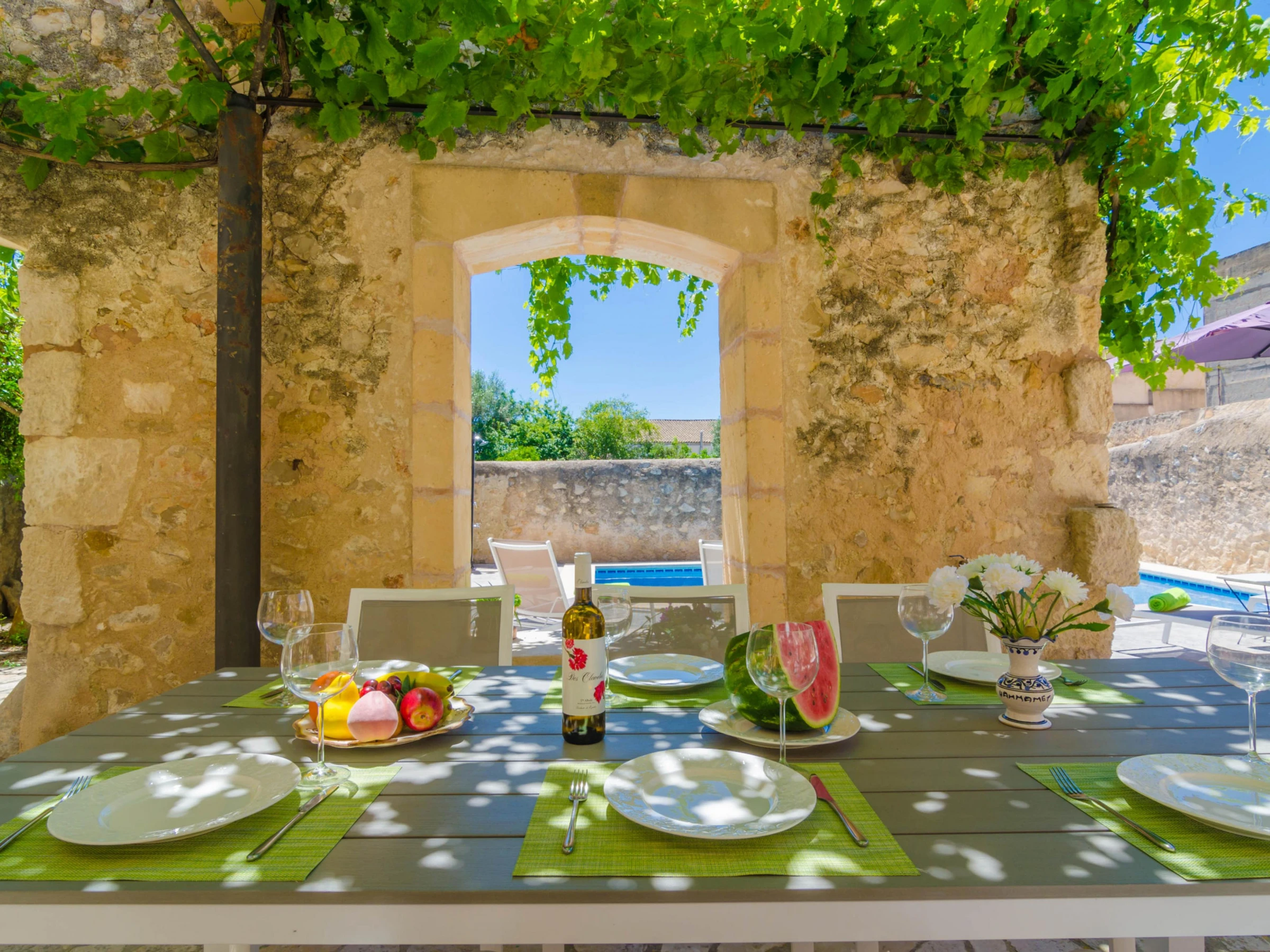 Esta rústica casa con piscina privada se encuentra en el pueblo de Vilafranca de Bonany y ofrece espacio para 6 a 8 huéspedes.
