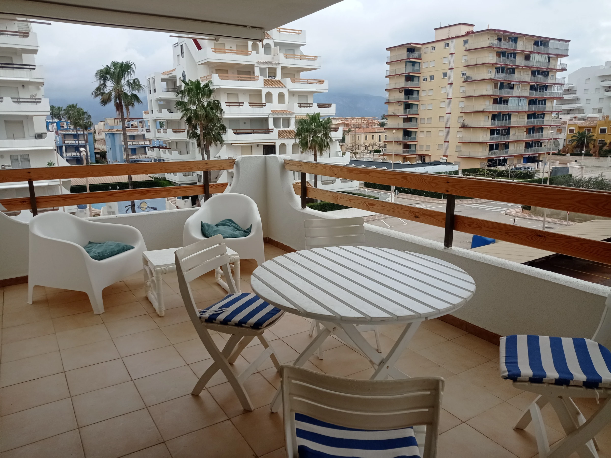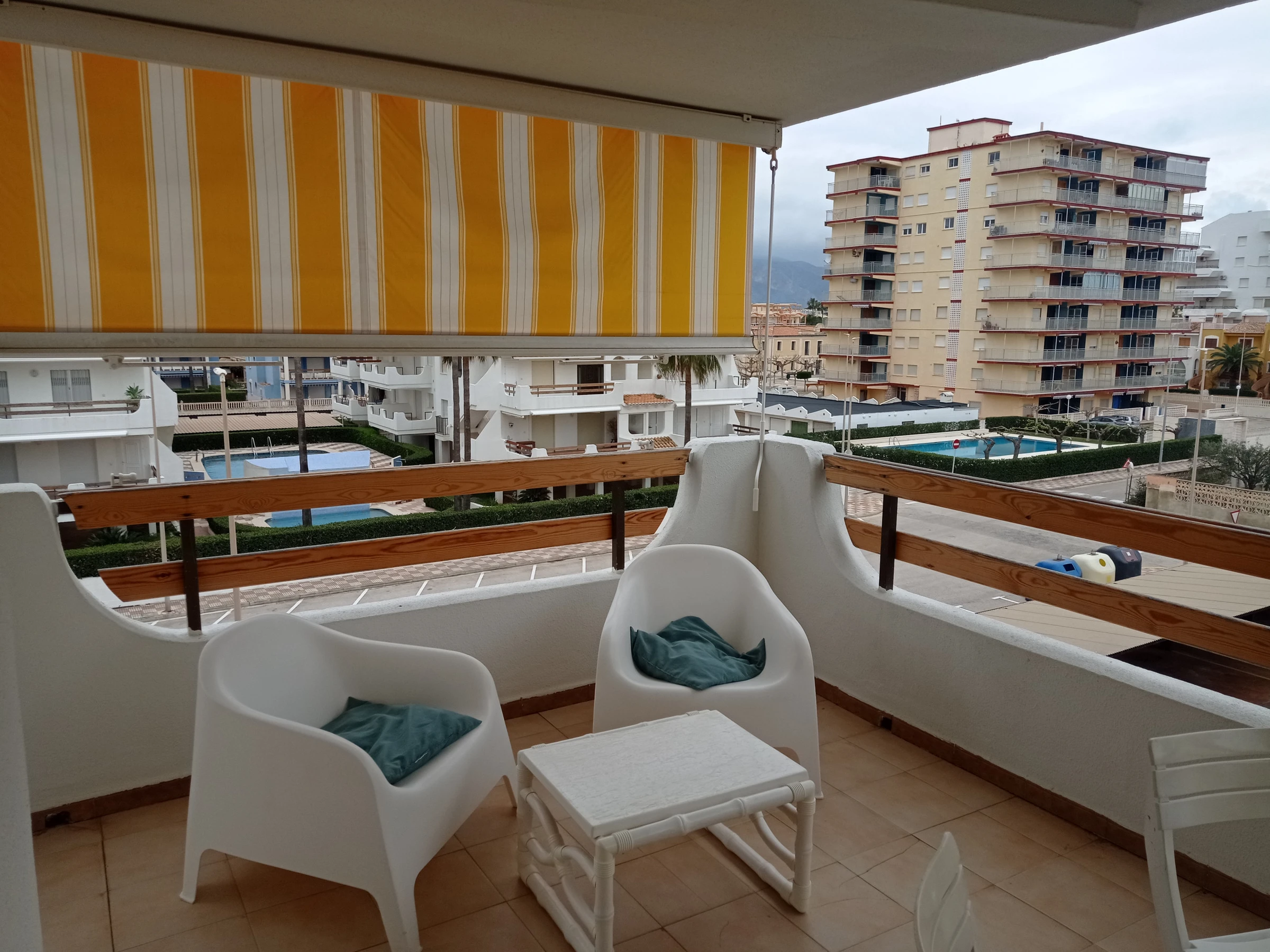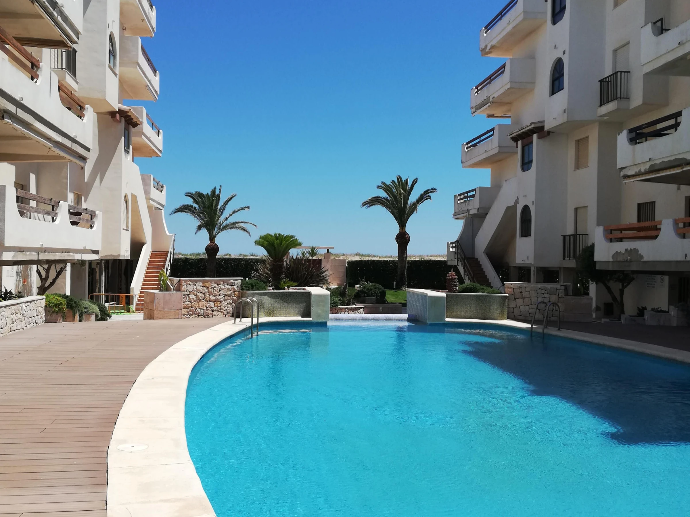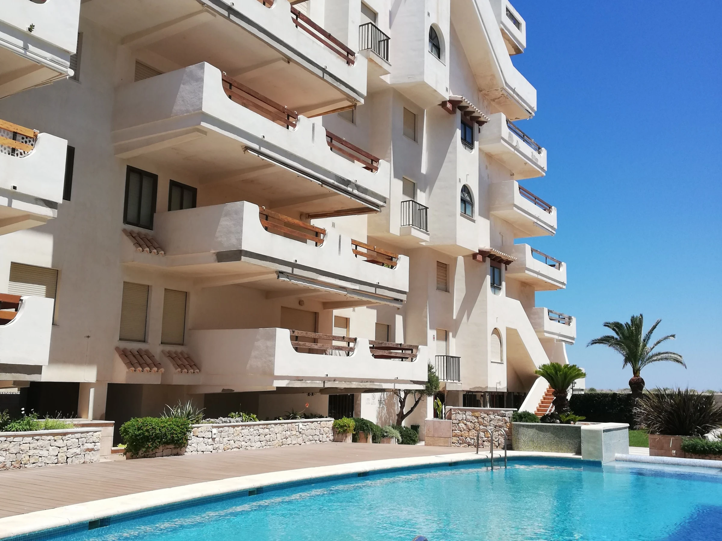 Apartamento en tercera planta con ascensor. Tiene dos dormitorios, dos baños (ambos con bañera), cocina independiente y amplio salón comedor con salida a una gran terraza con toldos, de orientación Norte (fresca) con vistas al mar, a la piscina y a las zonas comunes del complejo. Incluye plaza de aparcamiento
