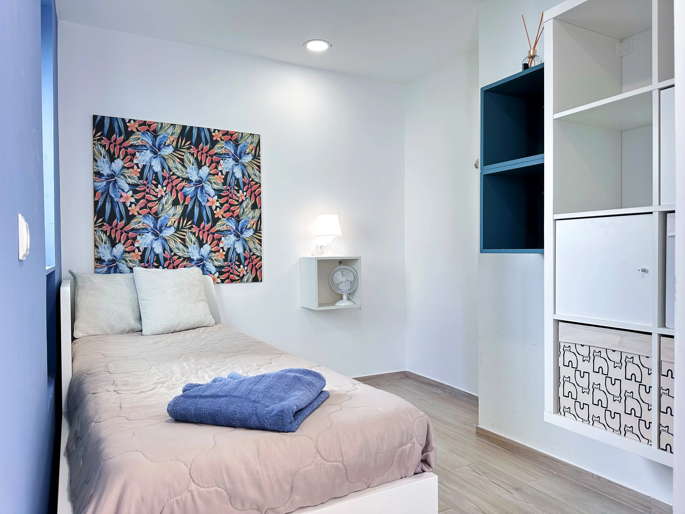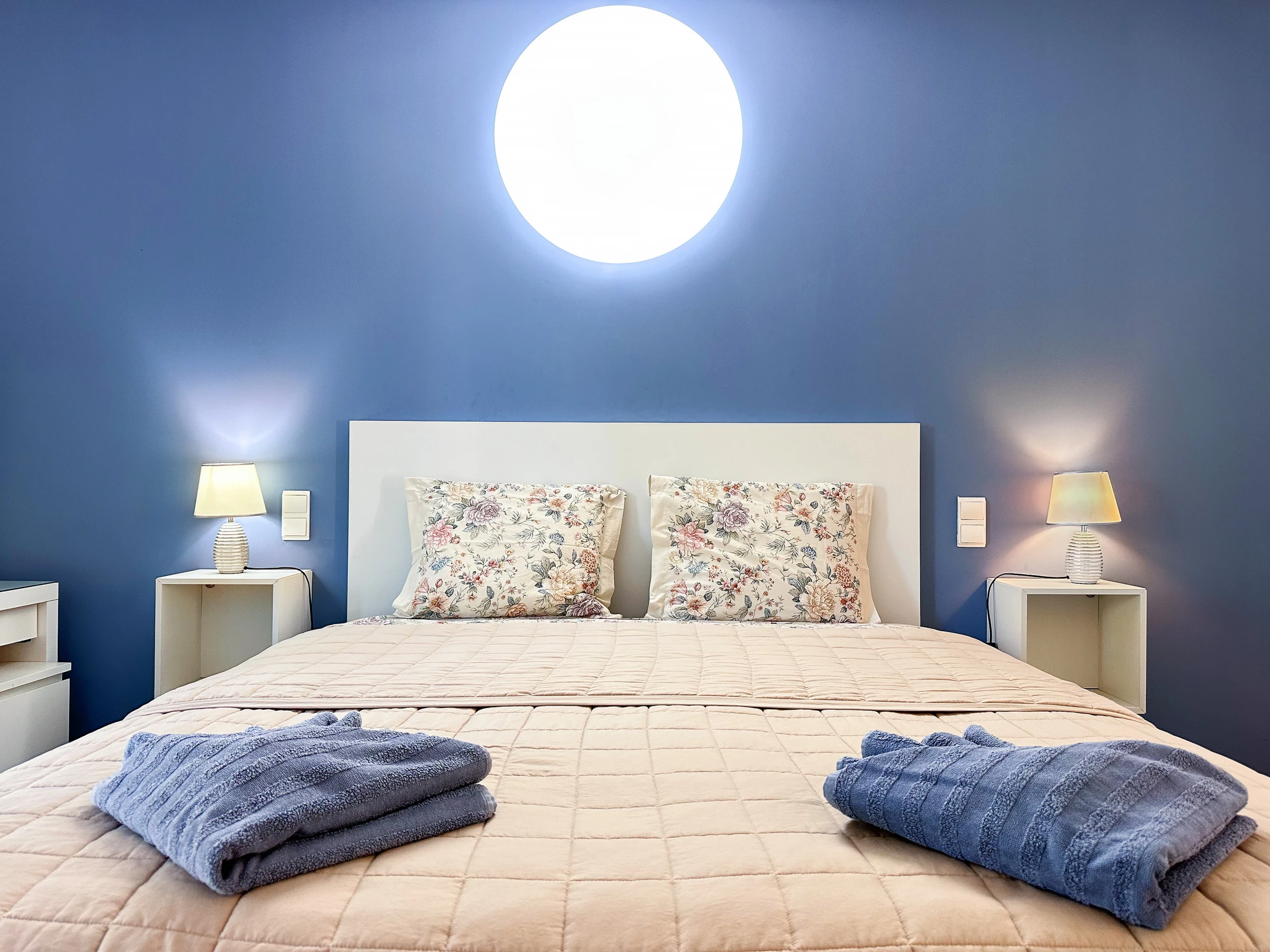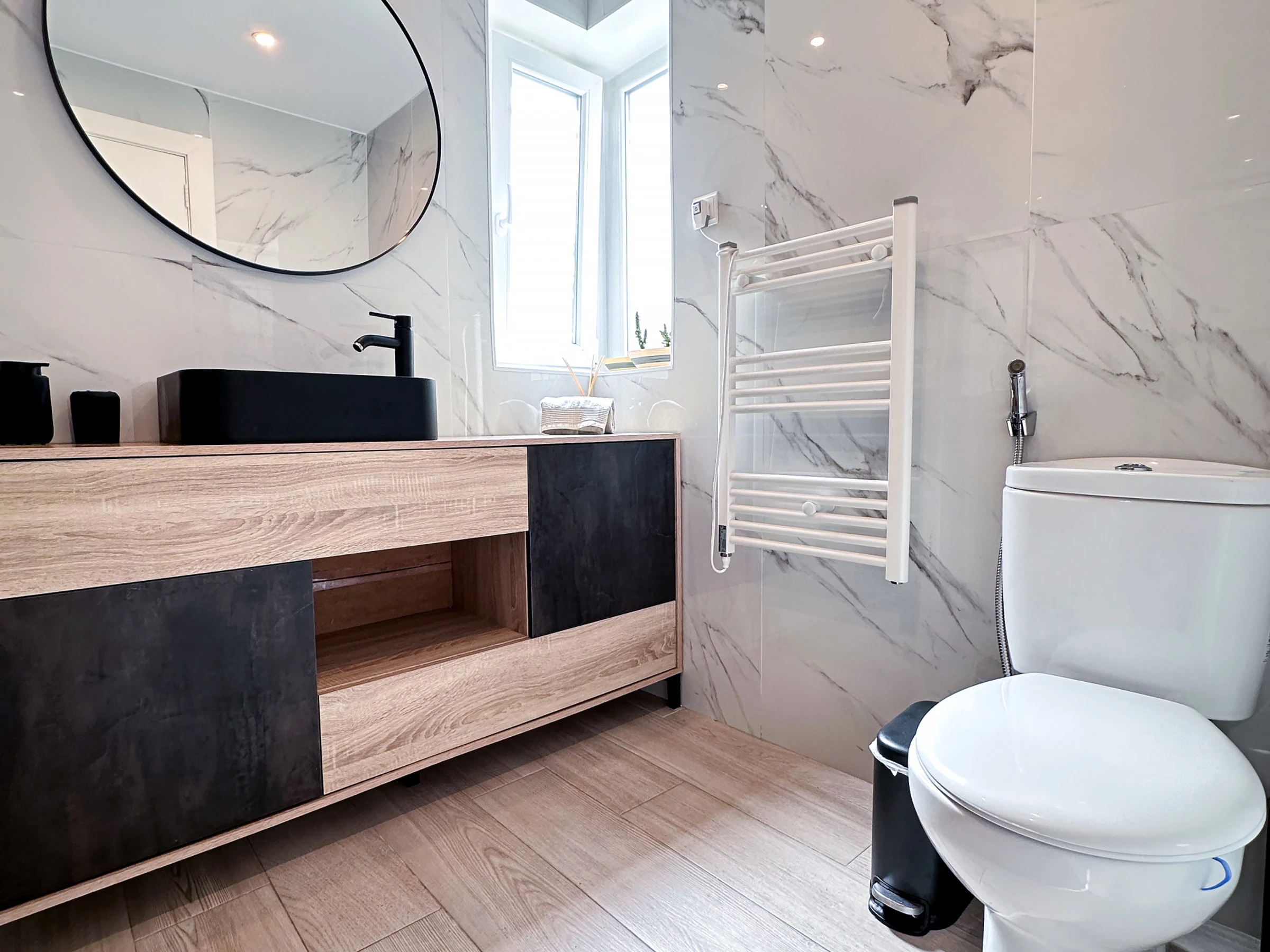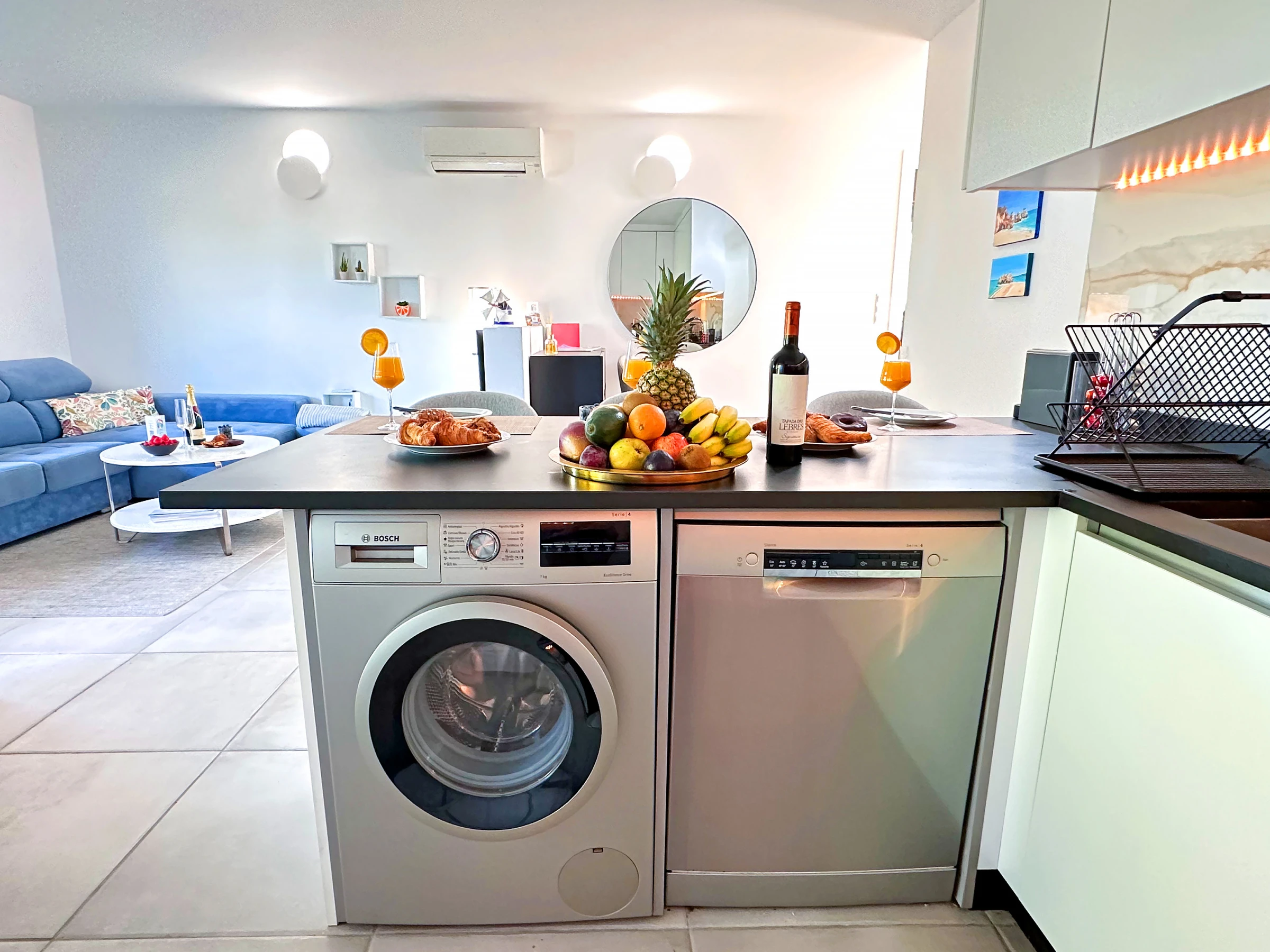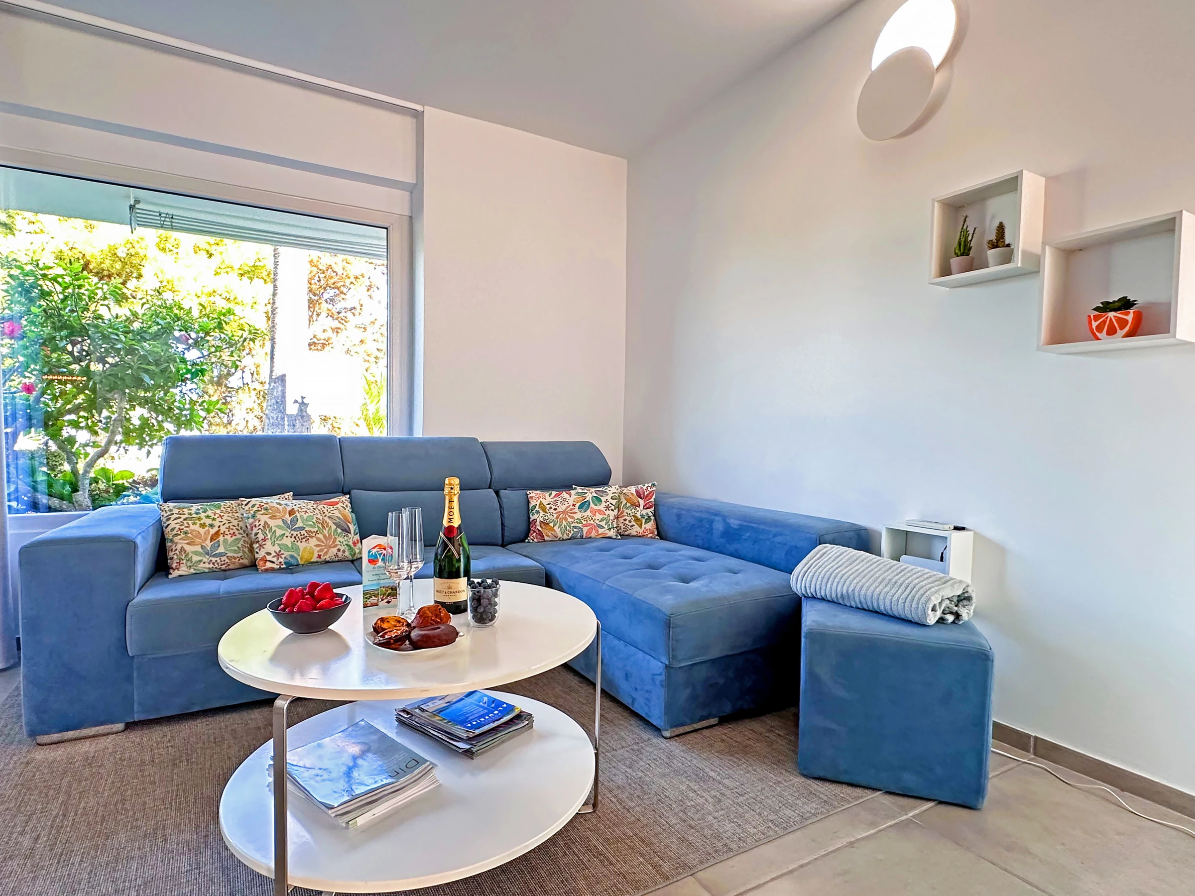 L'entrée privée du rez-de-chaussée mène à un salon, une salle à manger et une cuisine entièrement équipée spacieux et ouverts. La grande zone de vie comprend une télévision, un canapé et des portes-fenêtres donnant sur une terrasse avec un espace de repos. Chambre avec un lit double, une télévision et des portes-fenêtres offrant une vue relaxante sur la vieille ville. La salle de bain comprend une grande douche avec un accès direct, un meuble double vasque. La deuxième chambre dispose d'un lit simple.