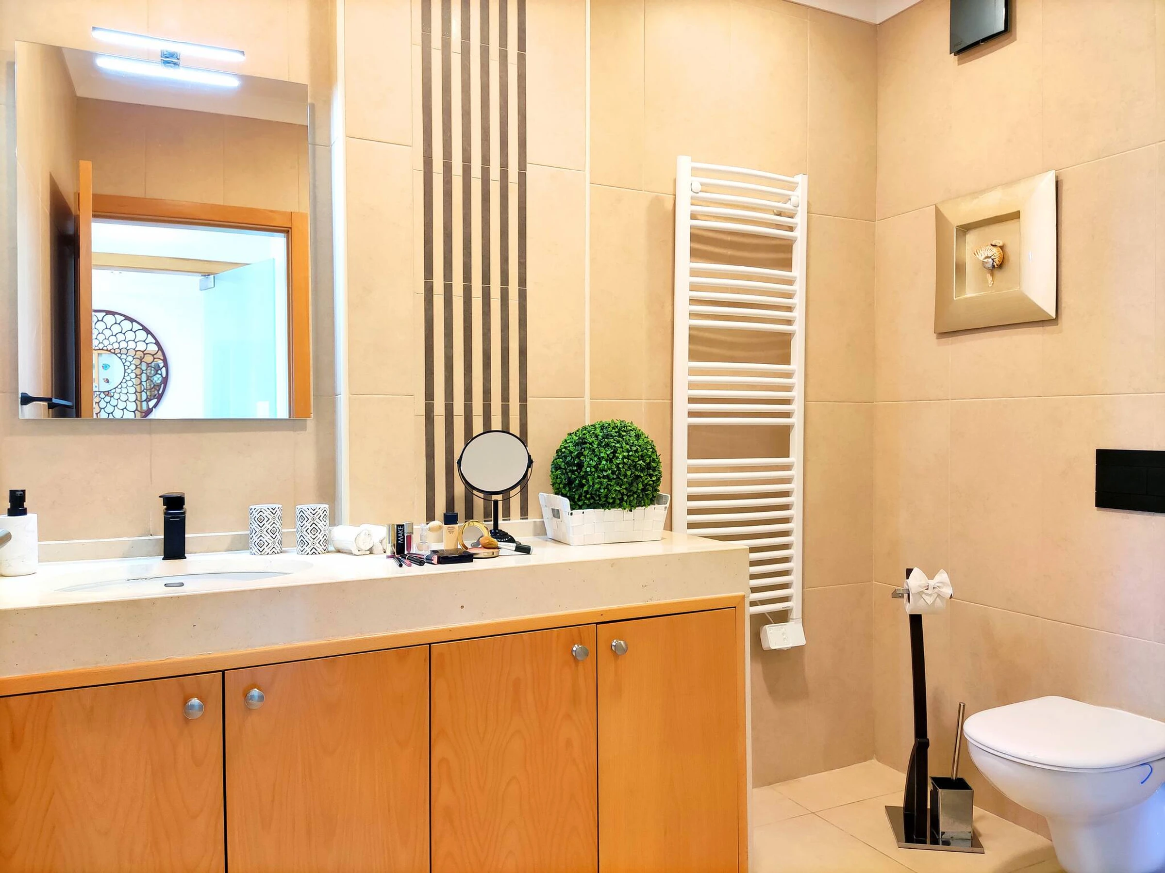 La salle de bain est spacieuse et équipée d'une douche de bien-être et d'un bidet. La cuisine est parfaitement équipée de tout ce dont vous avez besoin pour préparer vos repas, collations ou cocktails inspirés de la mer, y compris une machine Nespresso. Le balcon dispose d'une table de bar pour que vous puissiez manger ou boire tout en observant les piétons passer en dessous ou simplement vous détendre sur l'un des transats et regarder l'océan en souhaitant que ce rêve ne se termine pas :-)