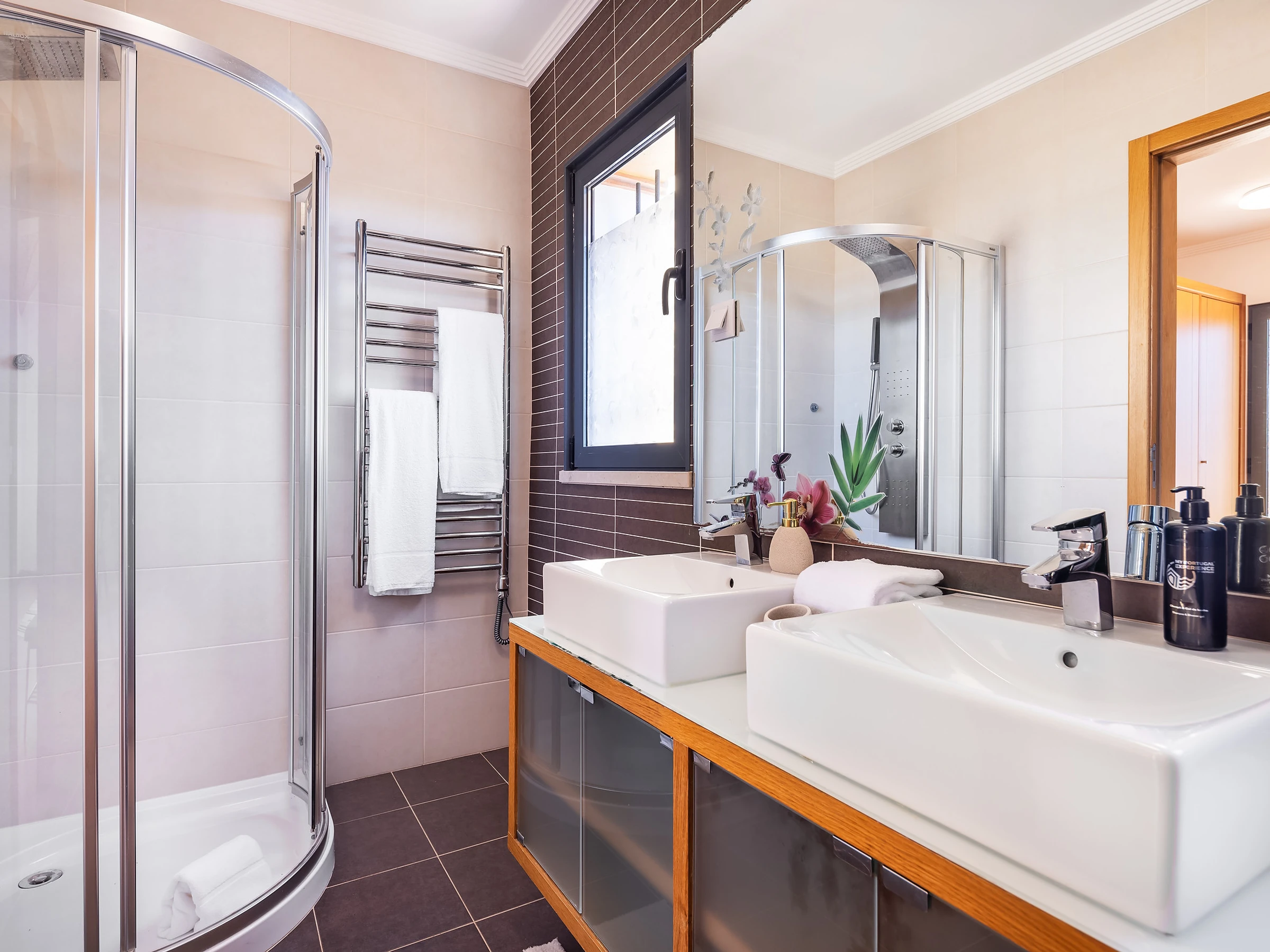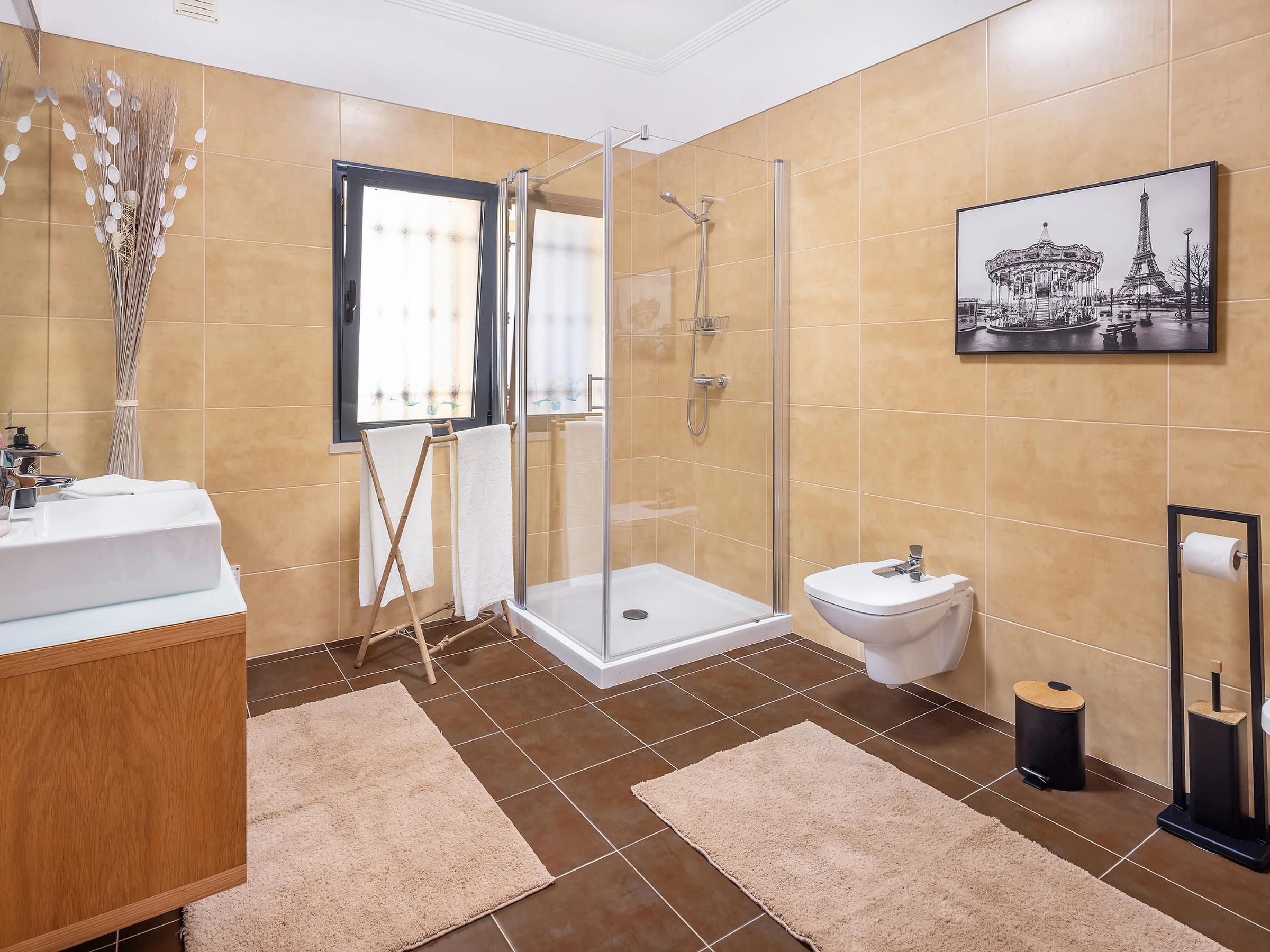 La propriété dispose de 5 chambres bien équipées, avec un total de 8 lits (2 lits doubles et 6 lits individuels), garantissant des nuits paisibles pour tous les invités. Les 4 salles de bains — 2 avec douche et 2 avec baignoire — assurent la praticité et le confort tout au long du séjour.