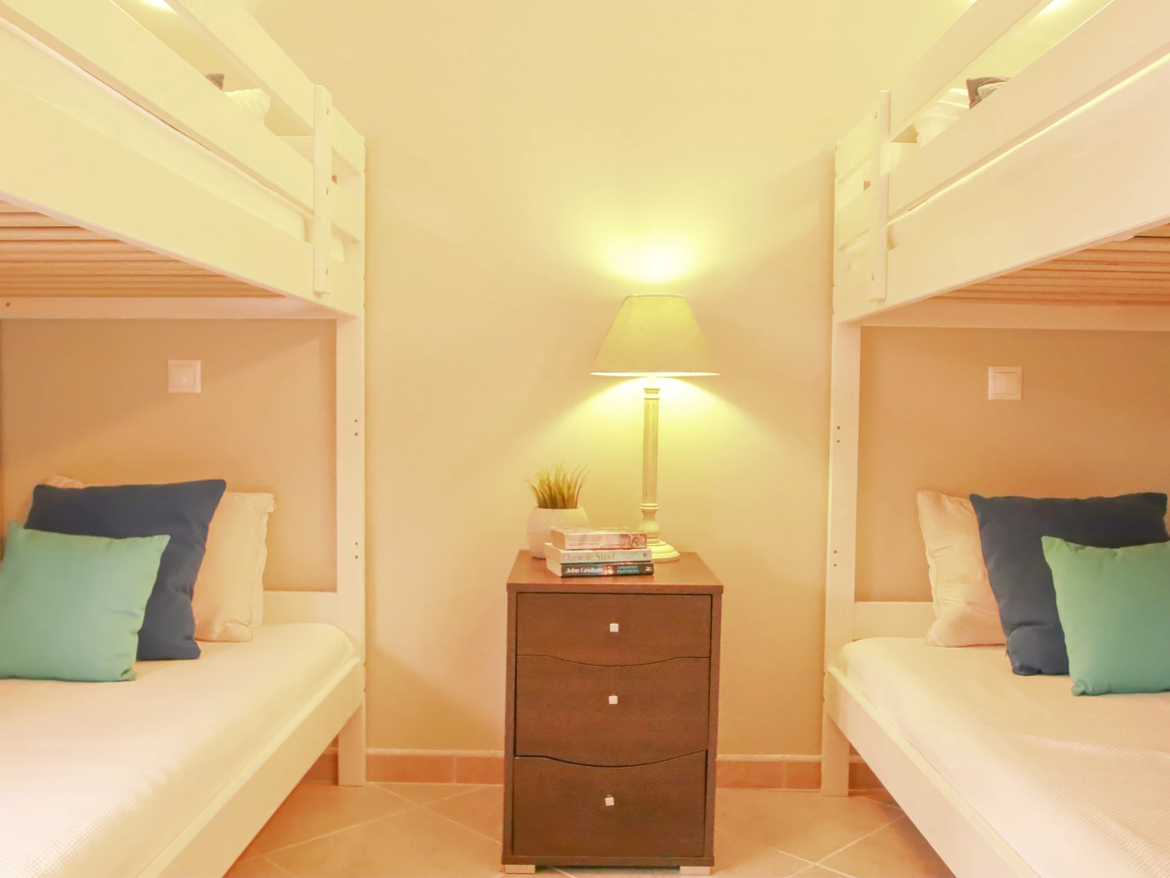 Le grand salon et salle à manger, avec un accès direct à l'extérieur, offre un espace lumineux et confortable pour des moments de convivialité et de détente. Au rez-de-chaussée se trouvent deux chambres, toutes deux avec salle de bain privative, l'une avec un lit double et l'autre avec deux lits superposés, ainsi qu'une pratique salle de bain de service.