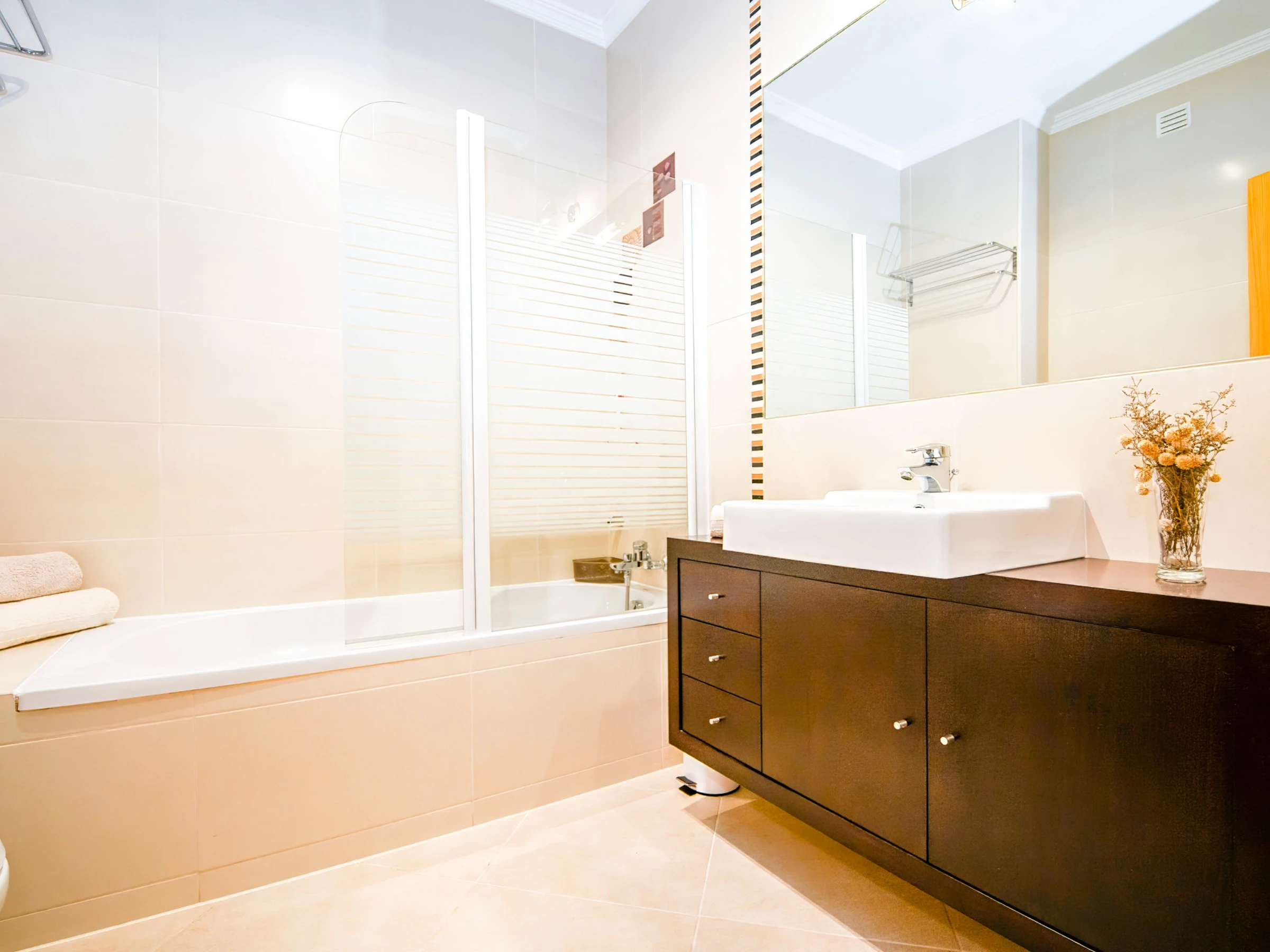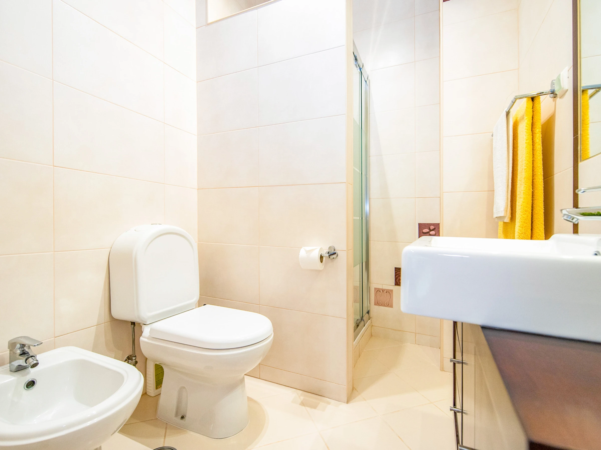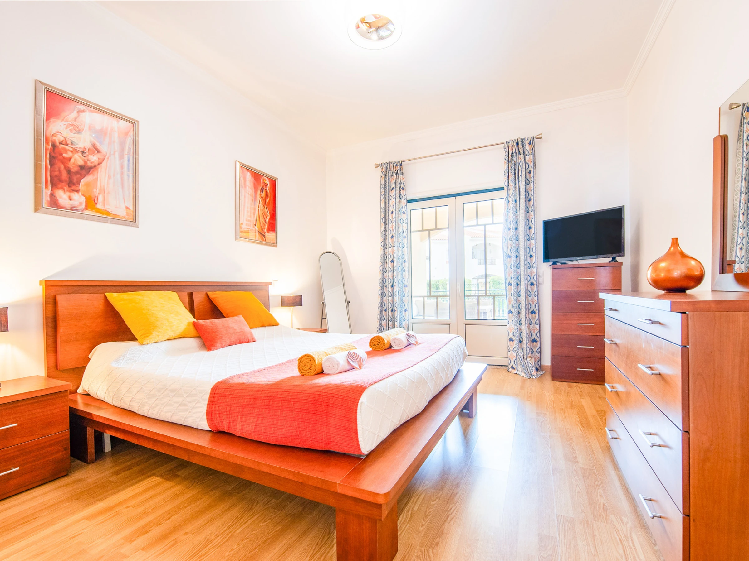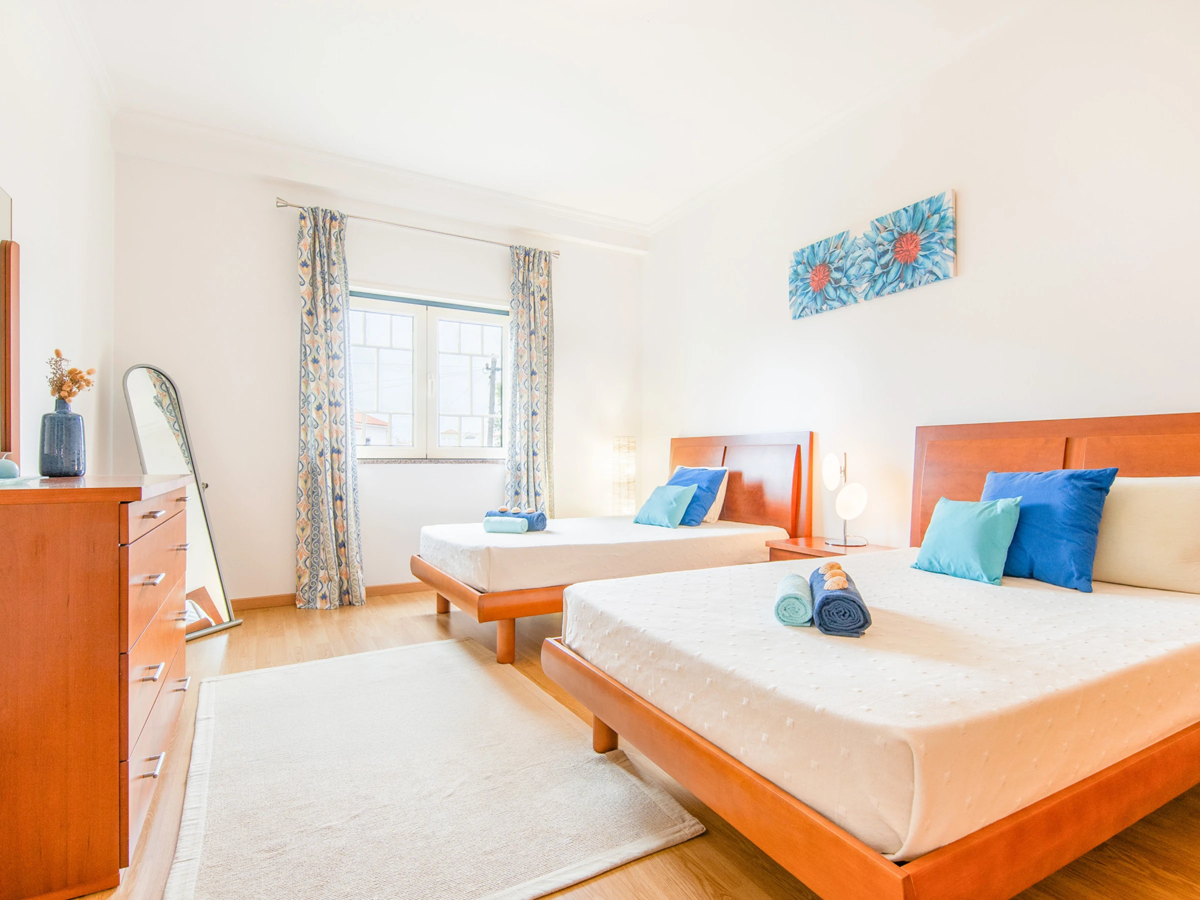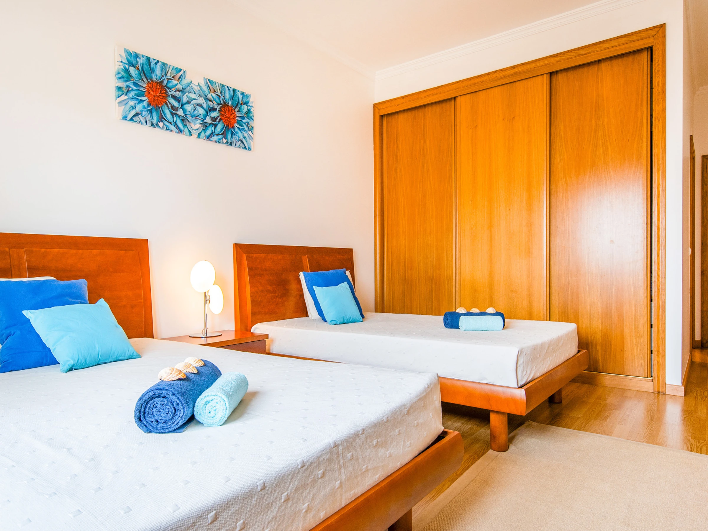 L'appartement dispose de deux chambres. Une chambre avec un lit double en suite avec salle de bain et baignoire, et une deuxième chambre avec deux lits individuels. Il y a également une salle de bain supplémentaire avec douche, garantissant plus de commodité pendant le séjour.