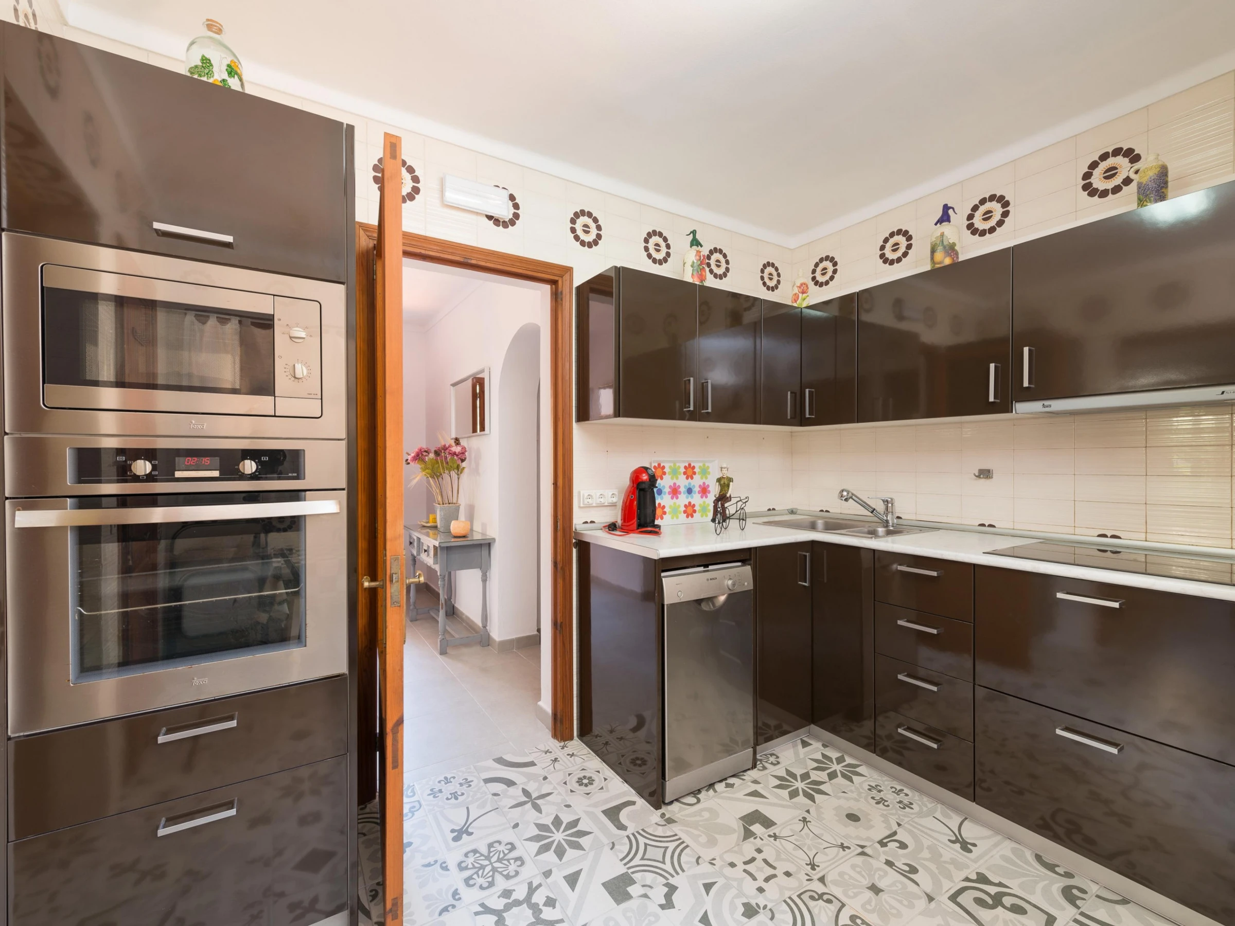 La cuisine, est équipée avec réfrigérateur, micro-ondes, four, congélateur, lave-vaisselle, cafetière et grille pain.