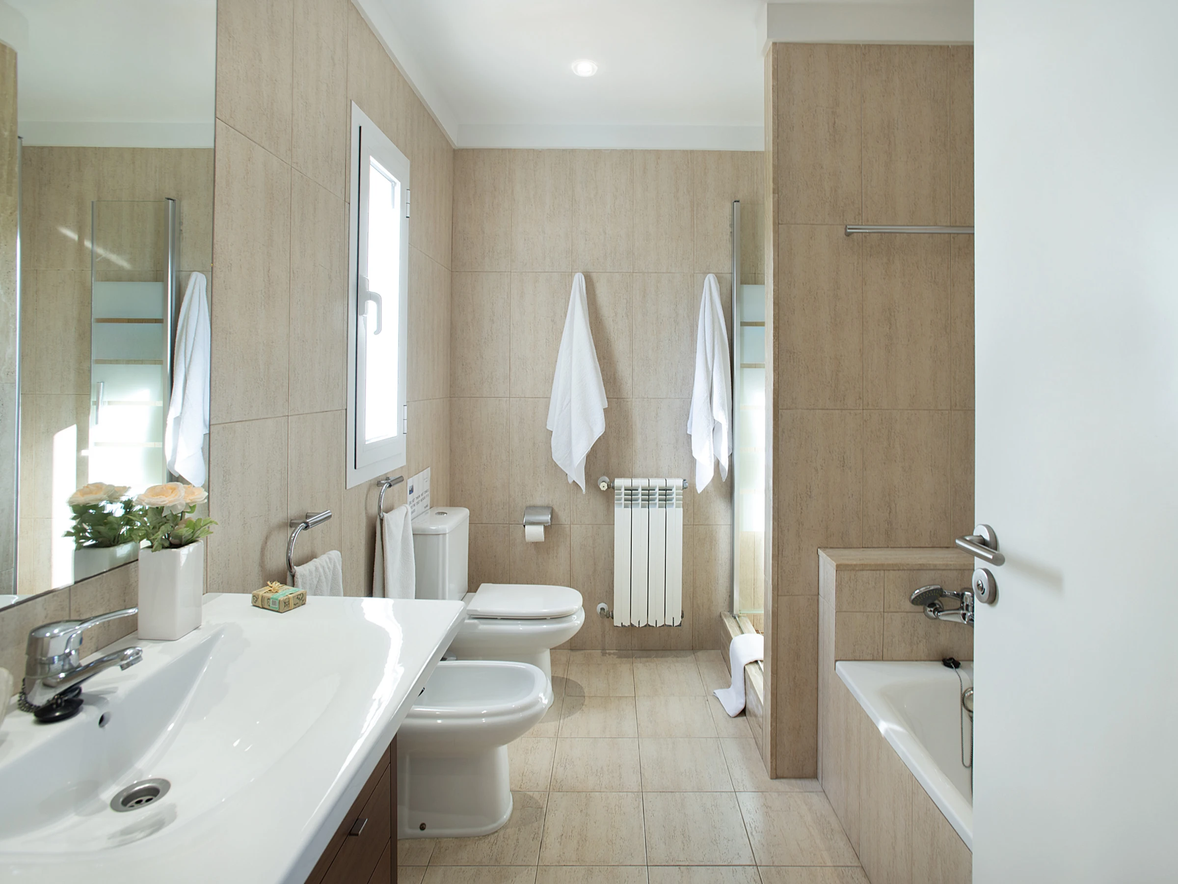 À l’étage se trouvent trois chambres : une avec lit double et salle de bain en suite avec baignoire et douche séparées, une autre avec deux lits simples, et une troisième avec deux lits simples plus un lit d’appoint, idéale pour les familles avec enfants. À ce niveau se trouve également une deuxième salle de bain complète avec baignoire et douche séparées.