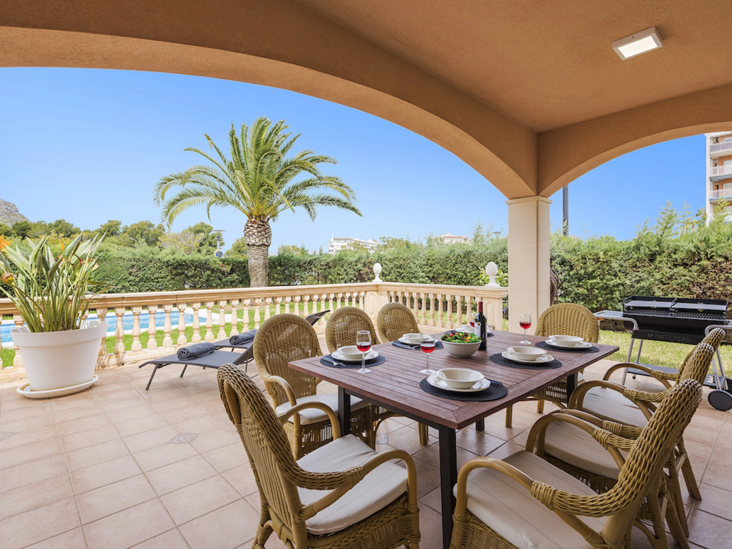 Elle dispose de jardin, mobilier de jardin, clôture, 3 m² de terrasse, lave-linge, barbecue, fer à repasser, coffre-fort, accès internet (wifi), sèche-cheveux, balcon, chauffage pompe à chaleur, climatisation dans tout le logement, piscine privée, parking extérieur bâtiment proche, 1 Télévision, tv satellite (Langues: Espagnol, Anglais, Allemand).